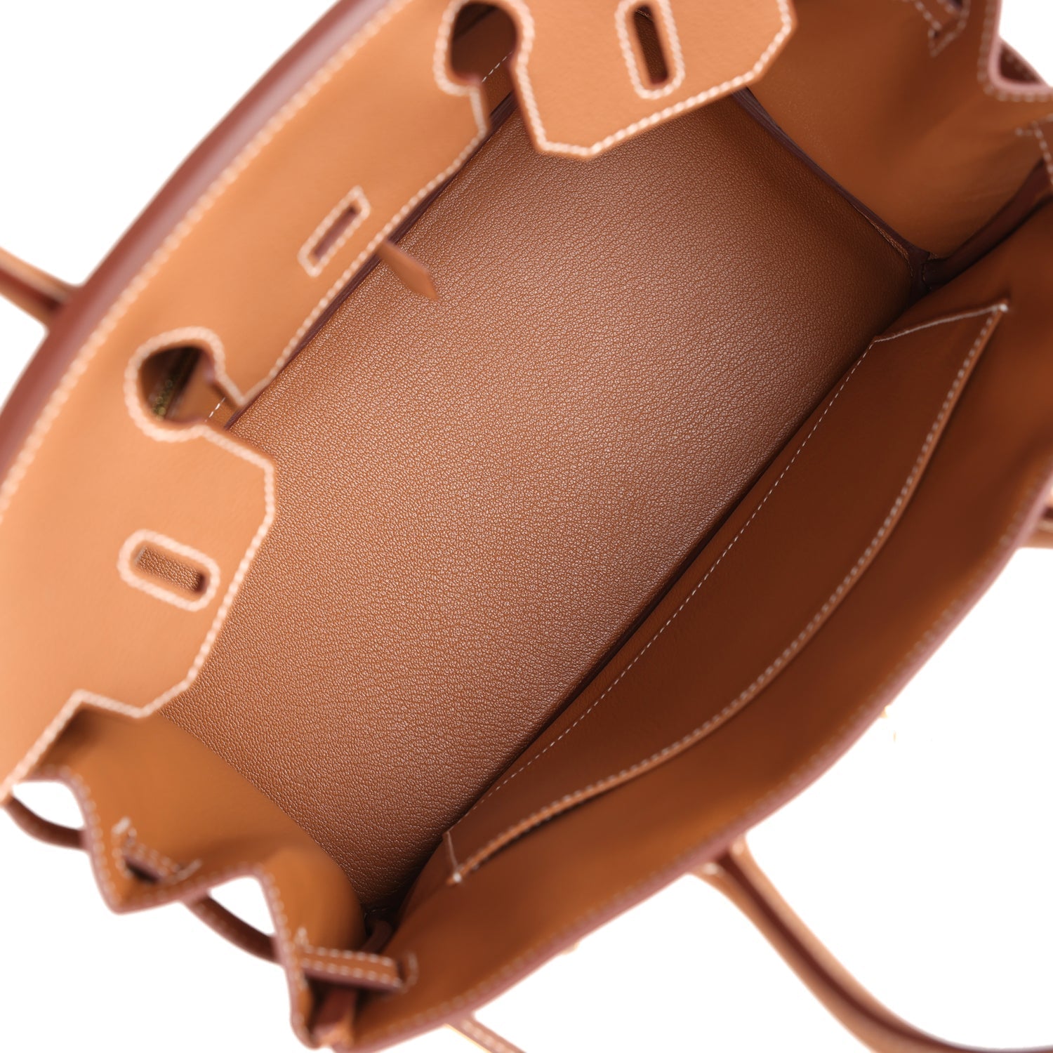 The interior is lined with Gold chevre and has one zip pocket with an Hermes engraved zipper pull and an open pocket on the opposite side.