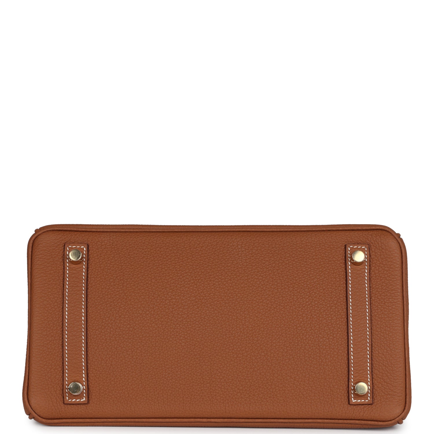 This Birkin is in Gold togo leather with gold hardware and has contrast stitching, front flap, two straps with center toggle closure, clochette with lock and two keys, and double rolled handles.