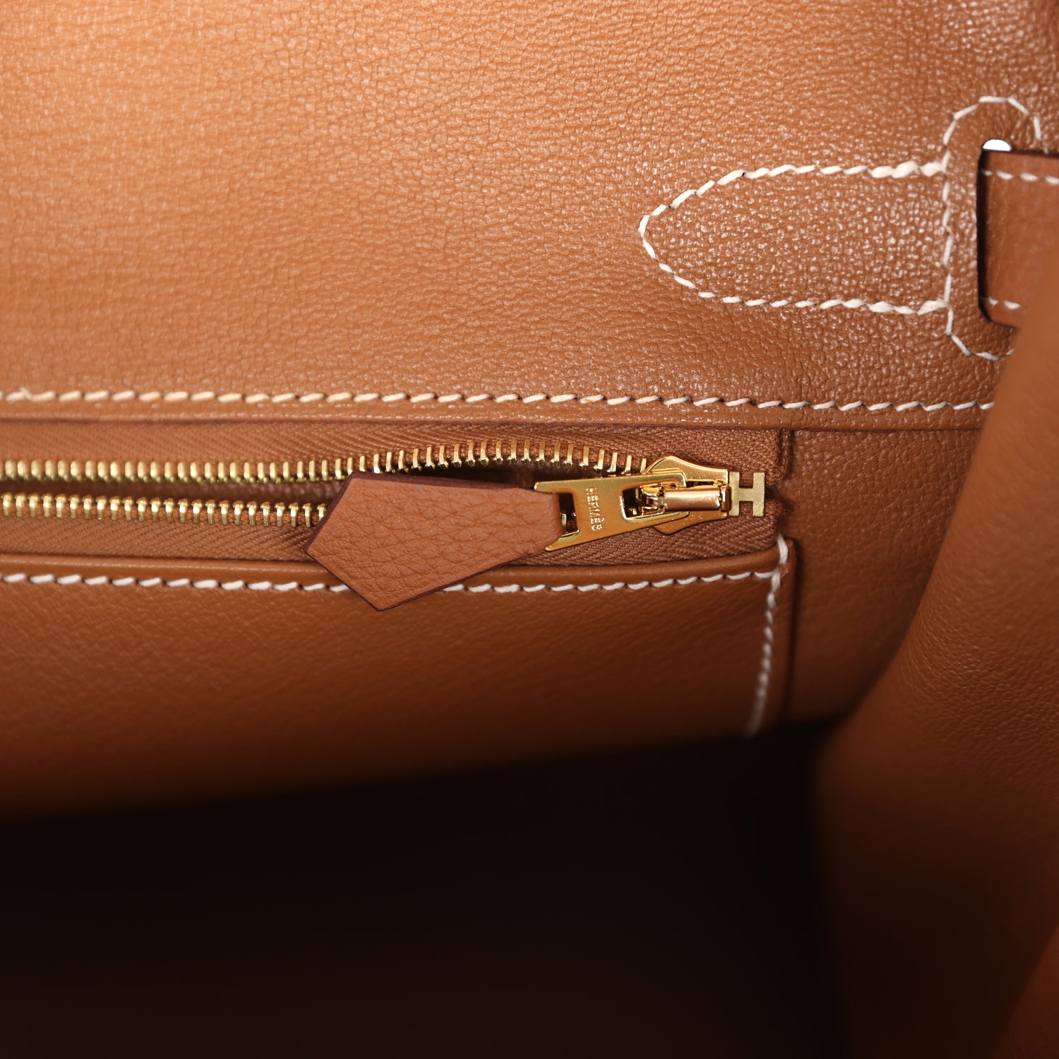 The interior is lined with Gold chevre and has one zip pocket with an Hermes engraved zipper pull and an open pocket on the opposite side.