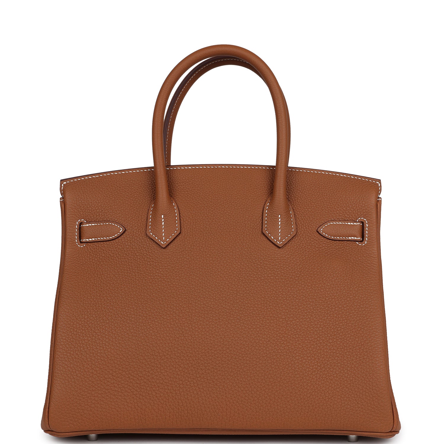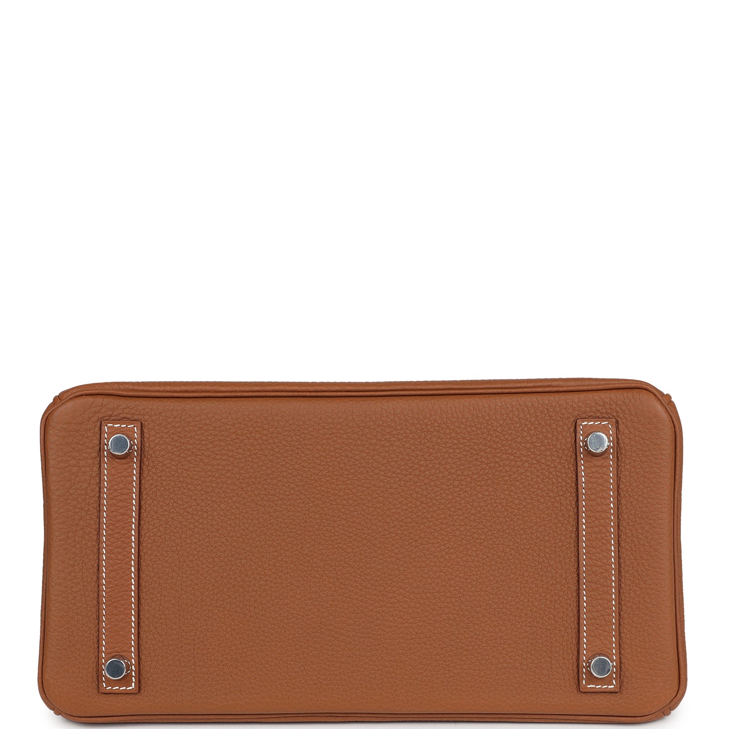 This Birkin is in Gold togo leather with palladium hardware and has contrast stitching, front flap, two straps with center toggle closure, clochette with lock and two keys, and double rolled handles.