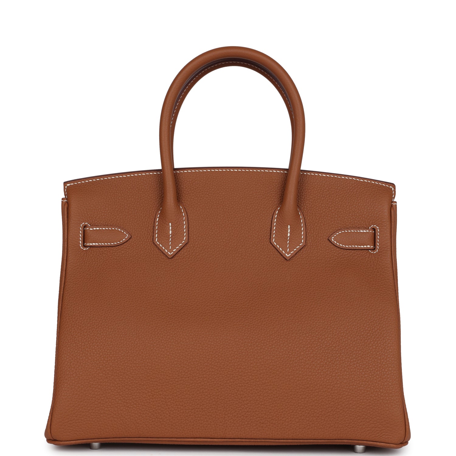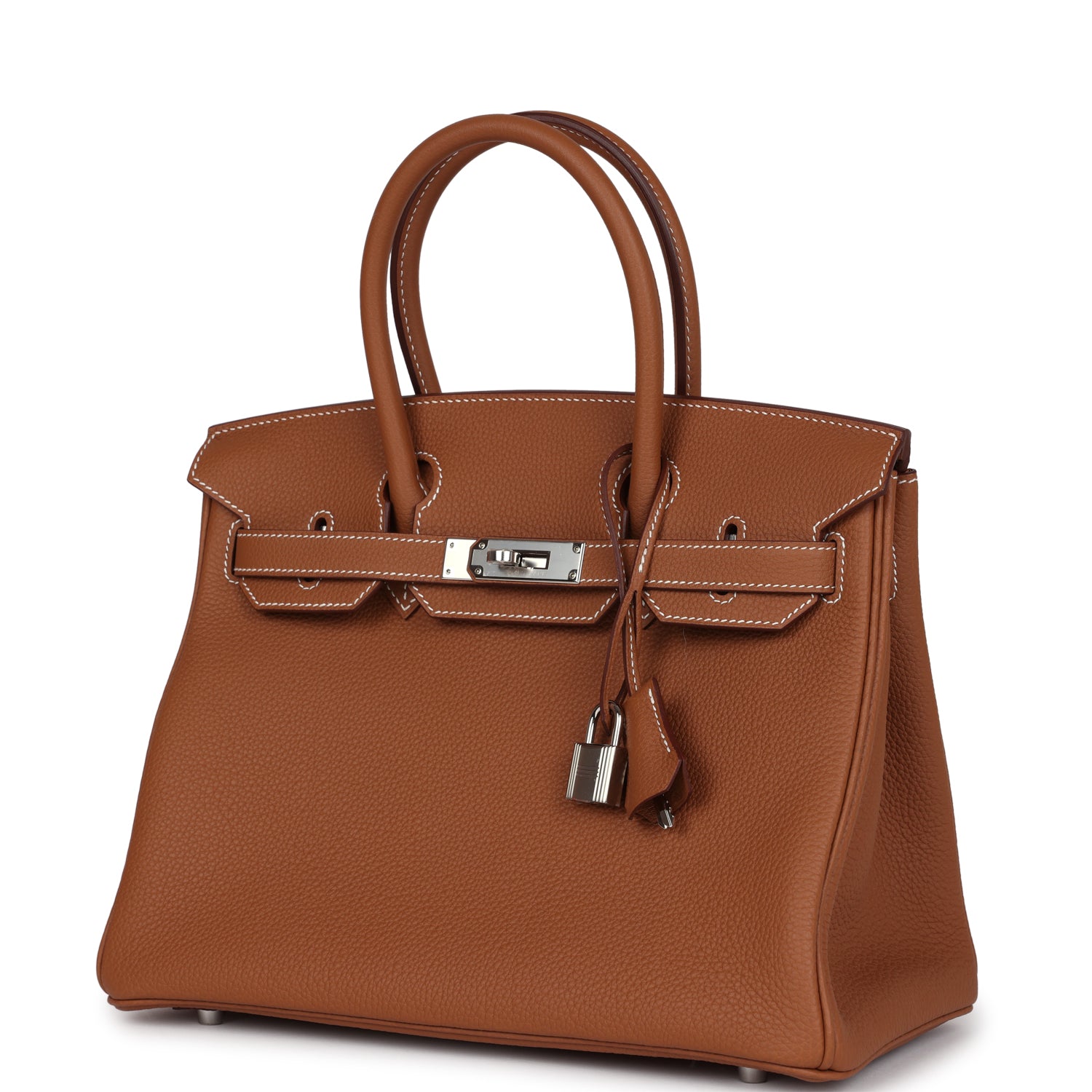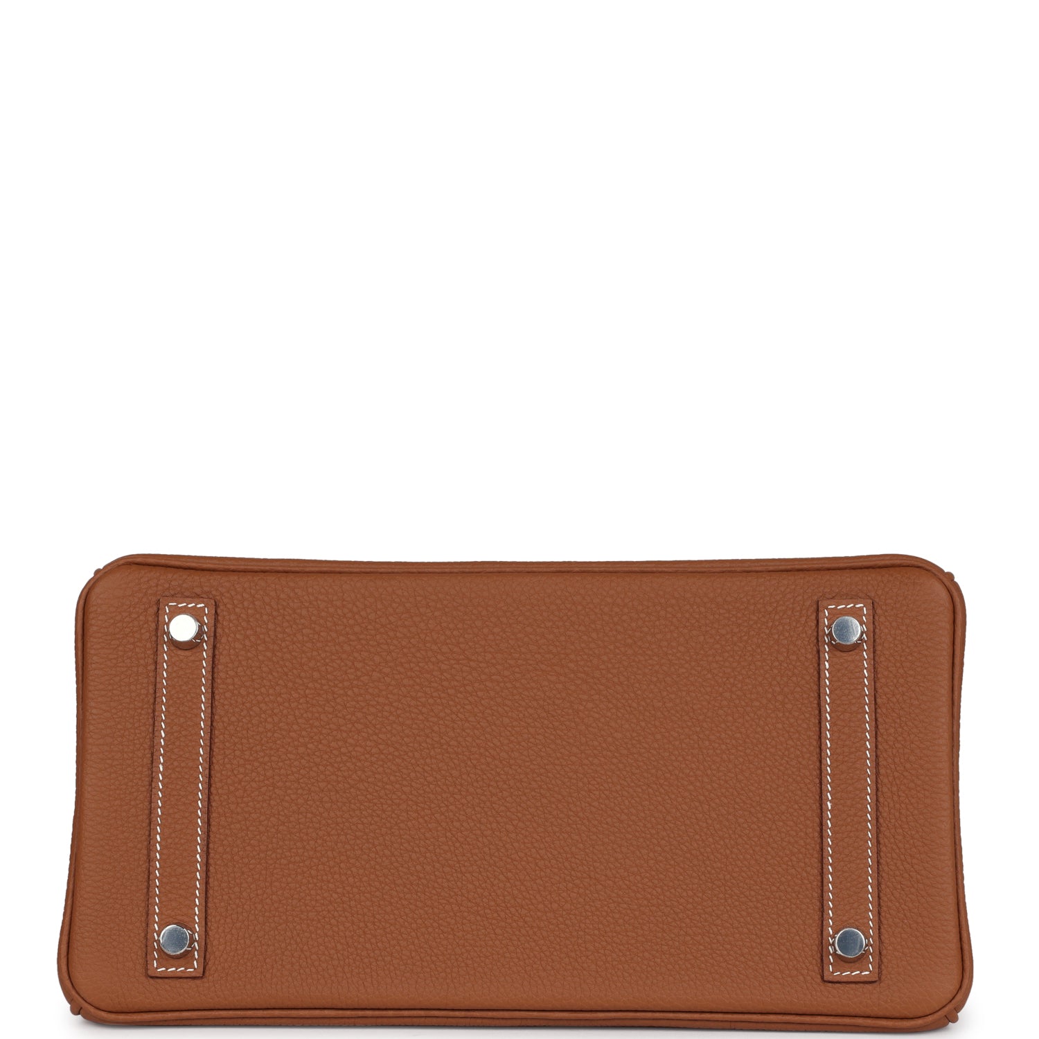 This Birkin is in Gold togo leather with palladium hardware and has contrast stitching, front flap, two straps with center toggle closure, clochette with lock and two keys, and double rolled handles.
