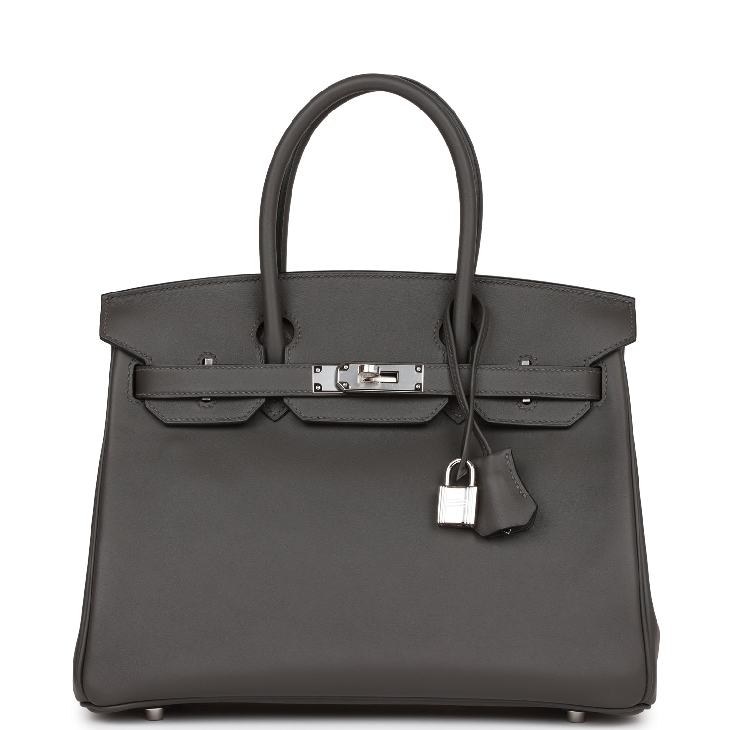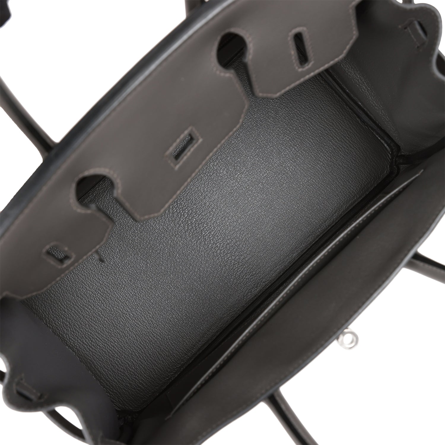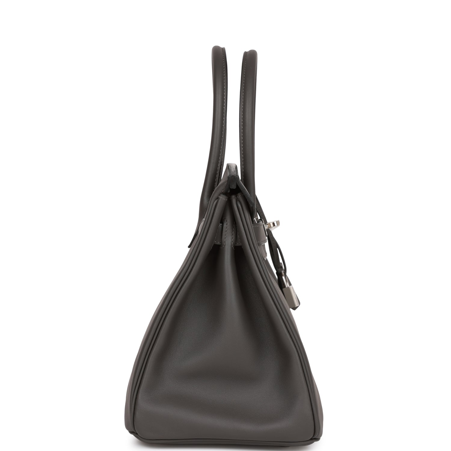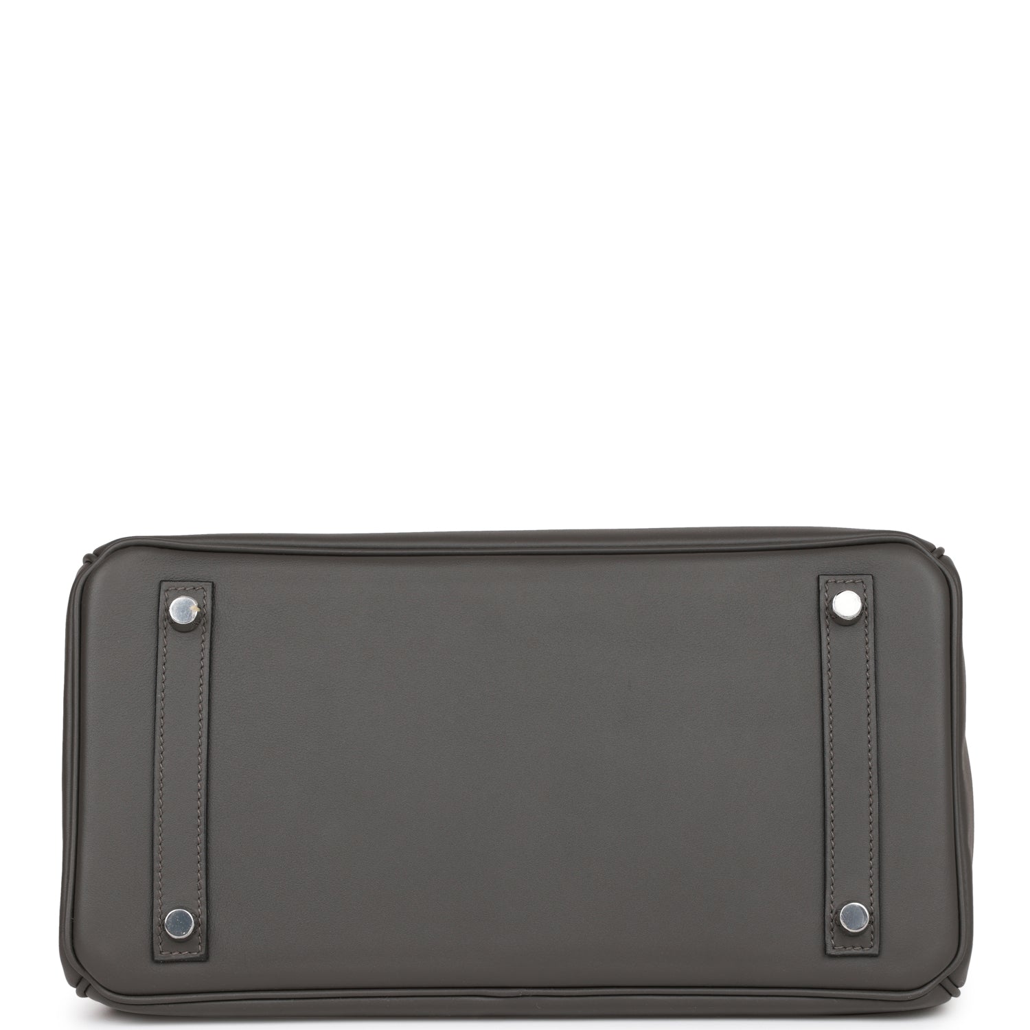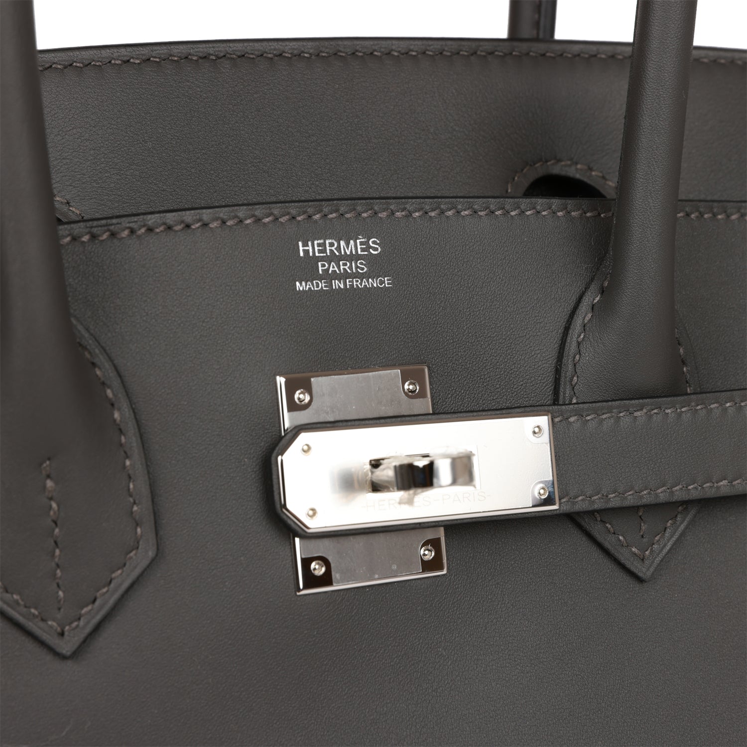 This Birkin is in Graphite Jonathan leather with palladium hardware and has tonal stitching, front flap, two straps with center toggle closure, clochette with lock and two keys, and double rolled handles.