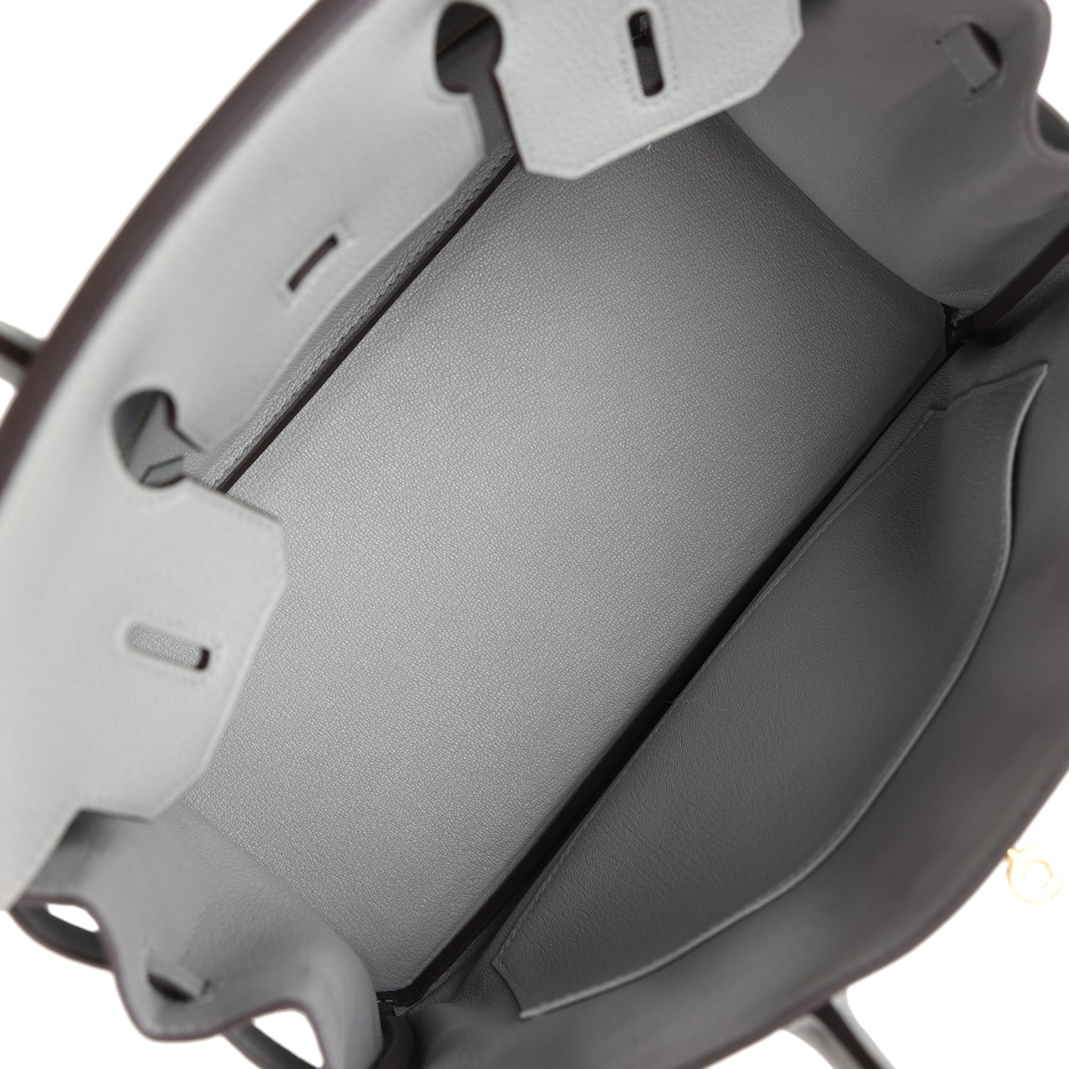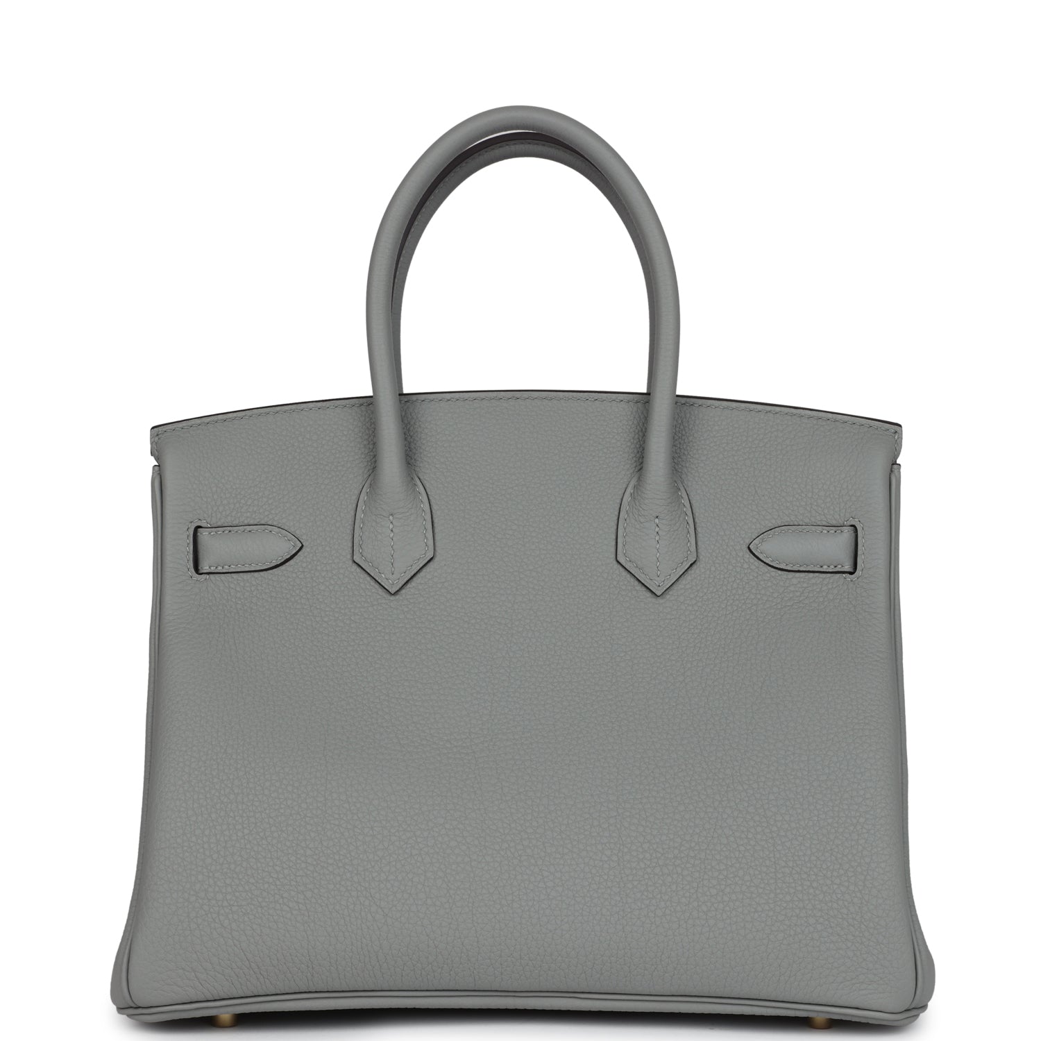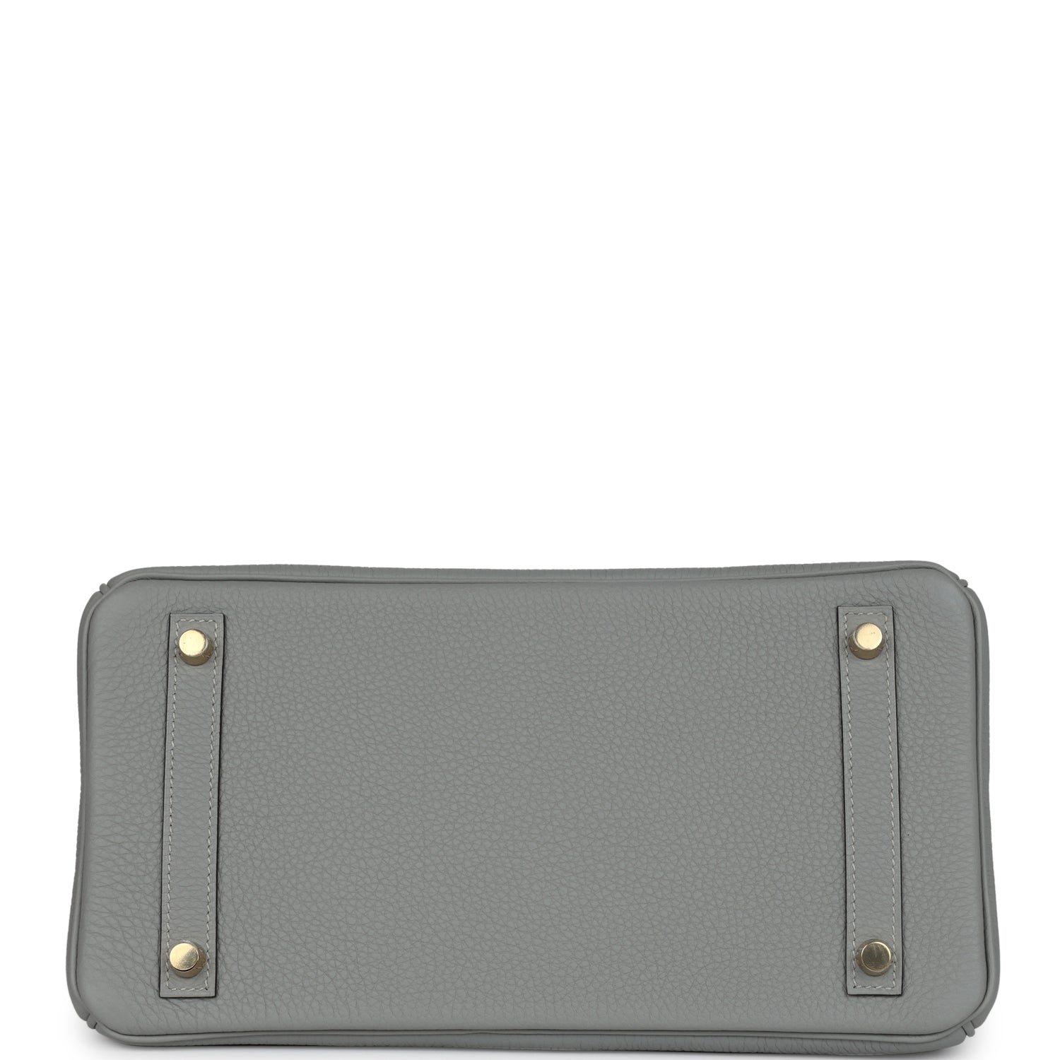 This Birkin is in Gris Mouette togo leather with gold hardware and has tonal stitching, a front toggle closure, a clochette with lock and two keys, and double rolled handles.