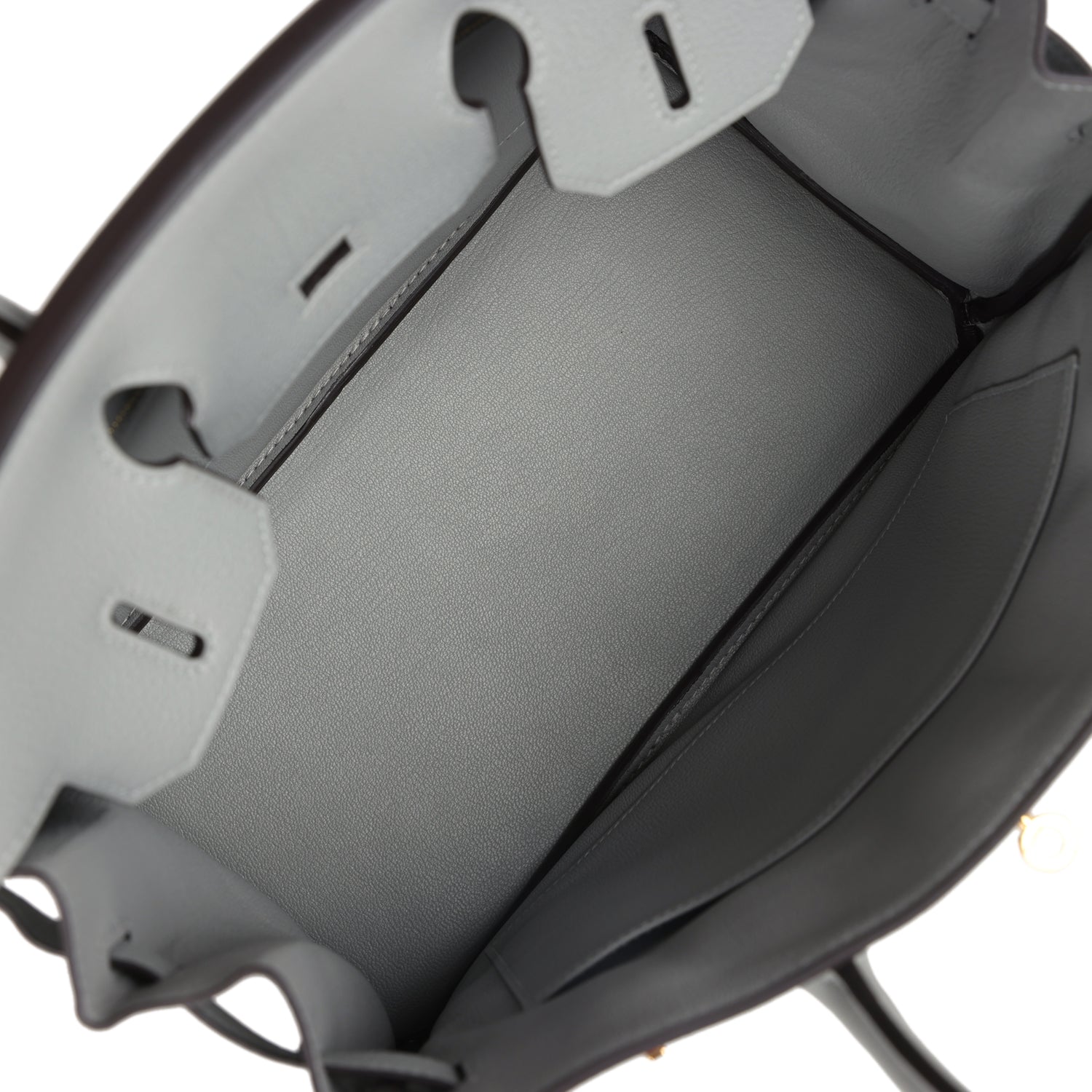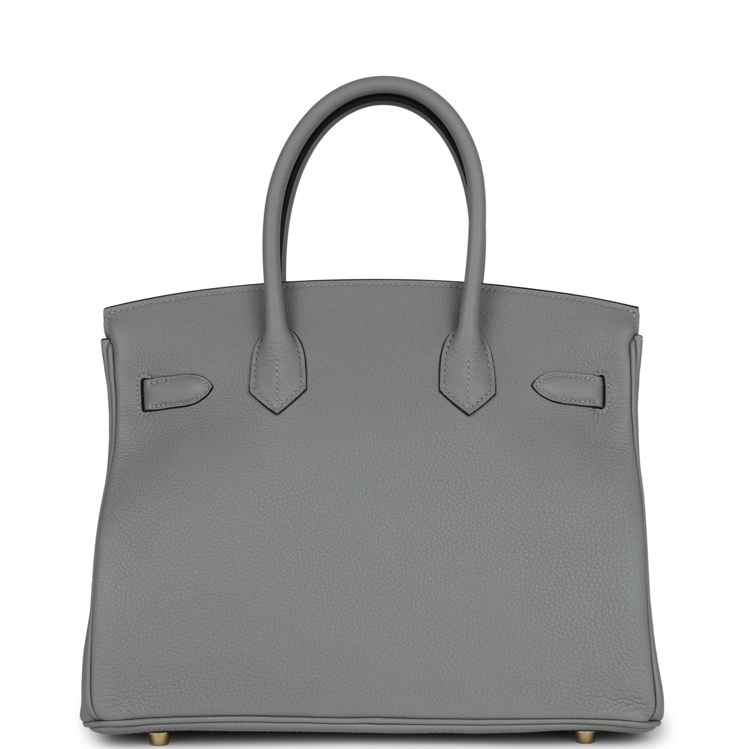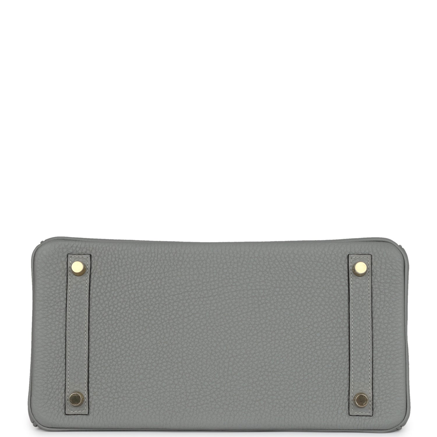 This Birkin is in Gris Mouette togo leather with gold hardware and has tonal stitching, a front toggle closure, a clochette with lock and two keys, and double rolled handles.