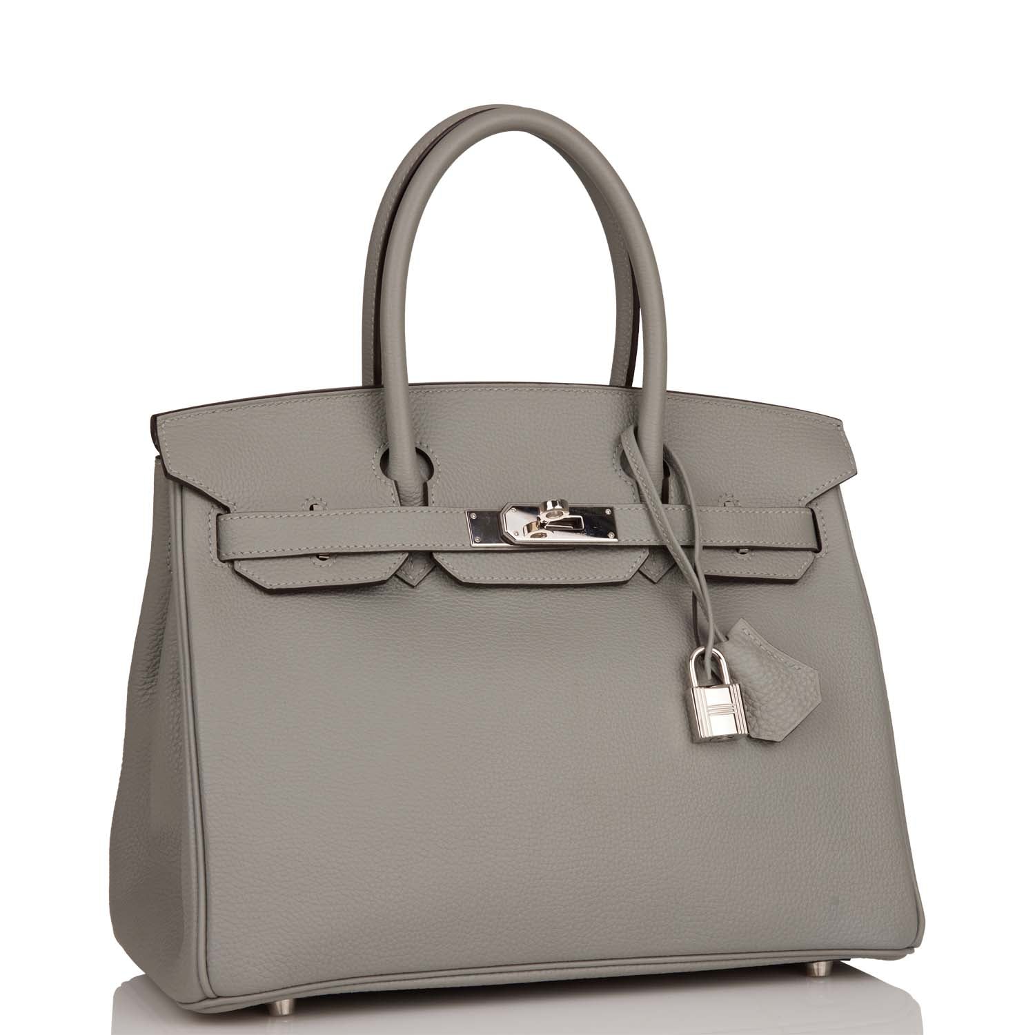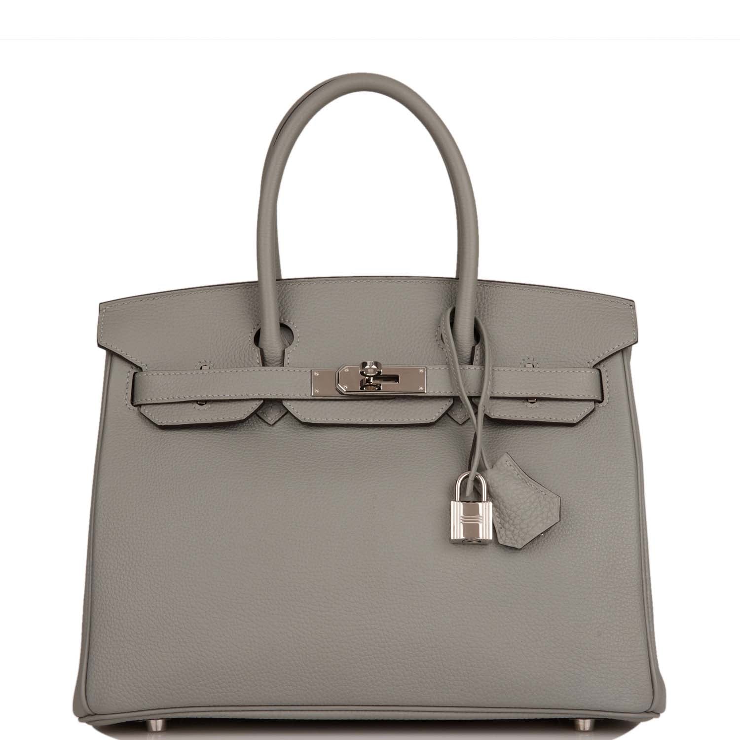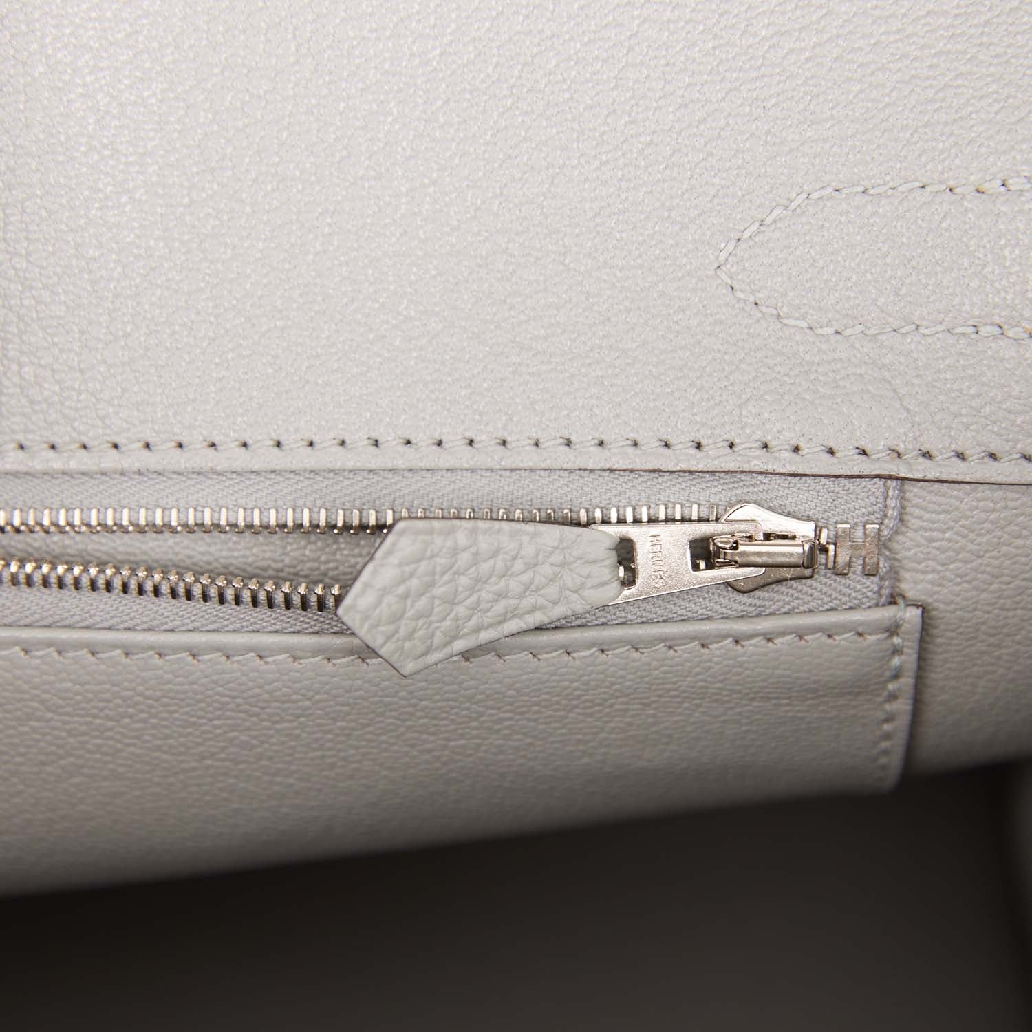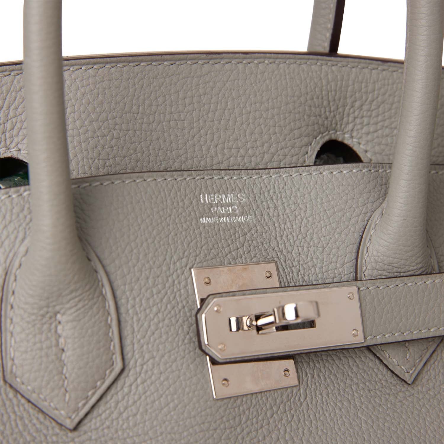 This Birkin is in Gris Mouette togo leather with palladium hardware and has tonal stitching, a front toggle closure, a clochette with lock and two keys, and double rolled handles.