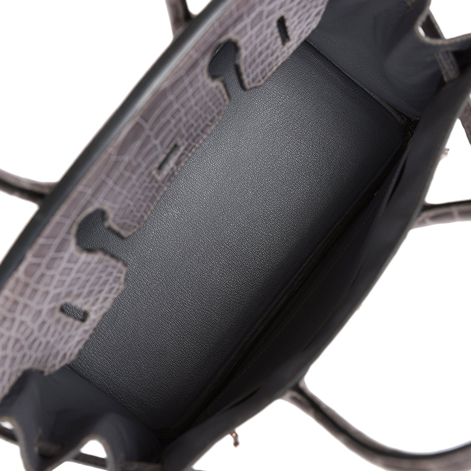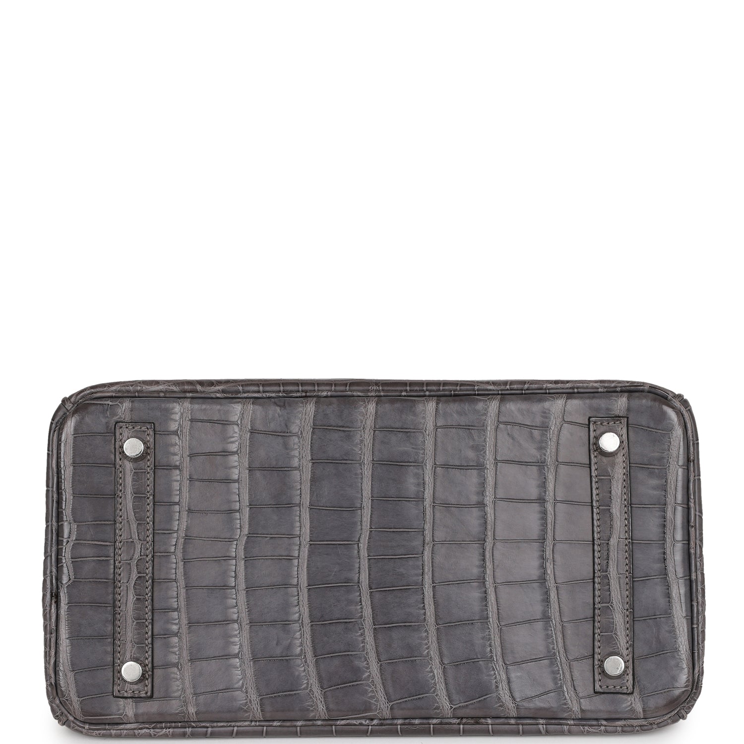 This Birkin is in Gris Paris Matte Mississippiensis alligator with palladium hardware and has tonal stitching, front flap, two straps with center toggle closure, clochette with lock and two keys, and double rolled handles.