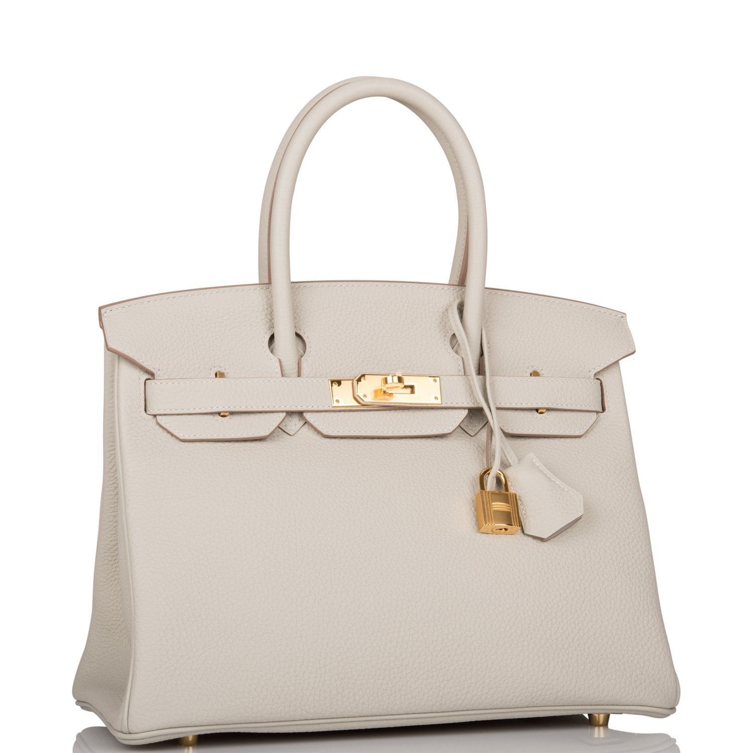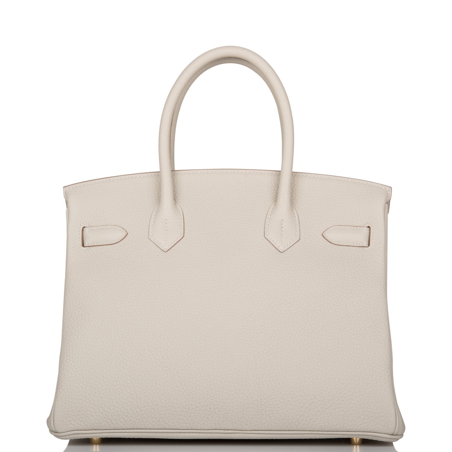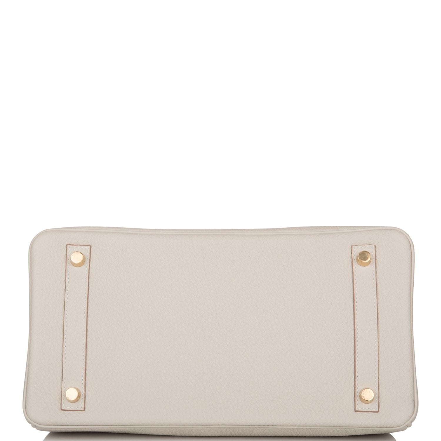 This Birkin is in Gris Perle togo leather with gold hardware and has tonal stitching, front flap, two straps with center toggle closure, clochette with lock and two keys, and double rolled handles.
