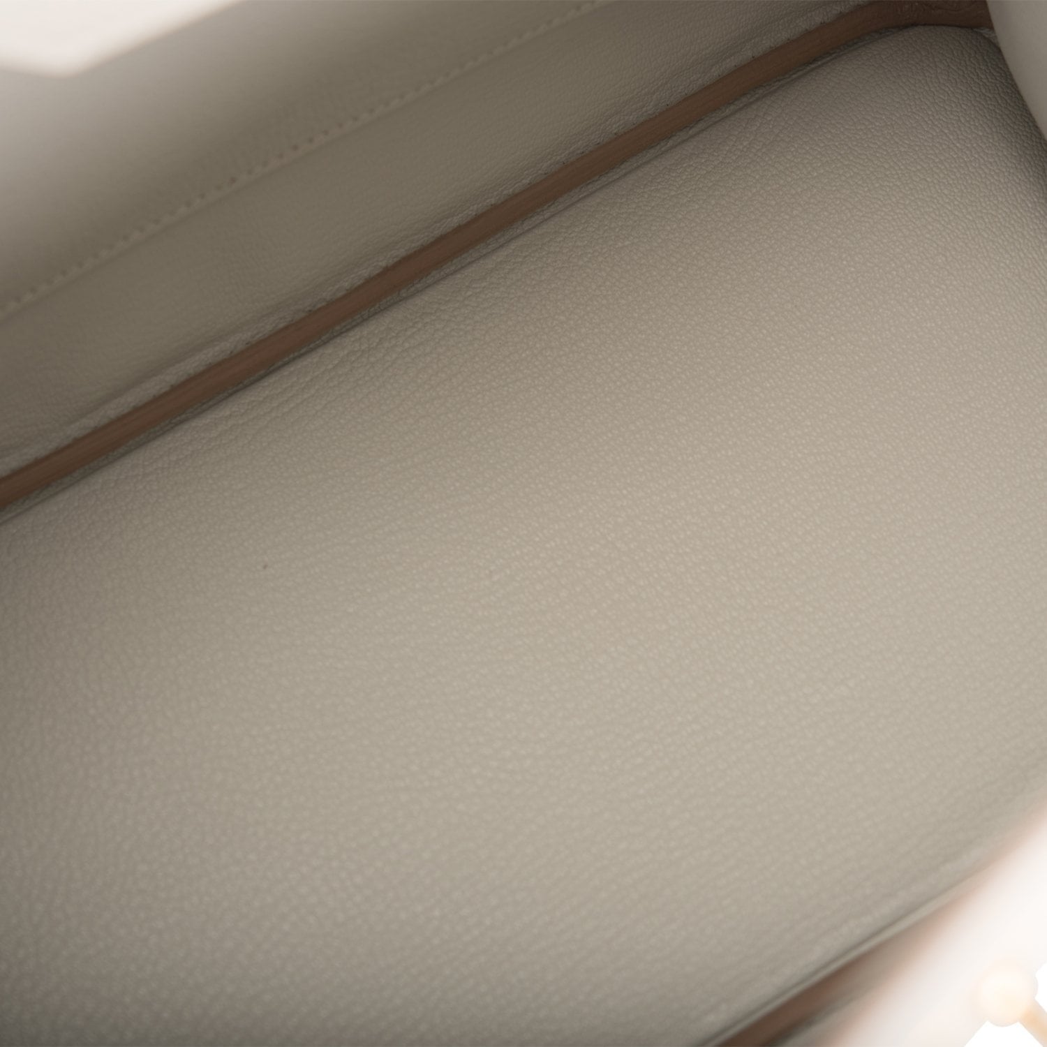 The interior is lined with Gris Perle chevre and has one zip pocket with an Hermes engraved zipper pull and an open pocket on the opposite side.
