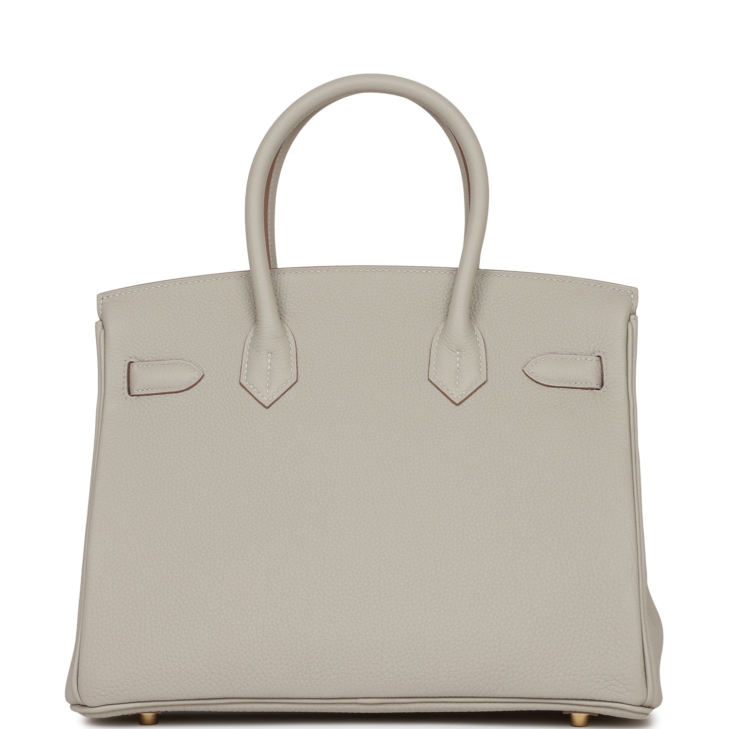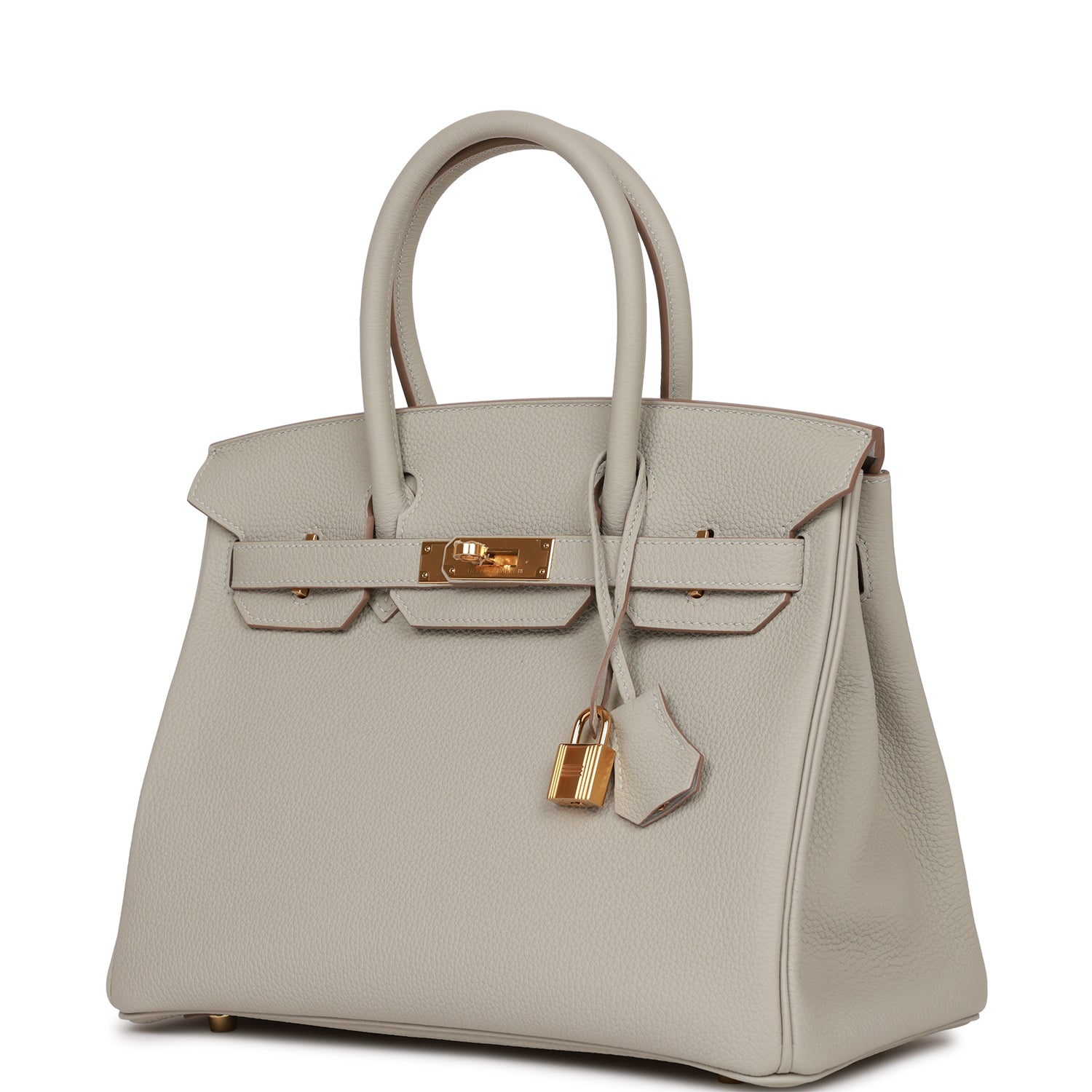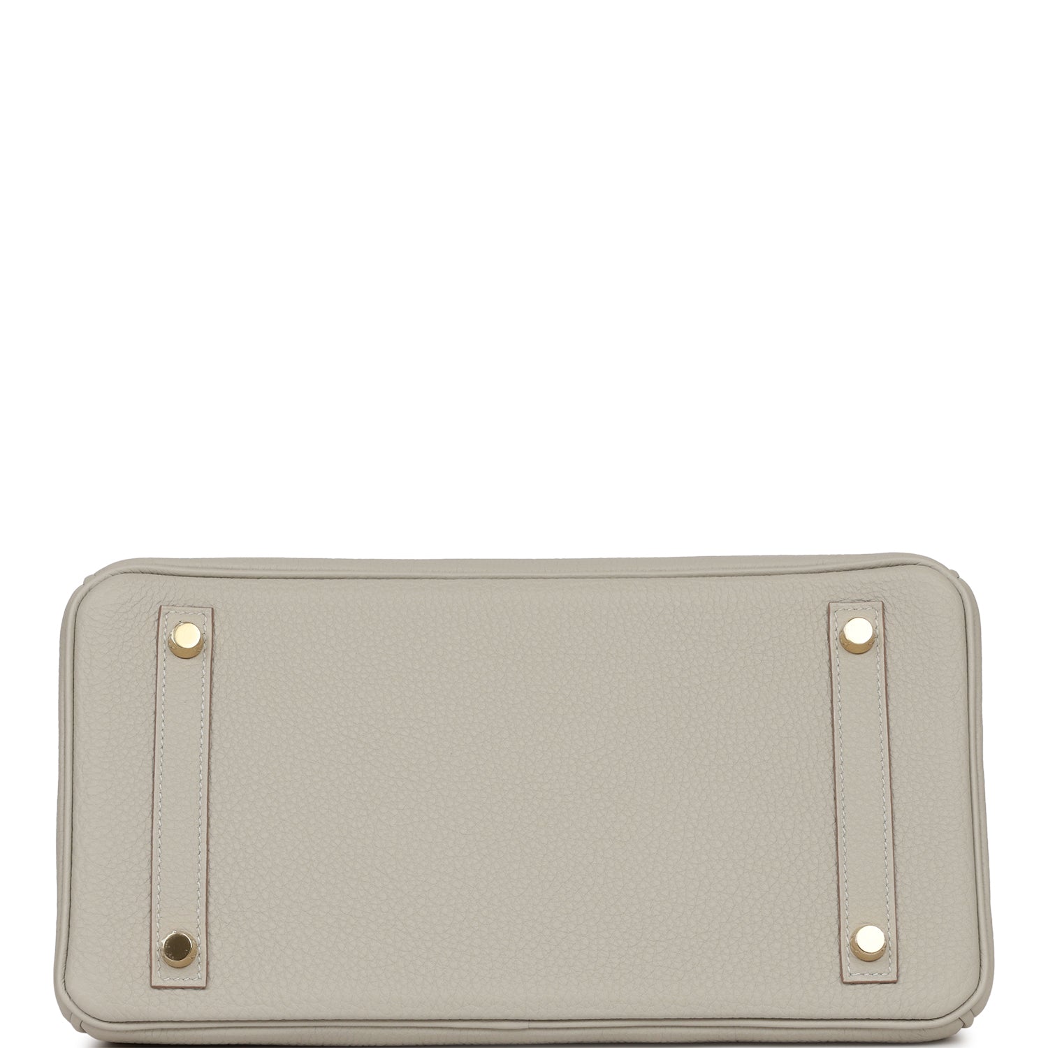 This Birkin is in Gris Perle togo leather with gold hardware and has tonal stitching, front flap, two straps with center toggle closure, clochette with lock and two keys, and double rolled handles.