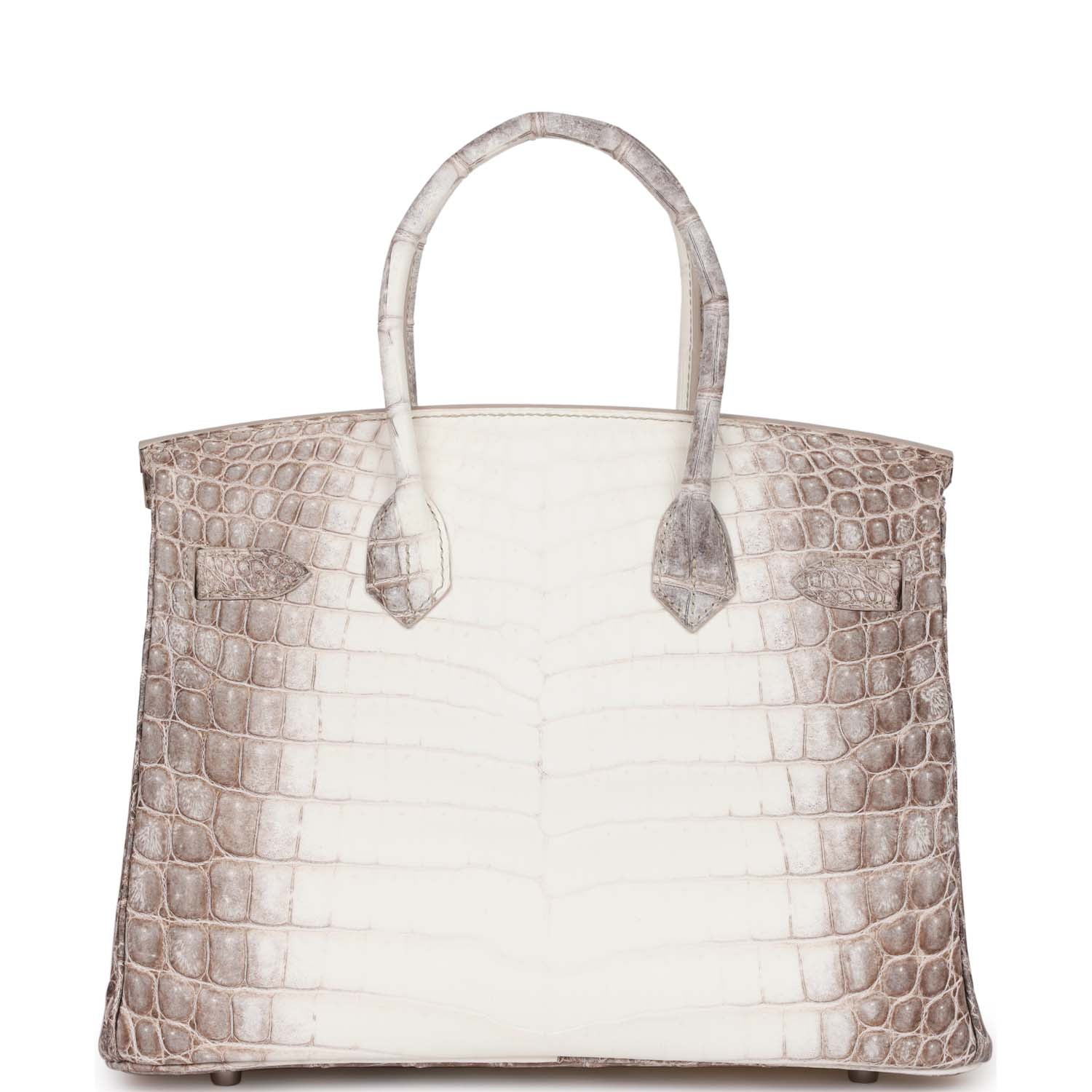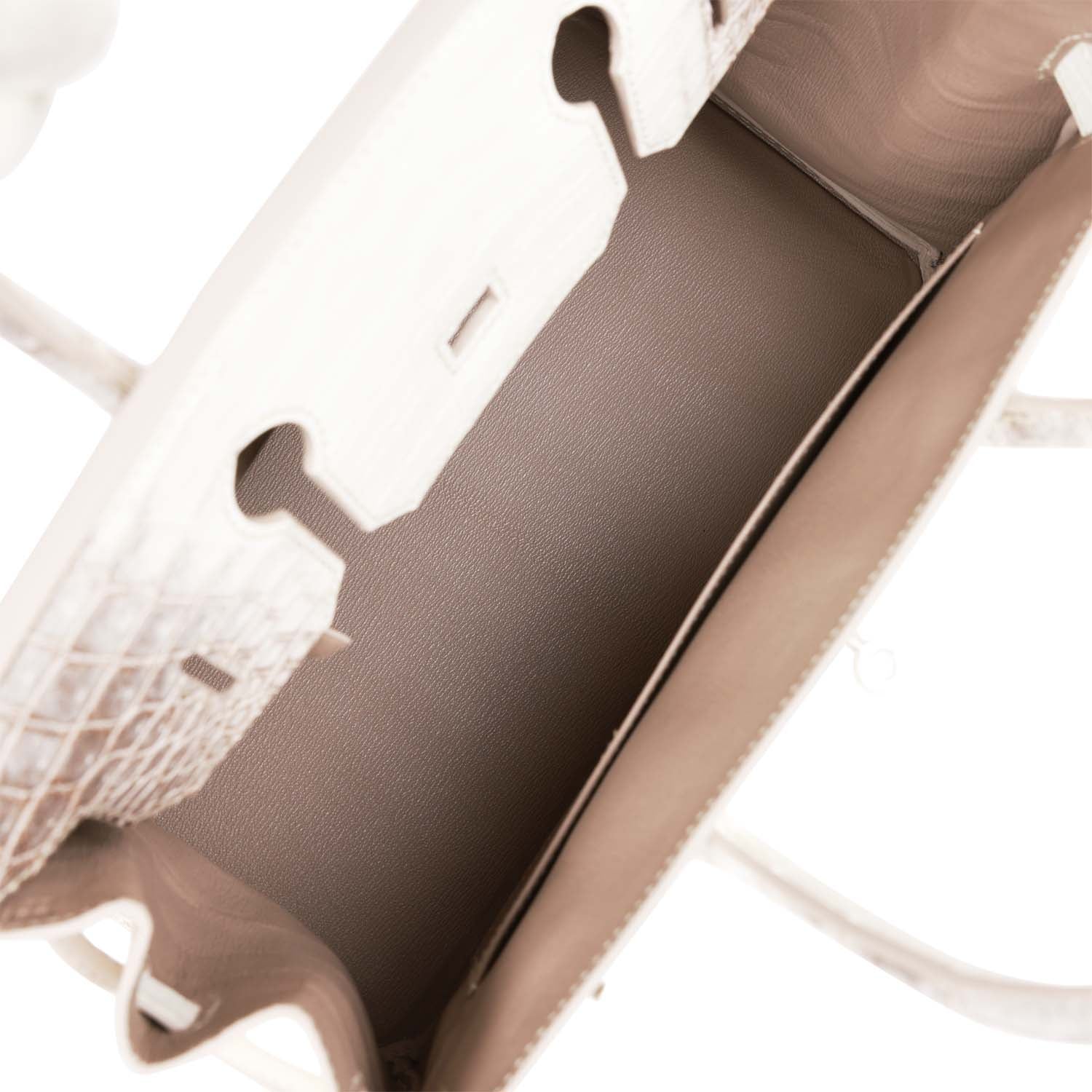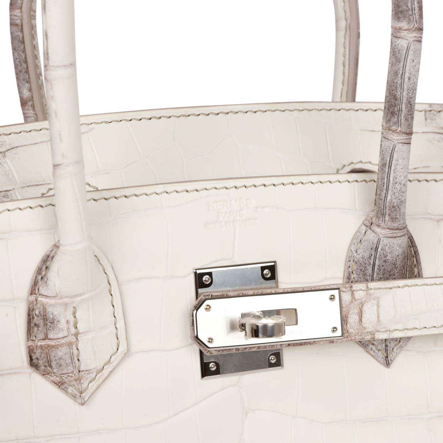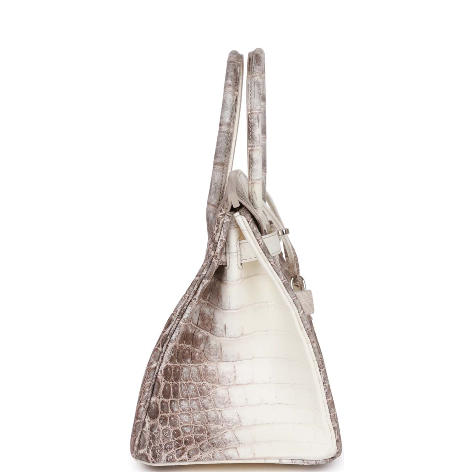 This Himalaya Birkin is in Niloticus crocodile with palladium hardware and has tonal stitching, front flap, two straps with center toggle closure, clochette with lock and two keys, and double rolled handles.