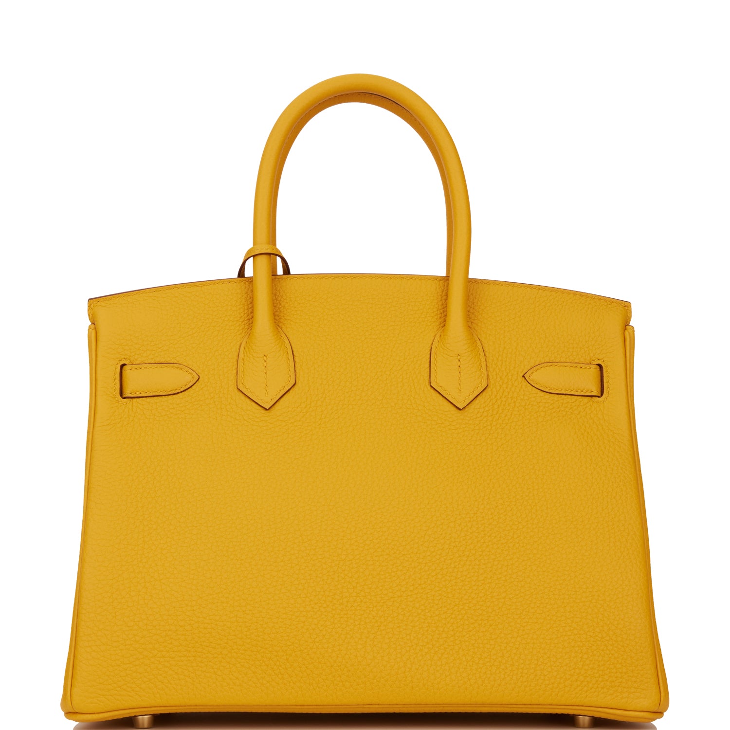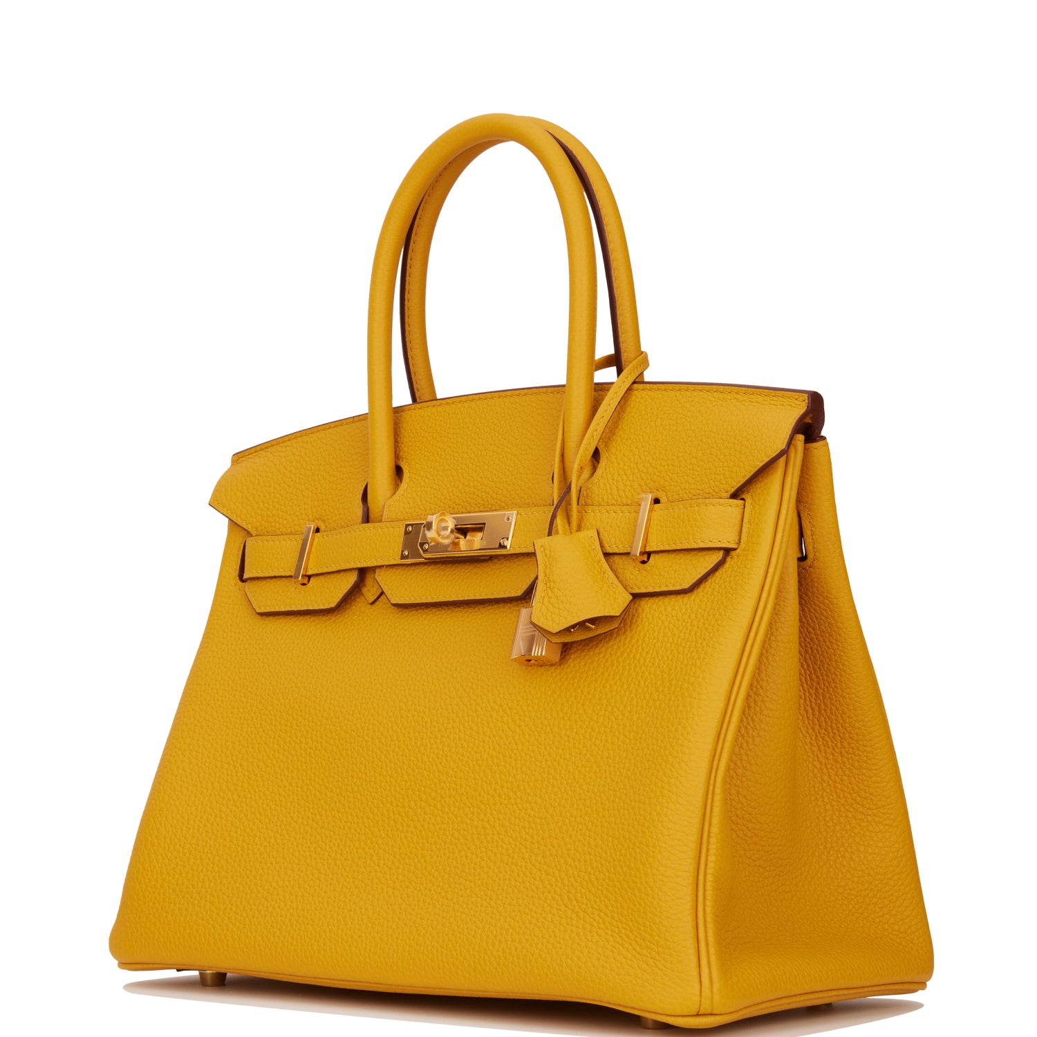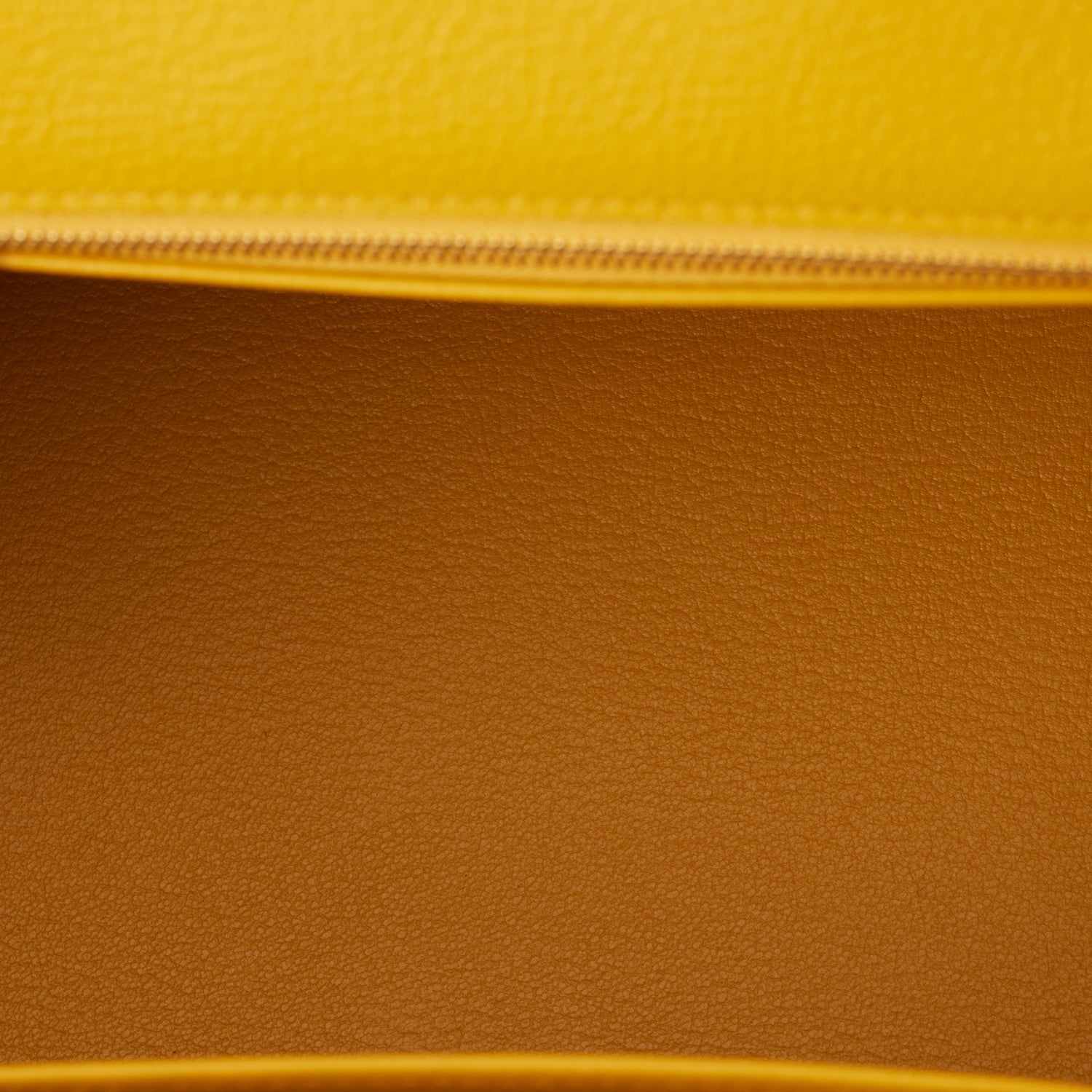 This Birkin is in Jaune Ambre togo leather with gold hardware and has tonal stitching, front flap, two straps with center toggle closure, clochette with lock and two keys, and double rolled handles.