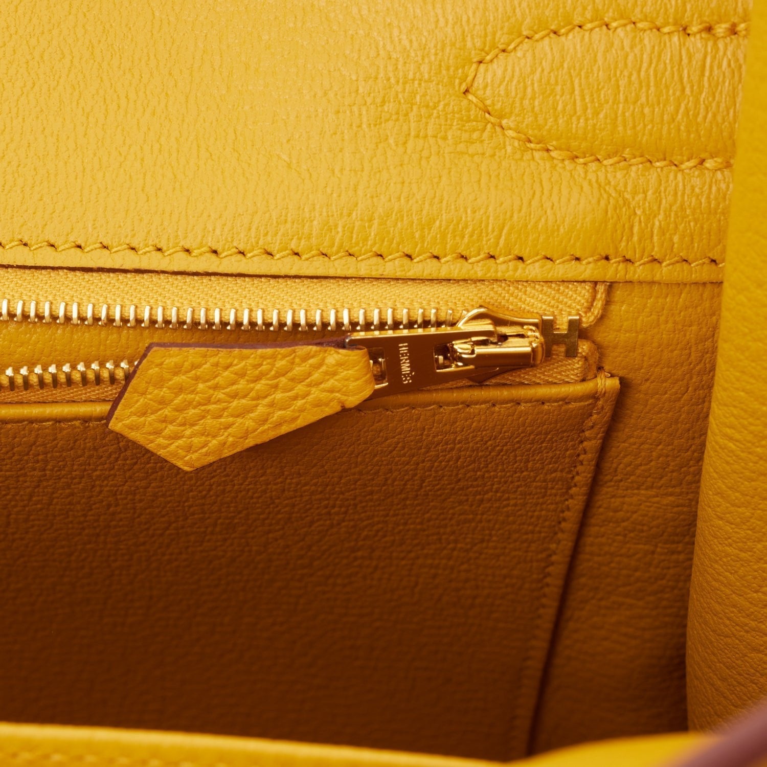 The interior is lined with Jaune Ambre chevre and has one zip pocket with an Hermes engraved zipper pull and an open pocket on the opposite side.