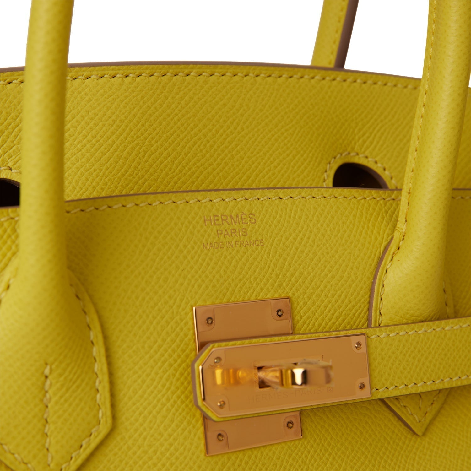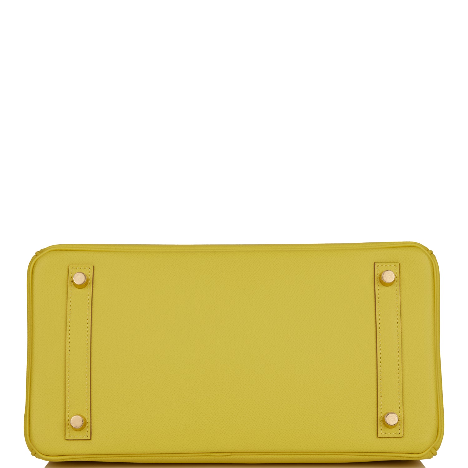 This Birkin is in Lime epsom leather with gold hardware and has tonal stitching, two straps with front toggle closure, clochette with lock and two keys and double rolled handles.