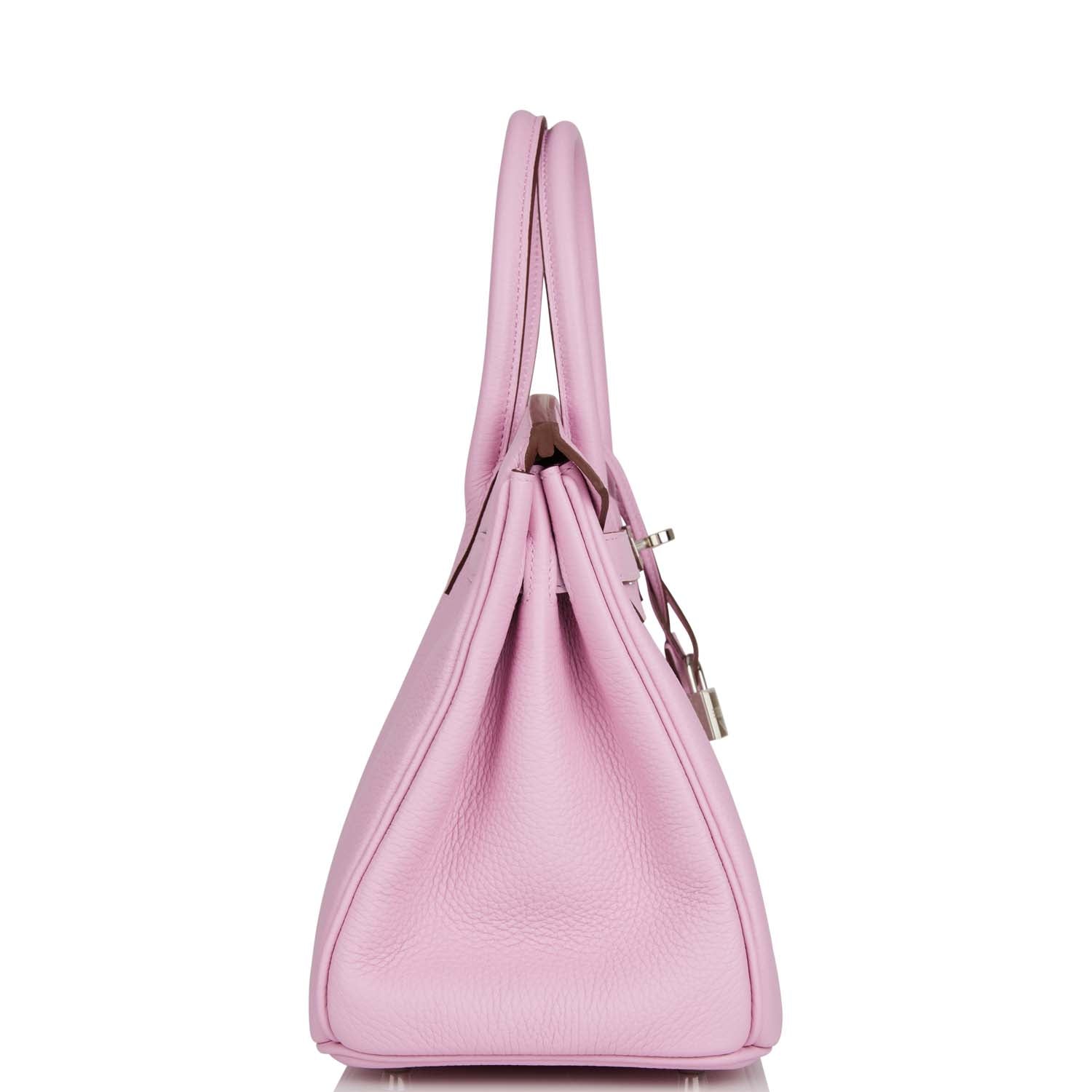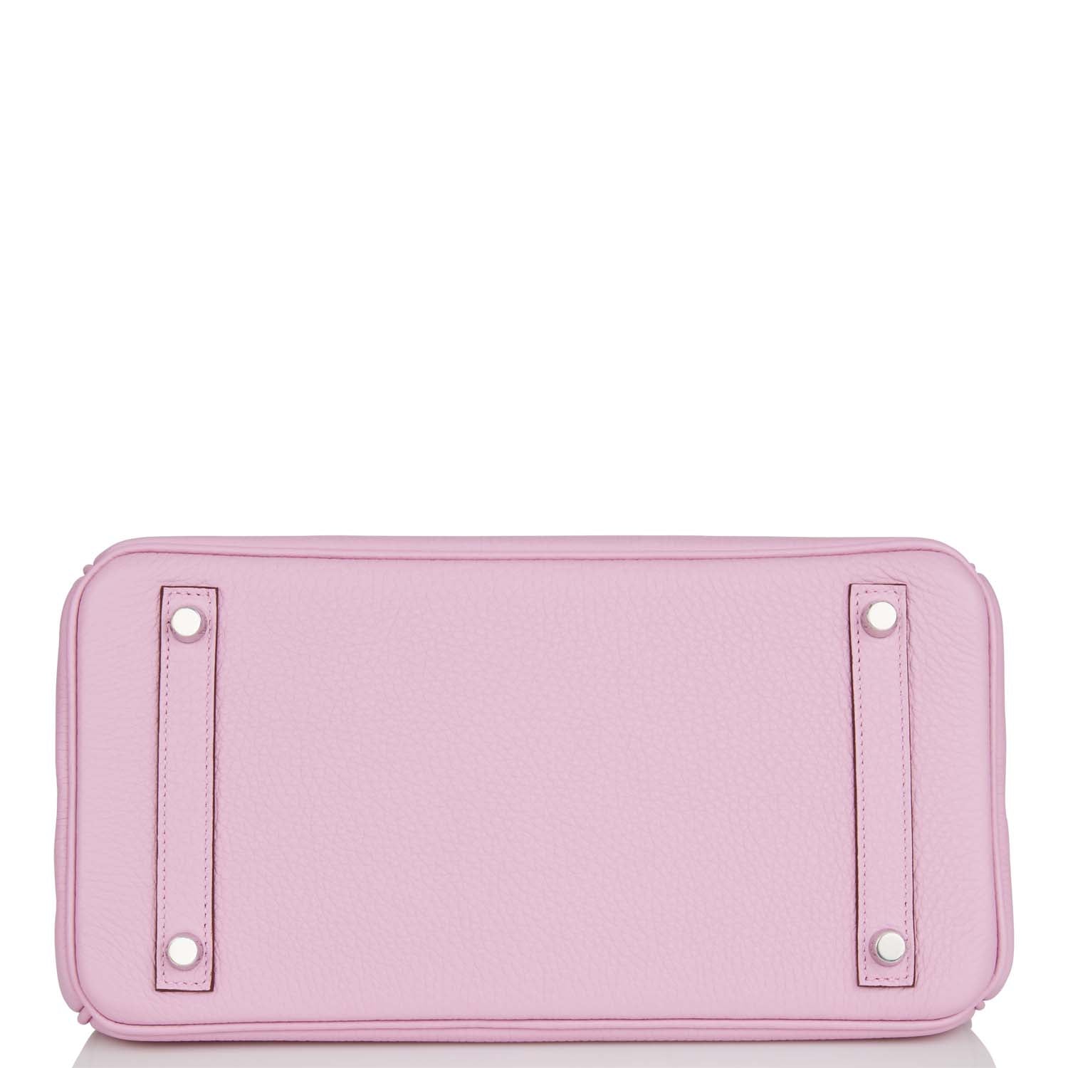 This Birkin is in Mauve Sylvestre clemence leather with palladium hardware and has tonal stitching, front flap, two straps with center toggle closure, clochette with lock and two keys, and double rolled handles.
