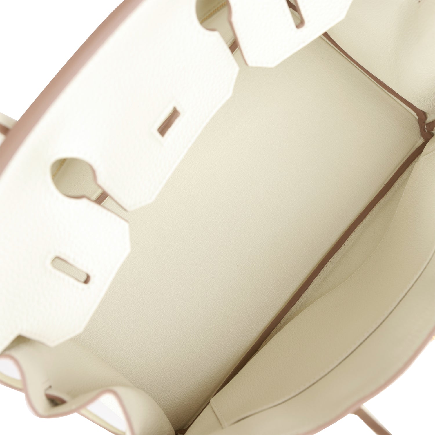 The interior is lined with Mushroom chevre and has one zip pocket with an Hermes engraved zipper pull and an open pocket on the opposite side.