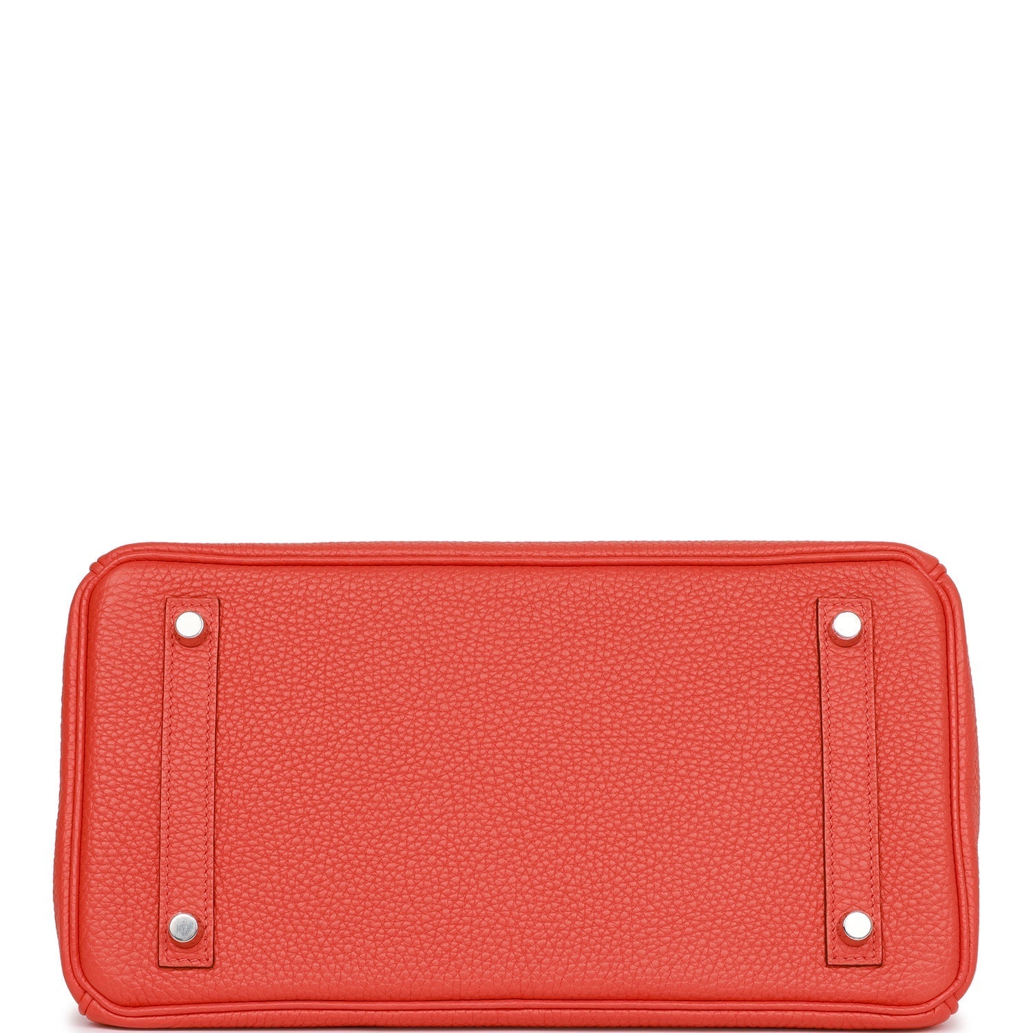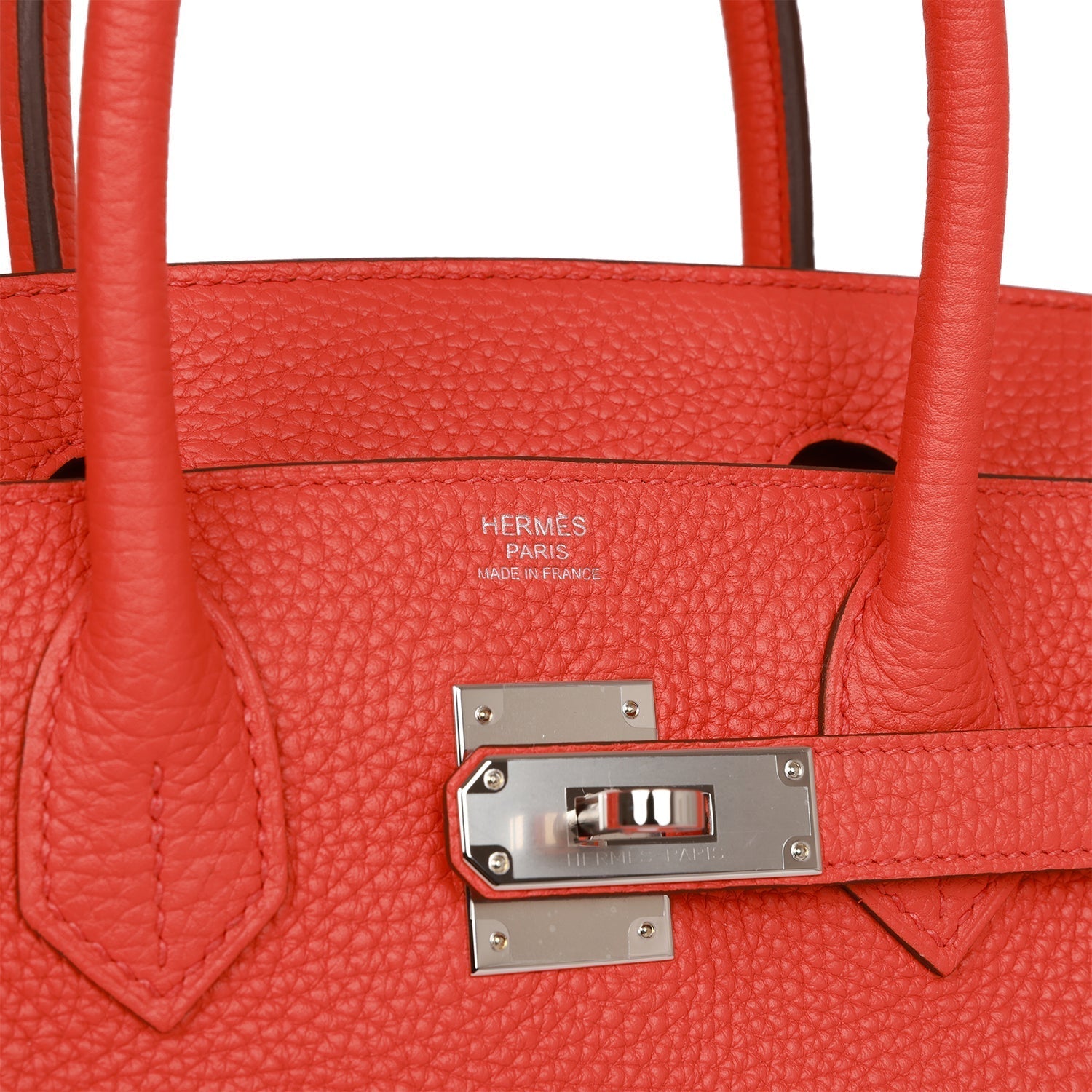 This Birkin is in Orange Poppy togo leather with palladium hardware and has tonal stitching, front flap, two straps with center toggle closure, clochette with lock and two keys and double rolled handles.