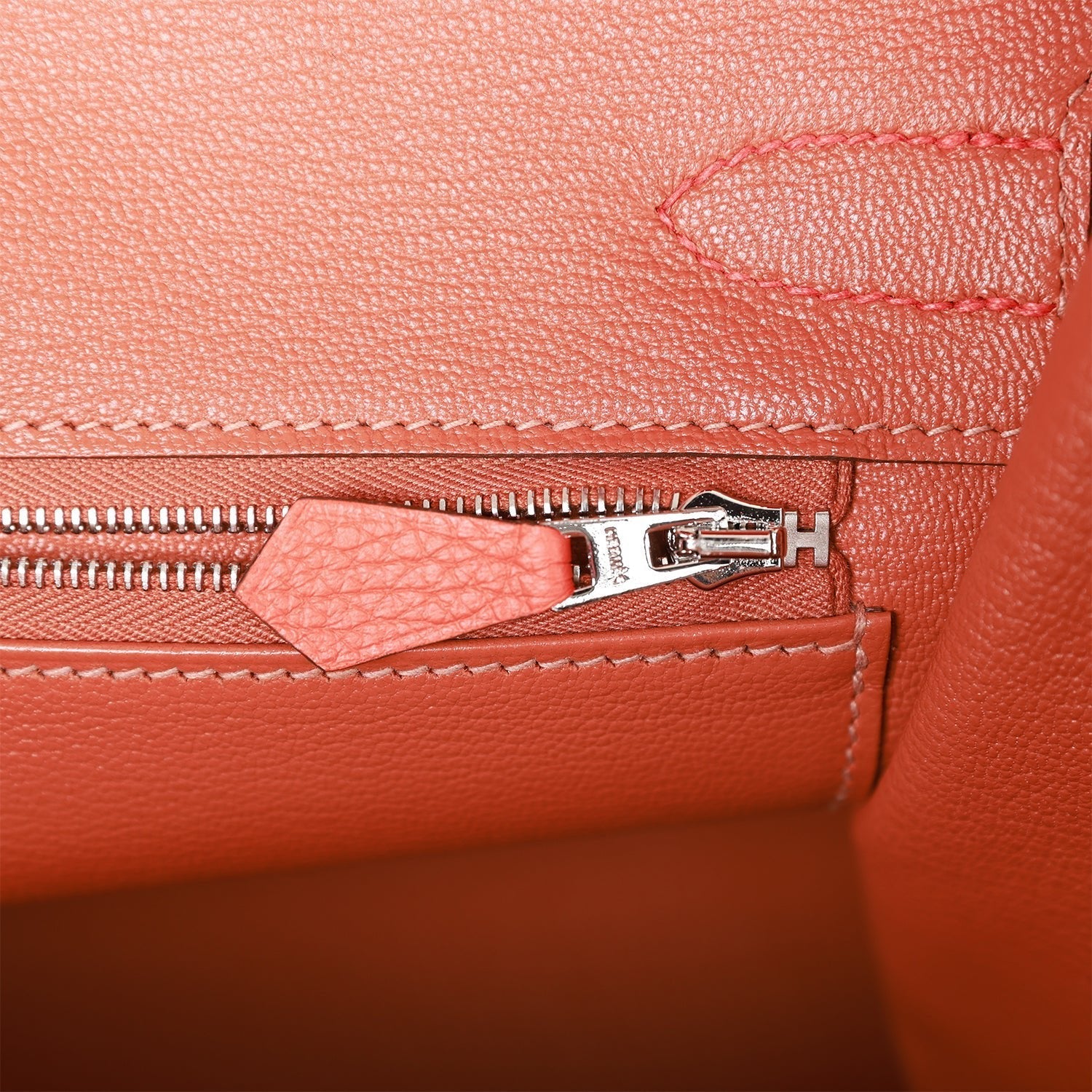 The interior is lined with Blush chevre and has one zip pocket with an Hermes engraved zipper pull and an open pocket on the opposite side.