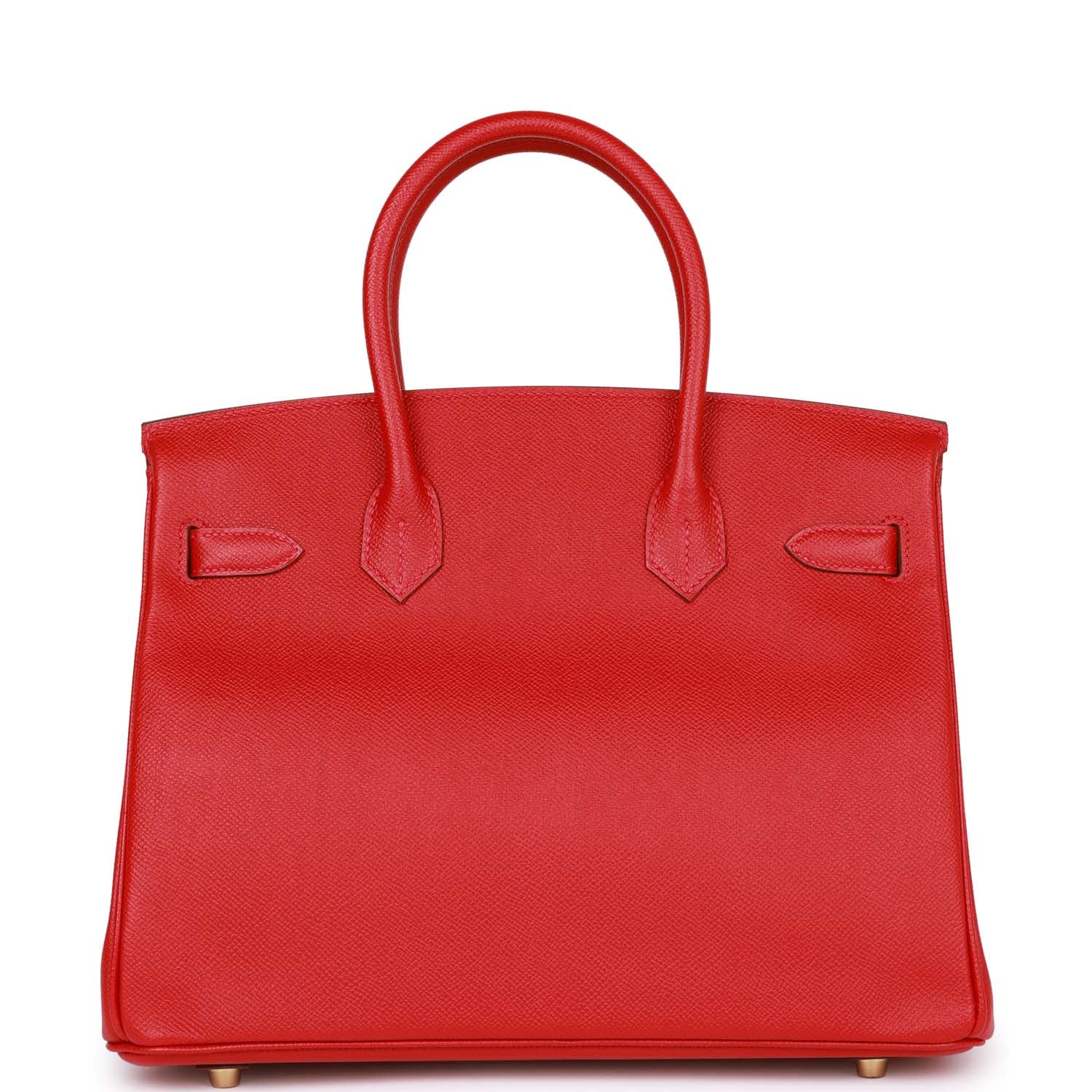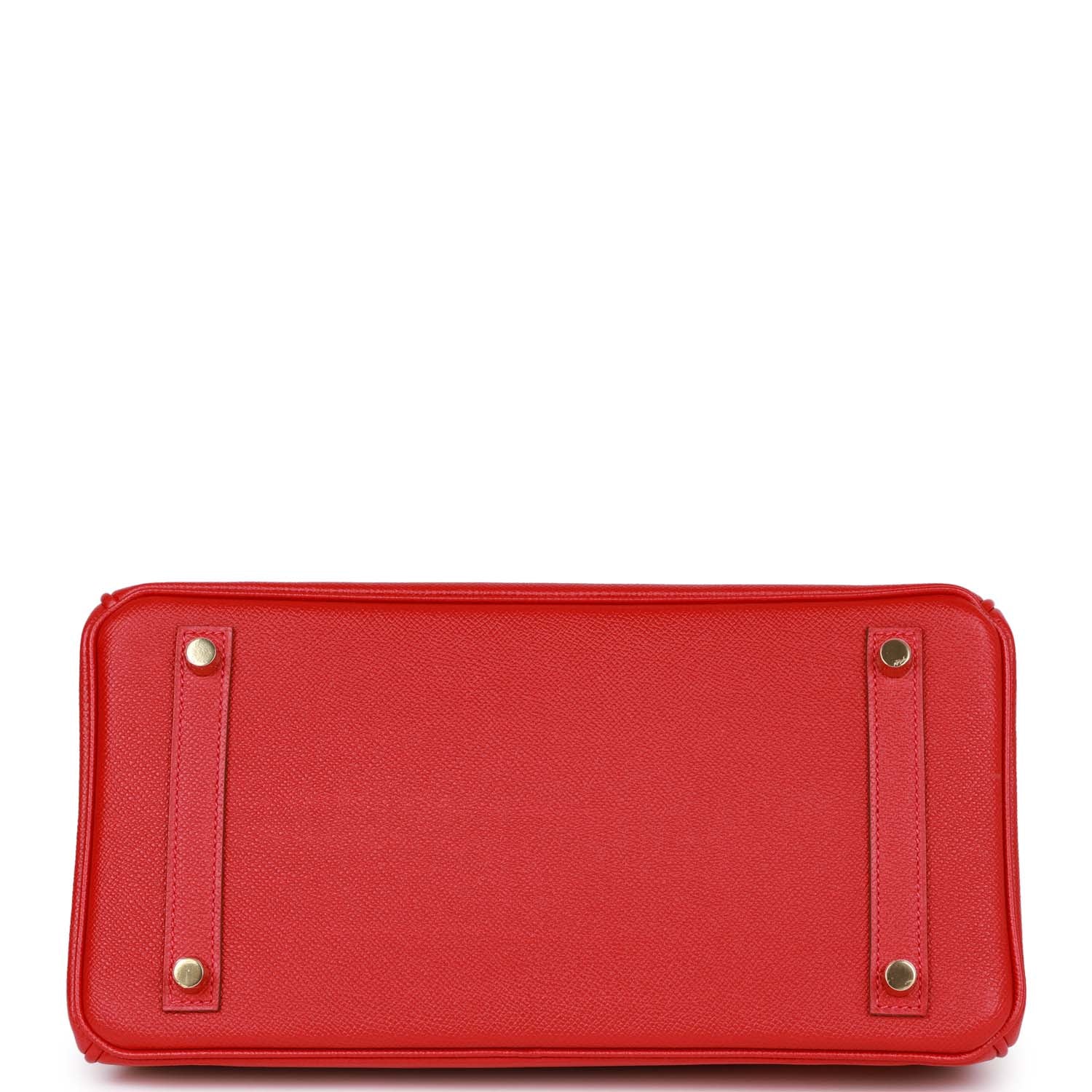 This Hermes Birkin 30cm is in Rouge Casaque epsom leather with gold hardware and has tonal stitching, front flap, two straps with center toggle closure, clochette with lock and two keys, and double rolled handles.