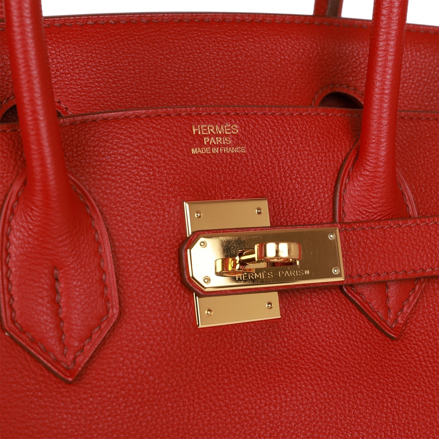 This Birkin is in Rouge Garance togo leather with gold hardware and has tonal stitching, front flap, two straps with center toggle closure, clochette with lock and two keys, and double rolled handles.