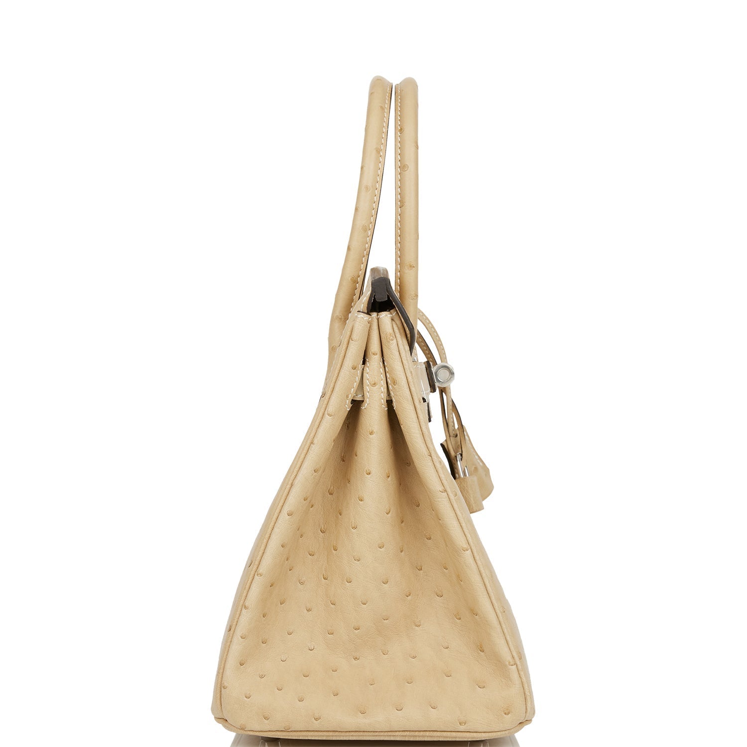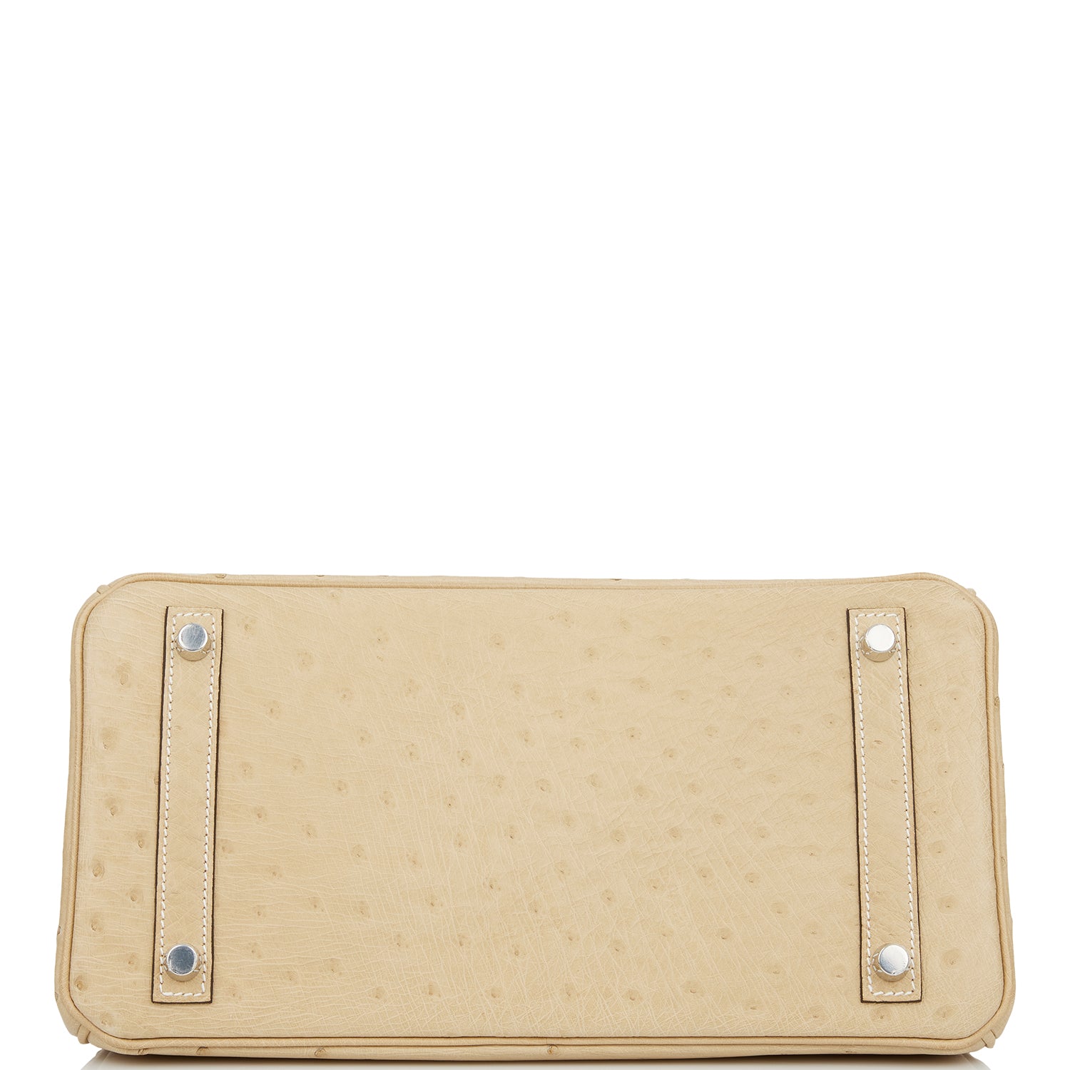 This Birkin is in Trench ostrich with palladium hardware and features tonal stitching, front flap, two straps with center toggle closure, clochette with lock and two keys, and double rolled handles.