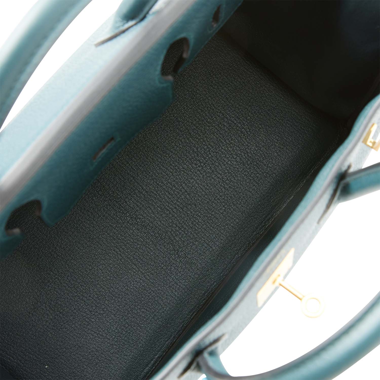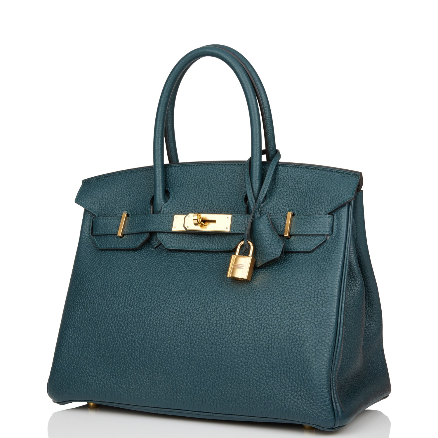 This Birkin is in Vert Cypress togo leather with gold hardware and has tonal stitching, front flap, two straps with center toggle closure, clochette with lock and two keys and double rolled handles.