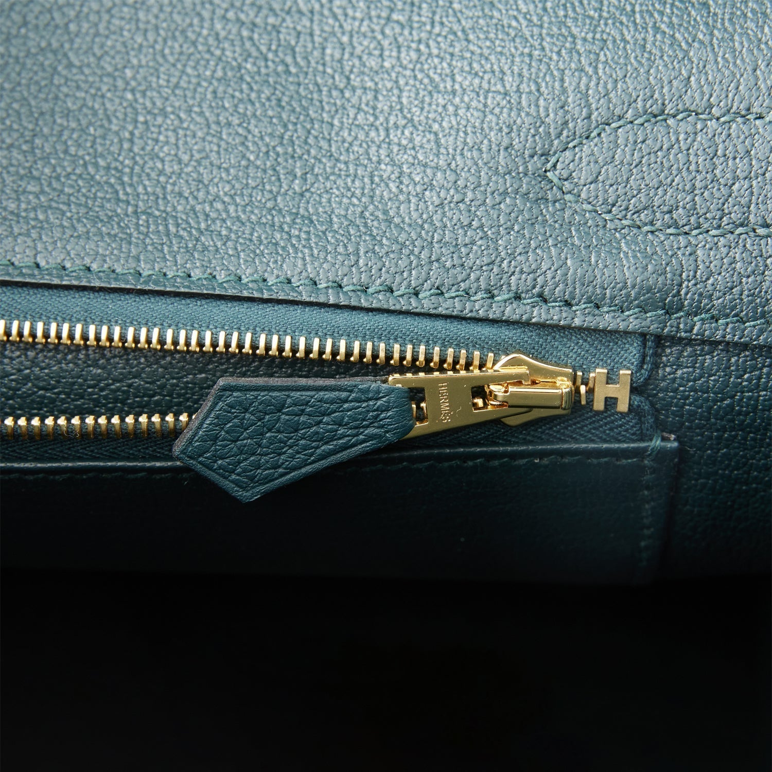 The interior is lined with Vert Cypress chevre and has one zip pocket with an Hermes engraved zipper pull and an open pocket on the opposite side.