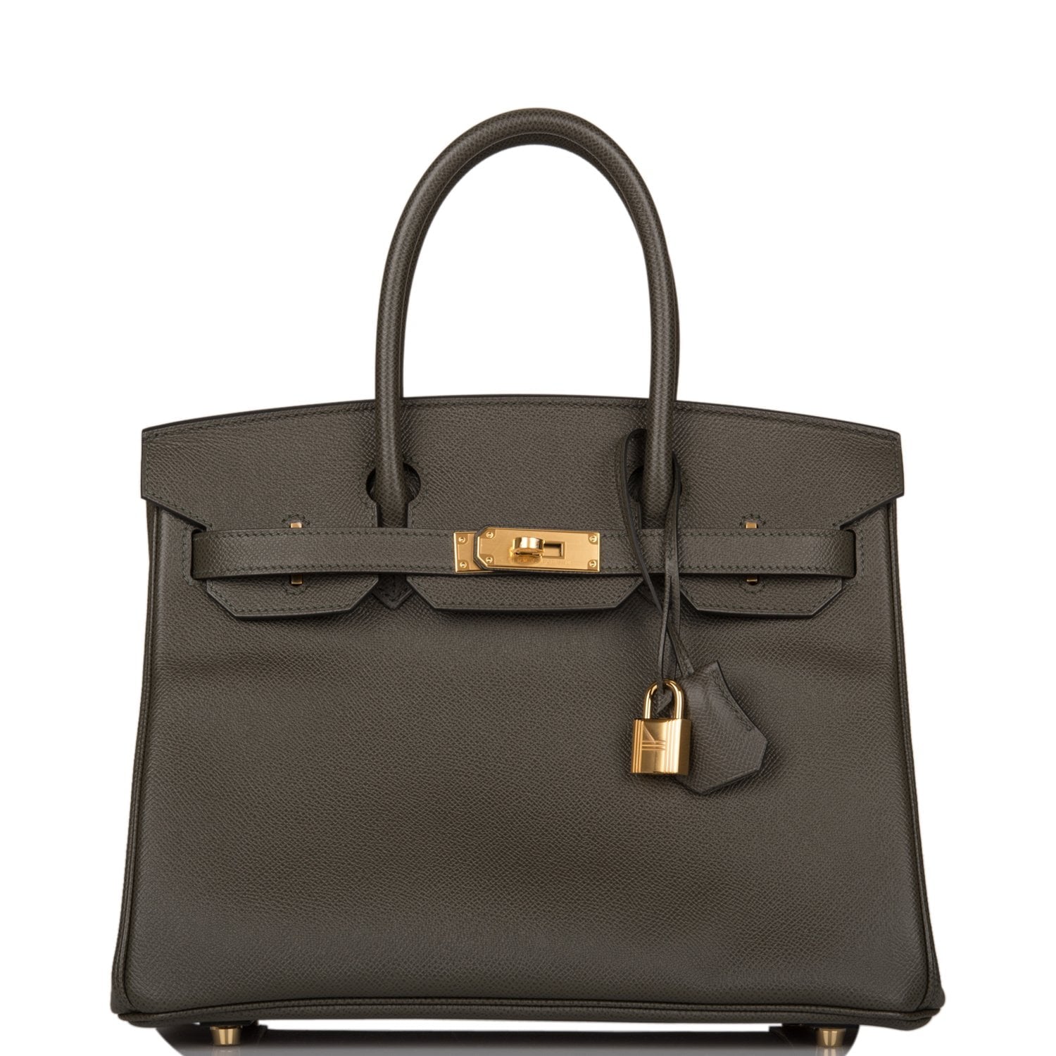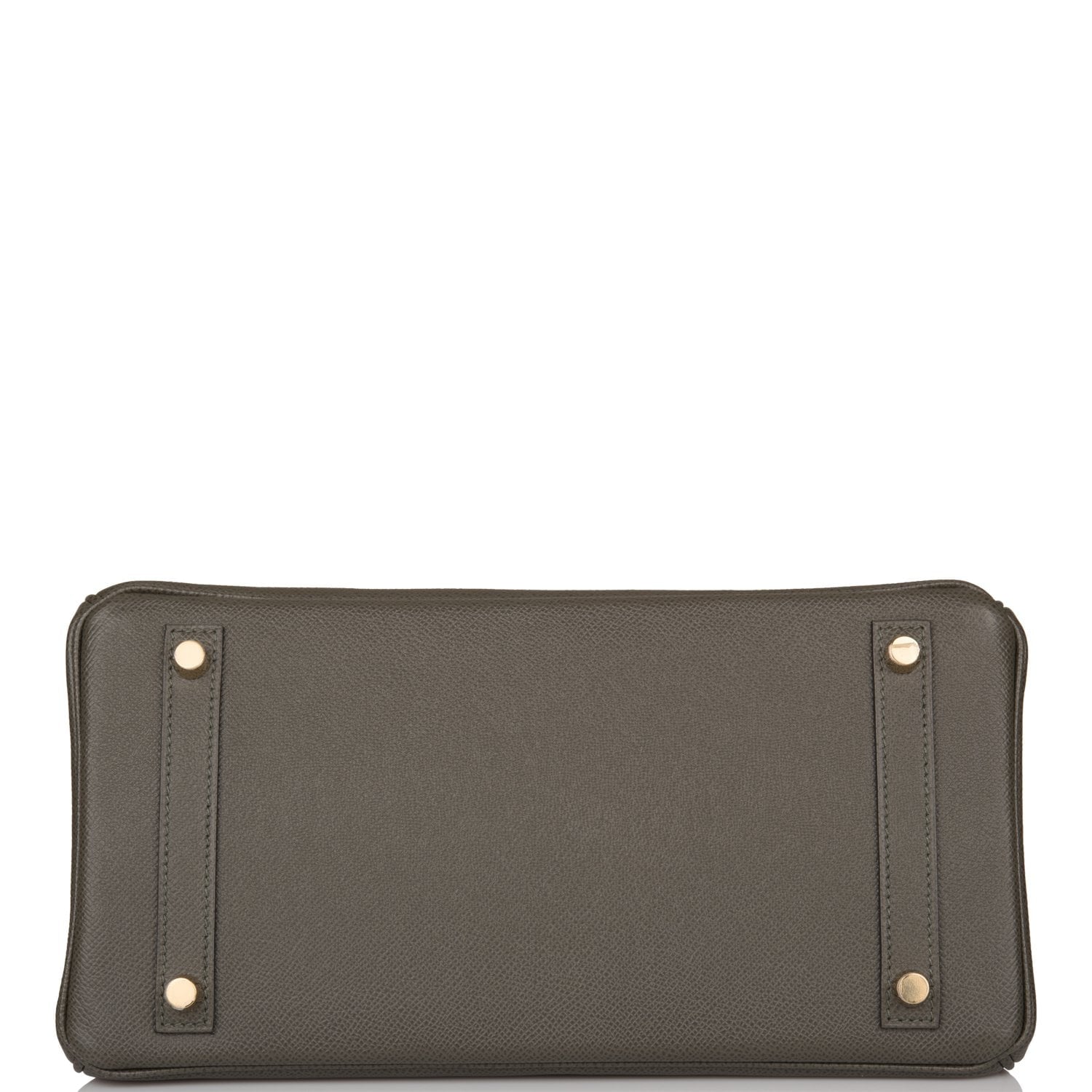 This Birkin is in Vert de Gris epsom leather with gold hardware and has tonal stitching, front flap, two straps with center toggle closure, clochette with lock and two keys, and double rolled handles.