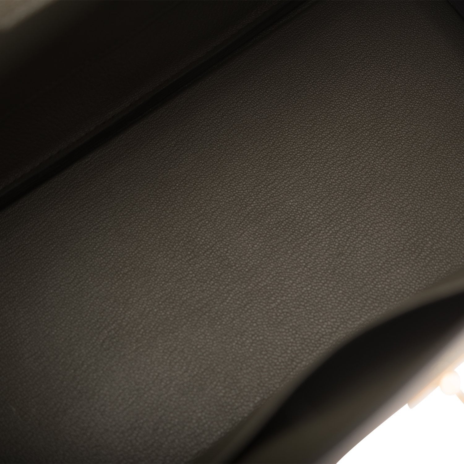 The interior is lined with Vert de Gris chevre and has one zip pocket with an Hermes engraved zipper pull and an open pocket on the opposite side.