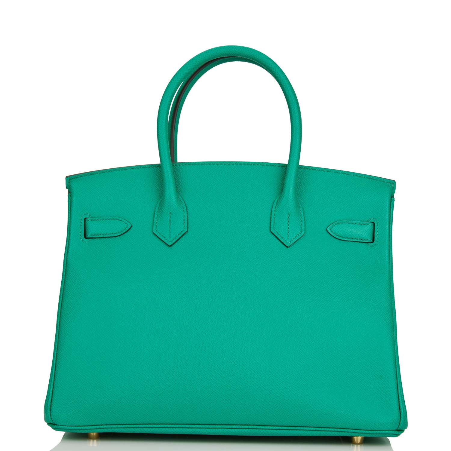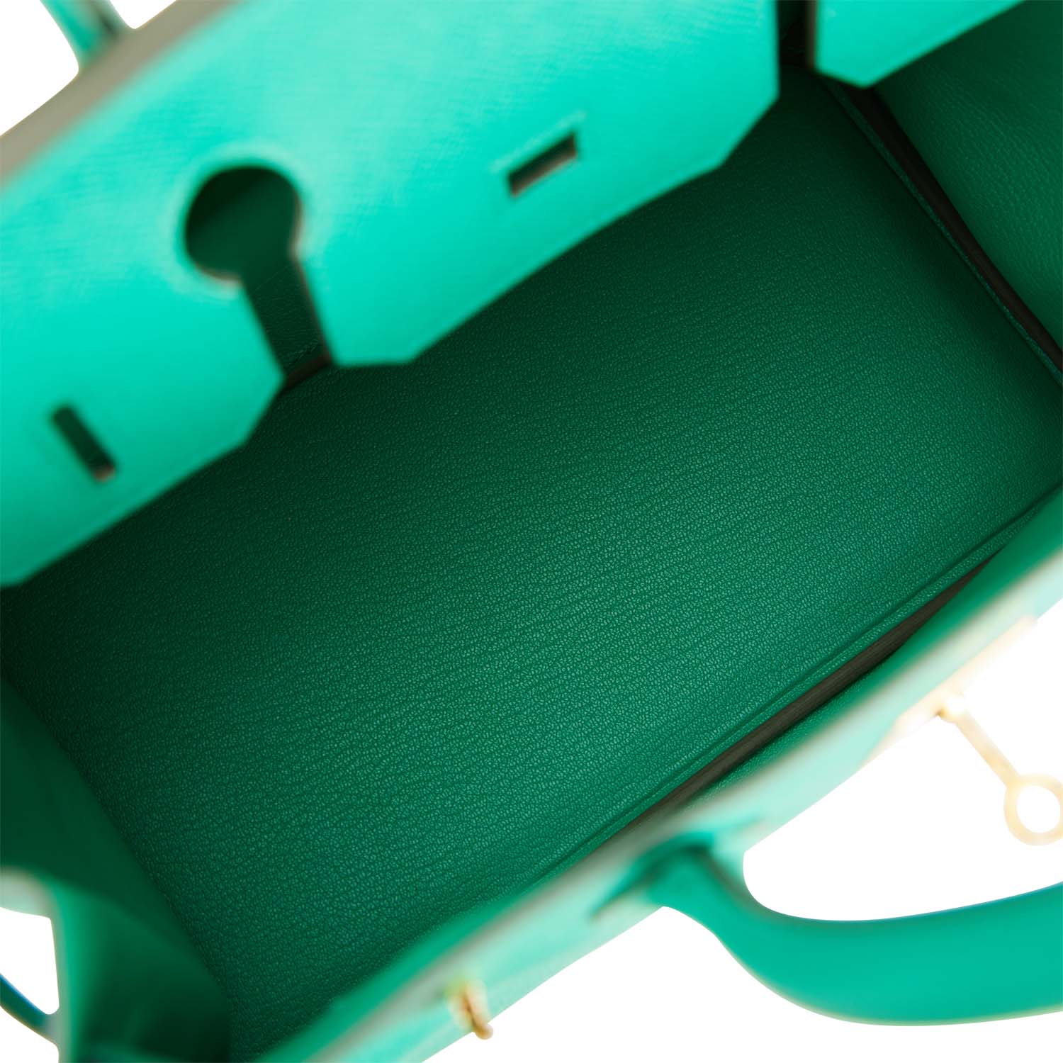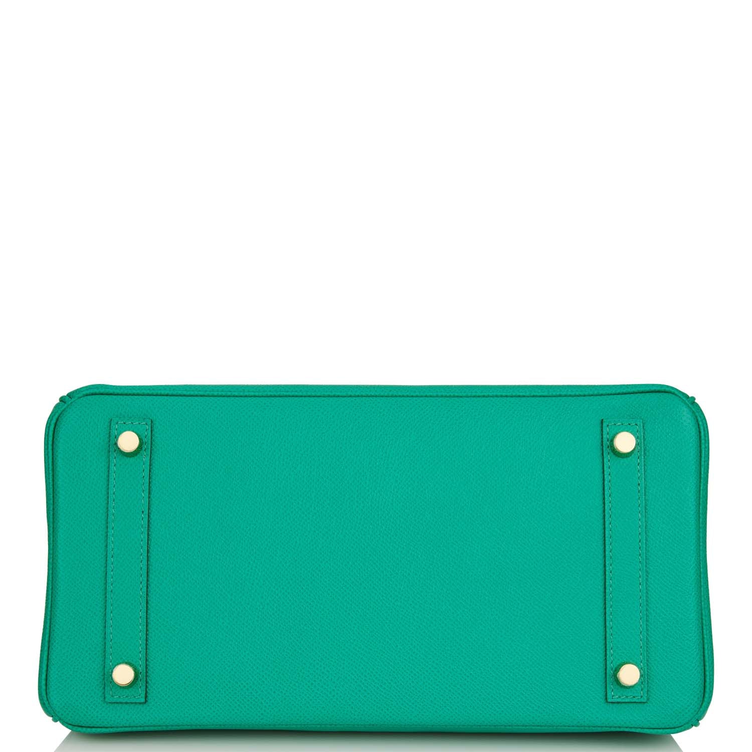 This Birkin is in Vert Jade epsom leather with gold hardware and has tonal stitching, front flap, two straps with center toggle closure, clochette with lock and two keys, and double rolled handles.