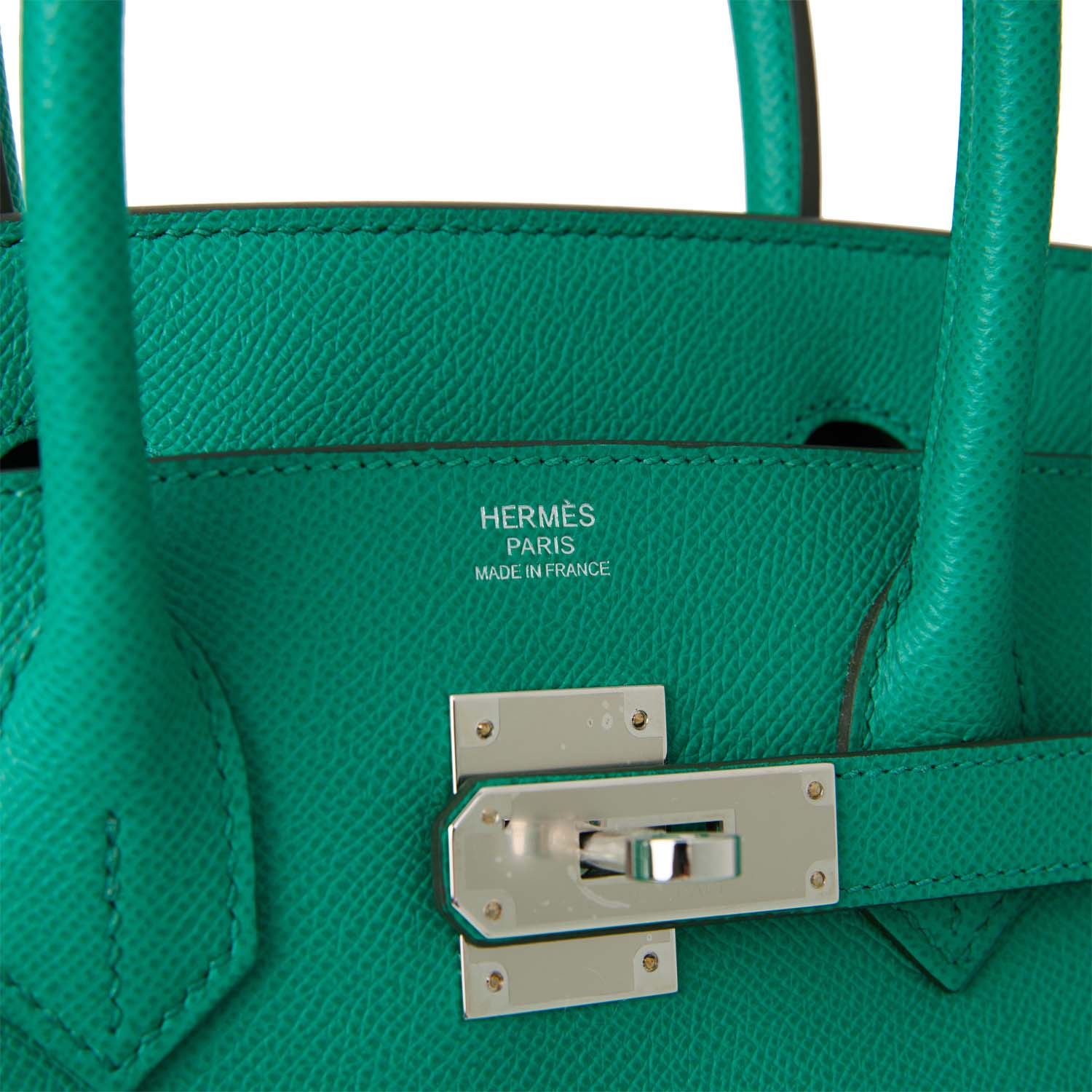This Birkin is in Vert Jade epsom leather with palladium hardware and has tonal stitching, front flap, two straps with center toggle closure, clochette with lock and two keys, and double rolled handles.