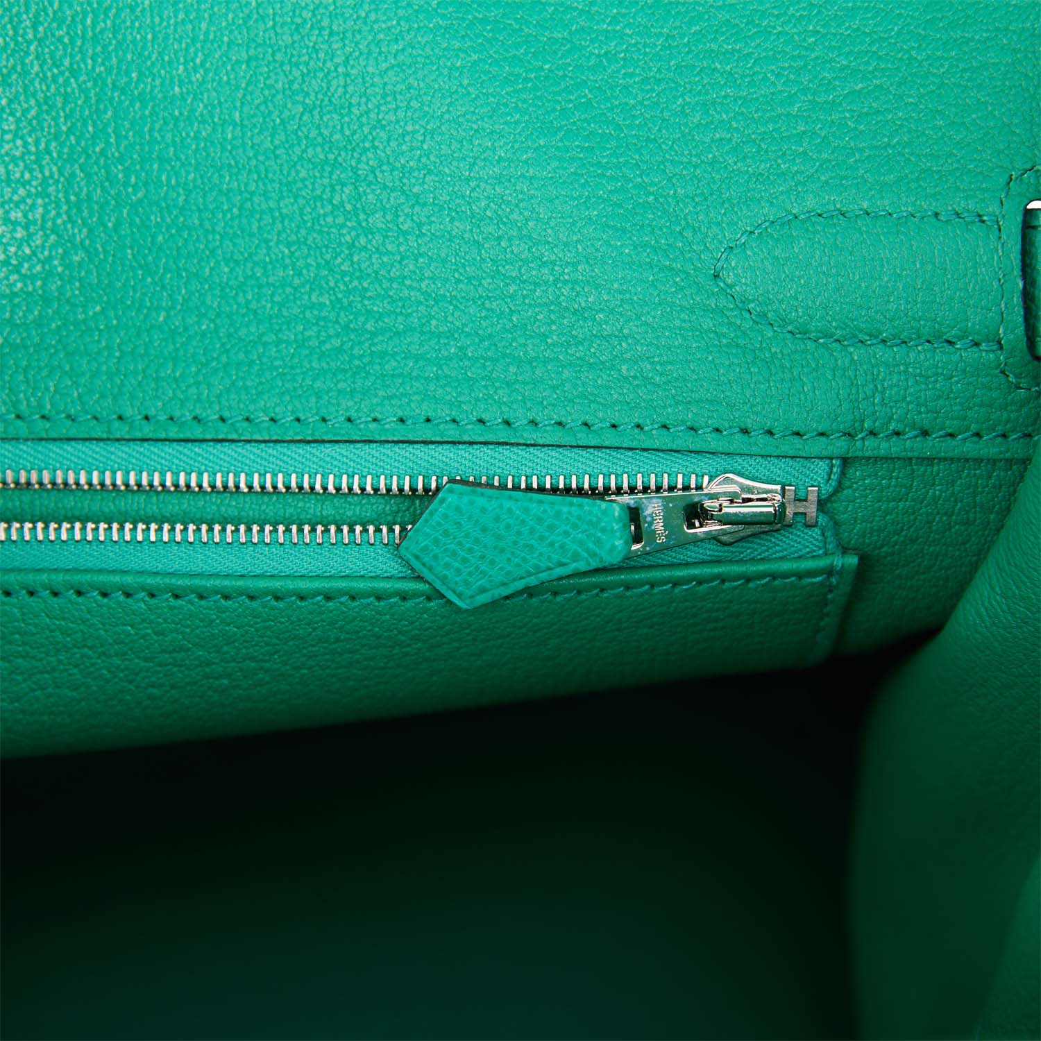 The interior is lined with Vert Jade chevre and has one zip pocket with an Hermes engraved zipper pull and an open pocket on the opposite side.