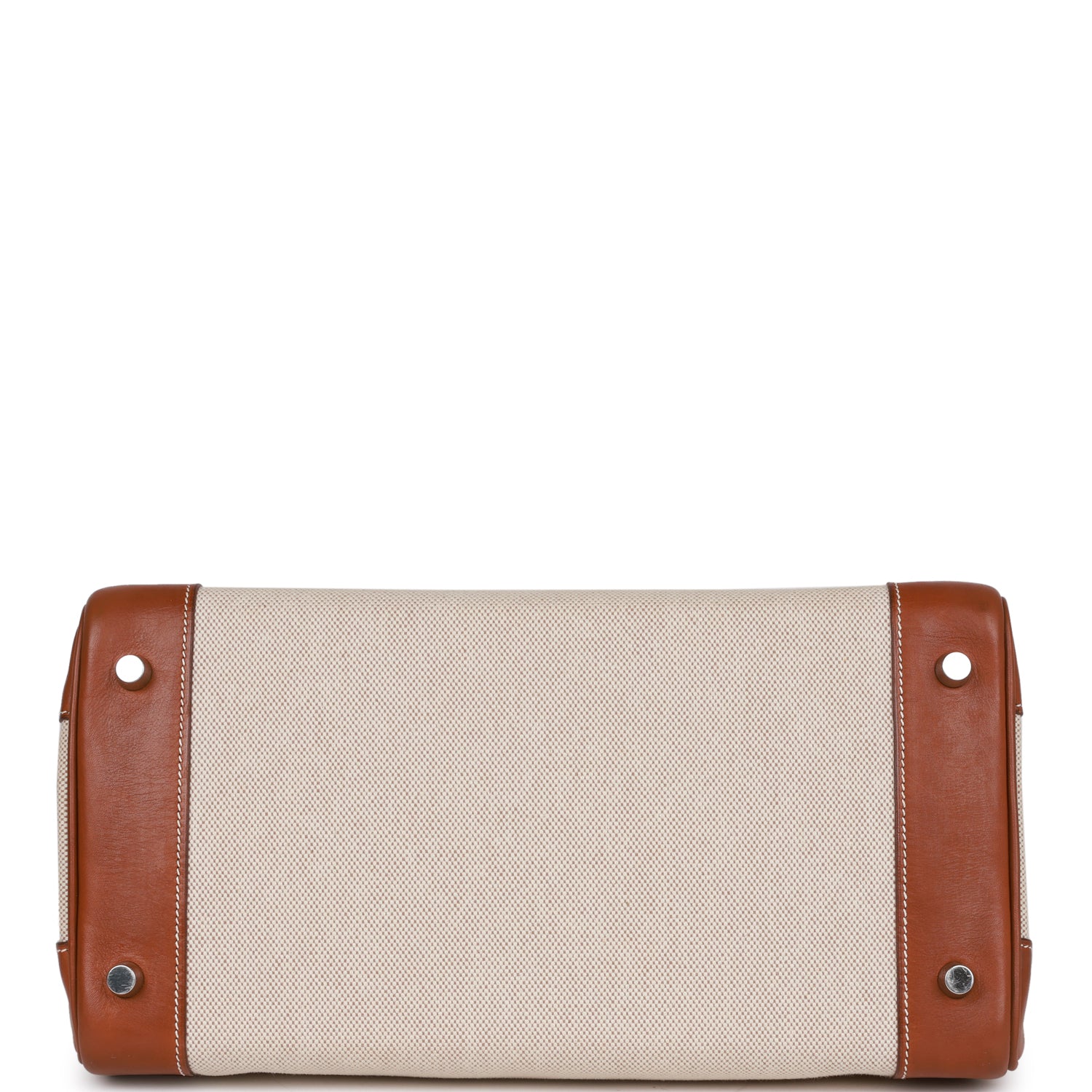 This HAC Birkin 32 is in Toile H and Barenia leather with palladium hardware and has contrast stitching, two straps with front toggle closure, clochette with lock and two keys and double rolled handles.