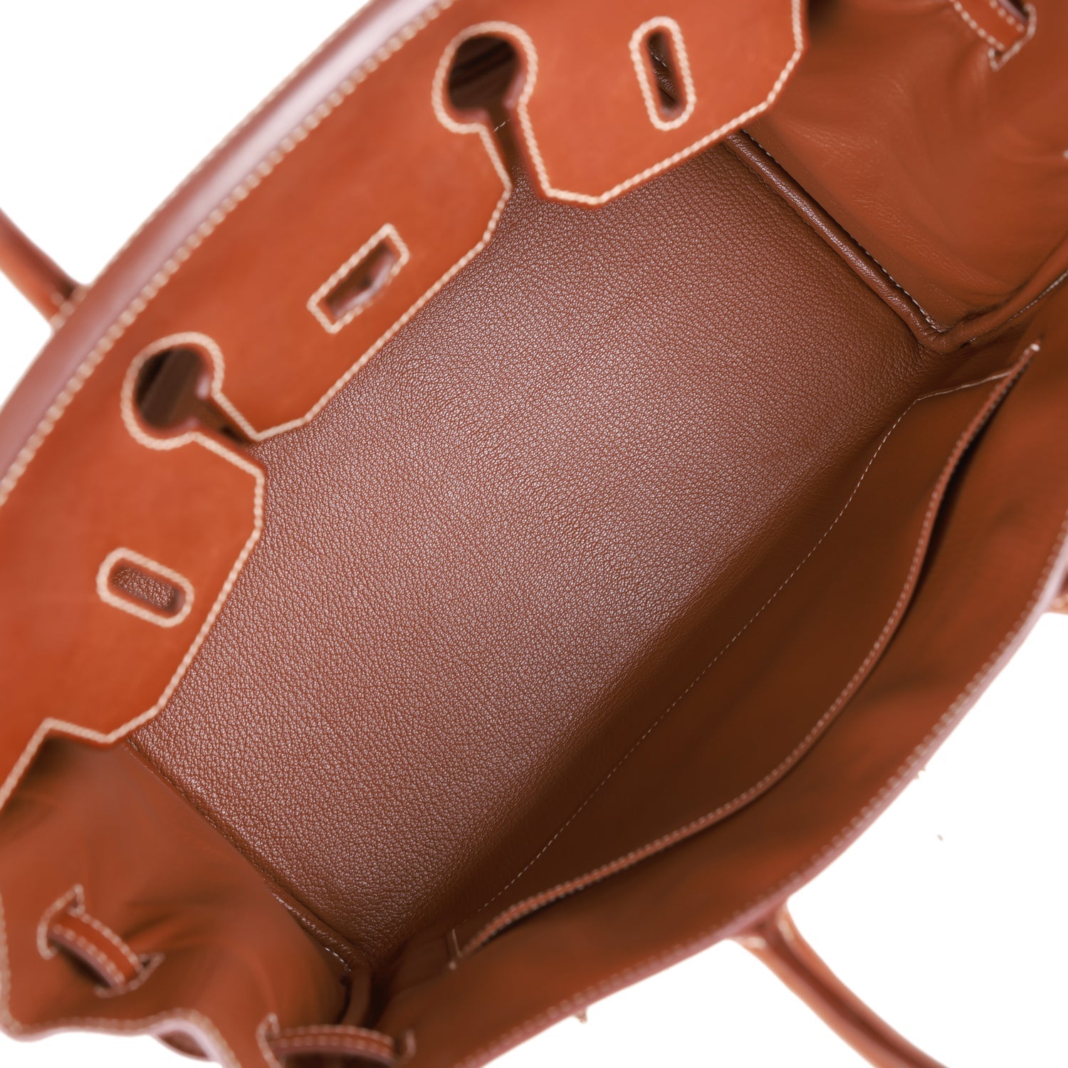 The interior is lined in Fauve chevre leather and features one zip pocket with Hermes engraved pull; pocket on opposite side.