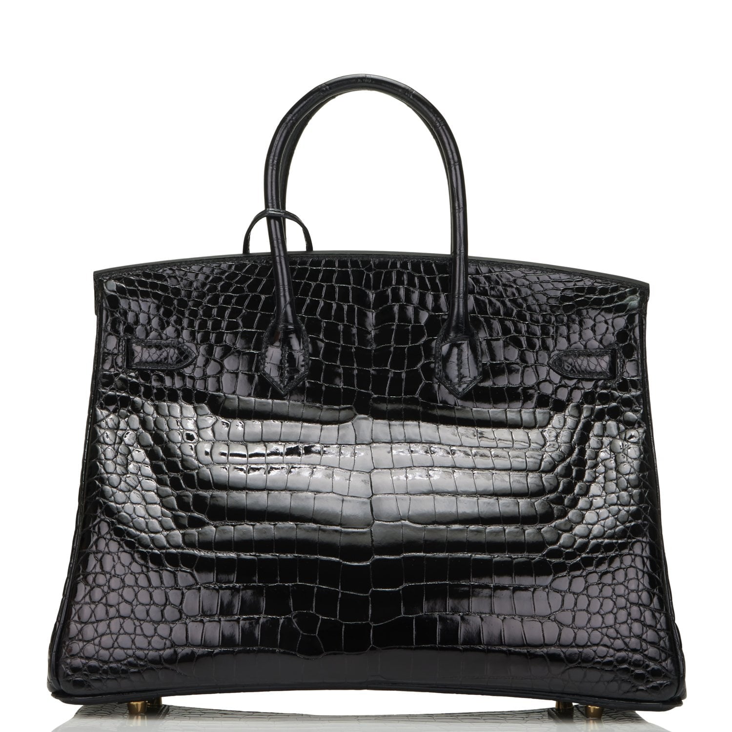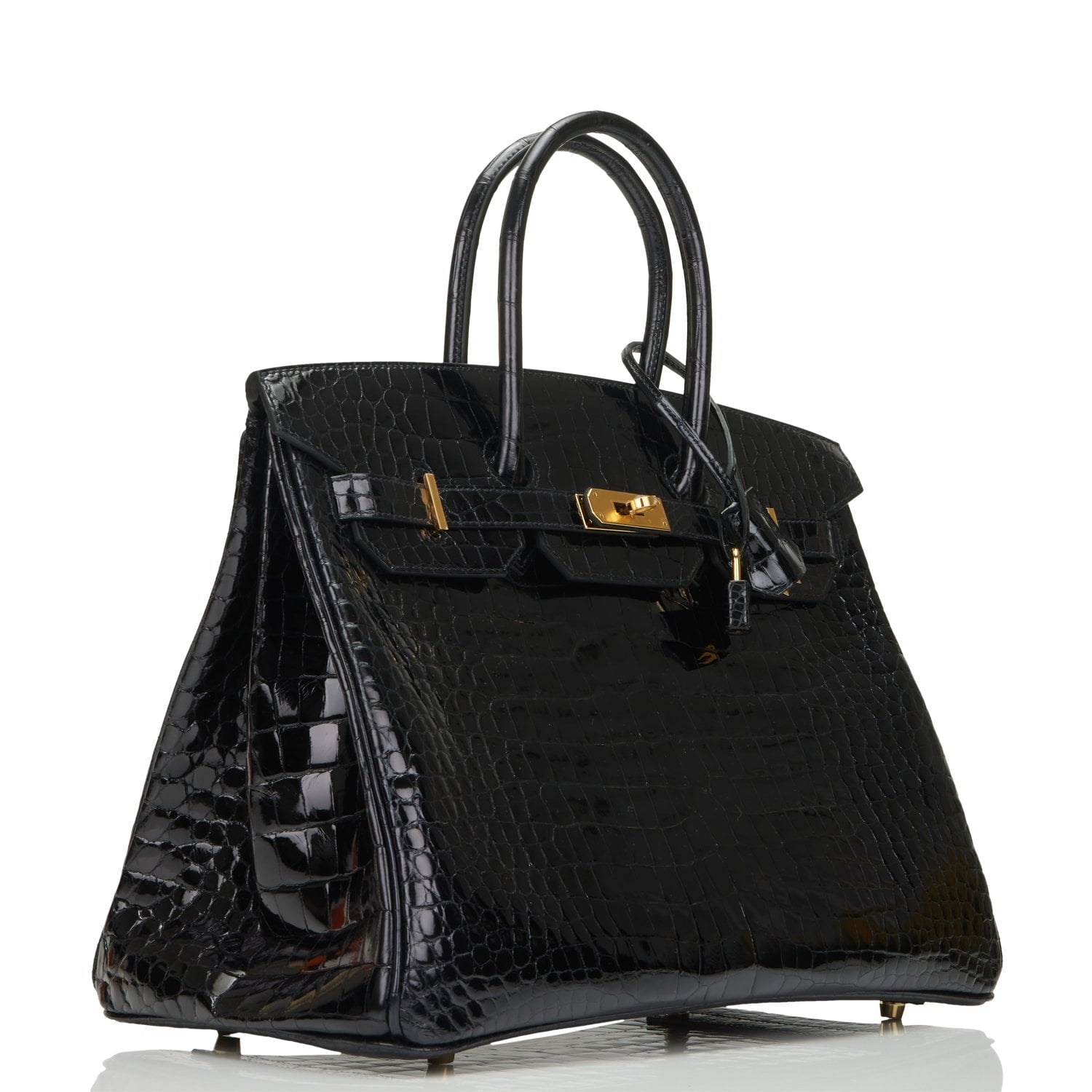 This Birkin is of black shiny Porosus crocodile with gold hardware and features tonal stitching, front flap, two straps with center toggle closure, clochette with lock and two keys, and double rolled handles.
