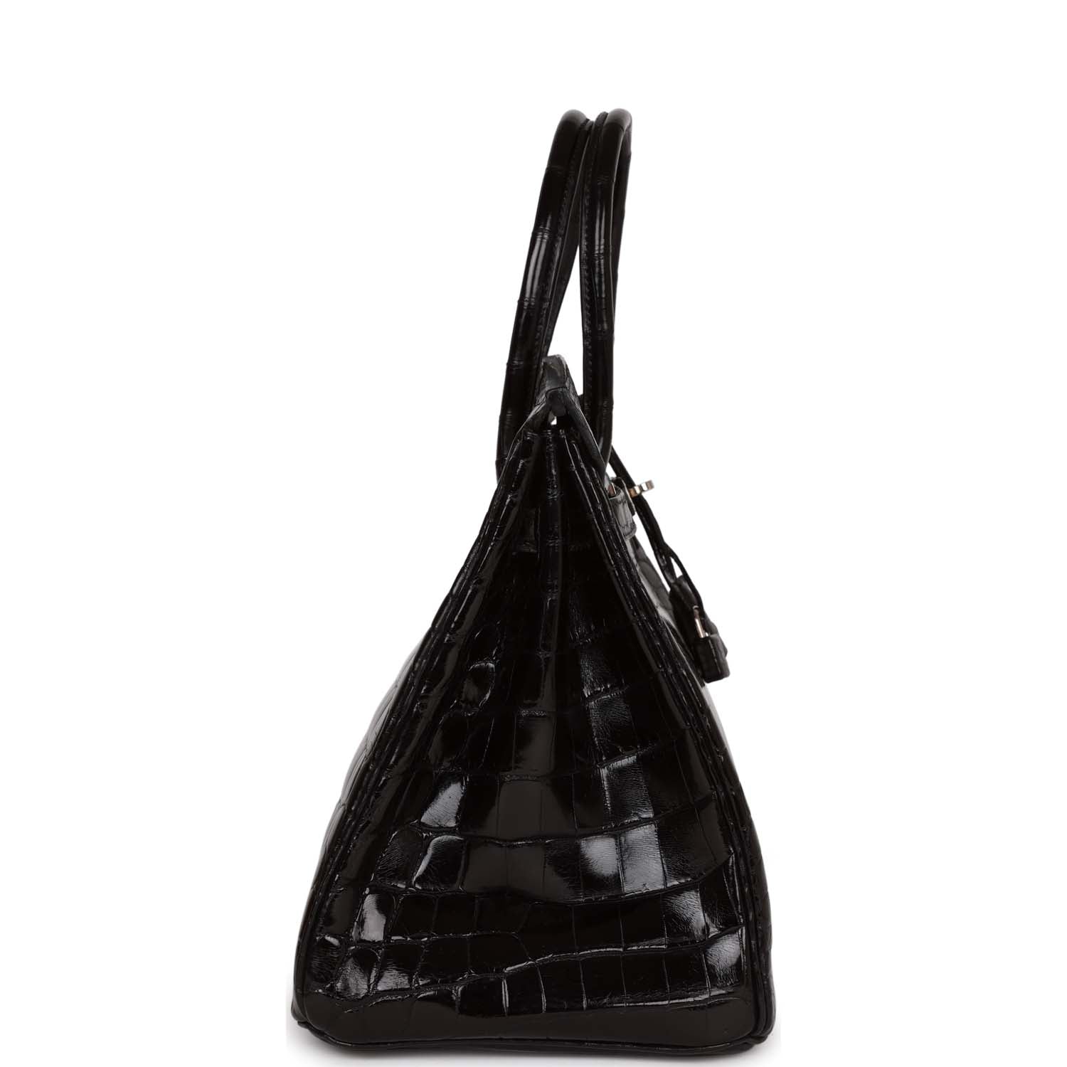 This Birkin is of black shiny Porosus crocodile with palladium hardware and features tonal stitching, front flap, two straps with center toggle closure, clochette with lock and two keys, and double rolled handles.