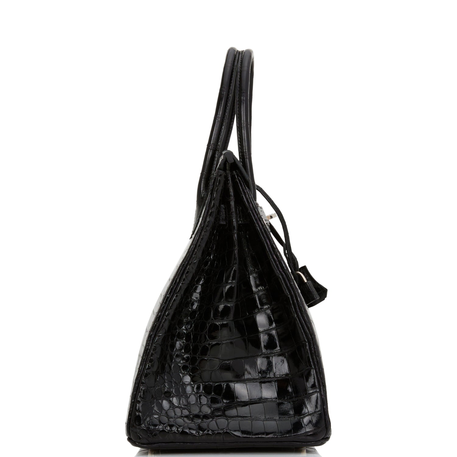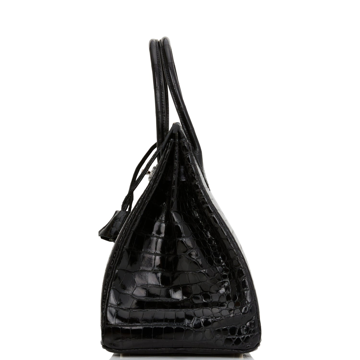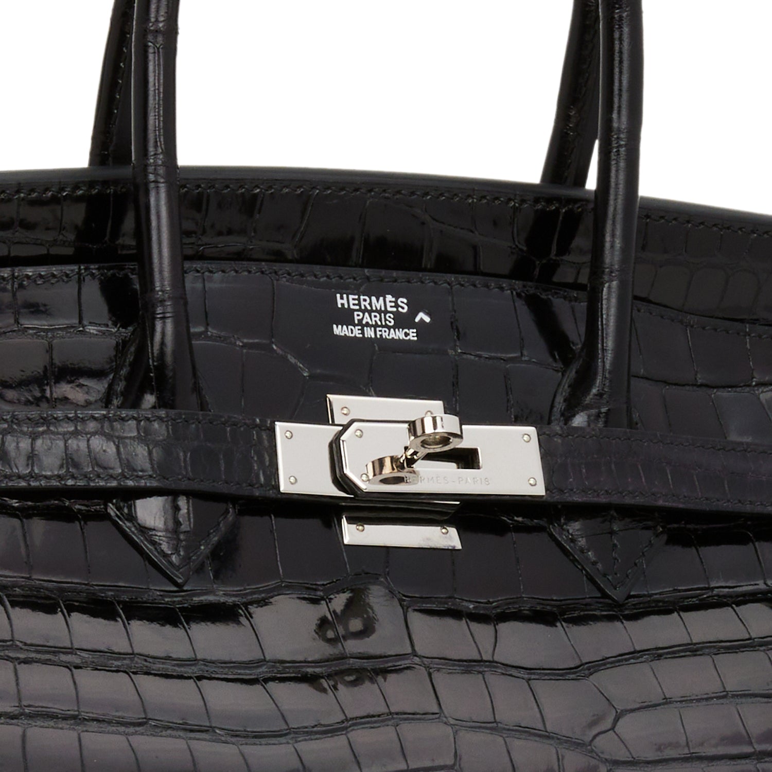 This Birkin is of black shiny Porosus crocodile with palladium hardware and features tonal stitching, front flap, two straps with center toggle closure, clochette with lock and two keys, and double rolled handles.