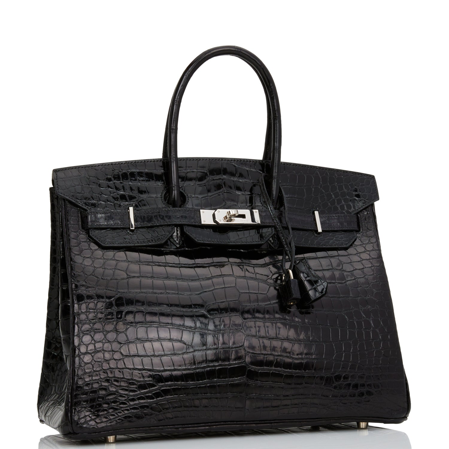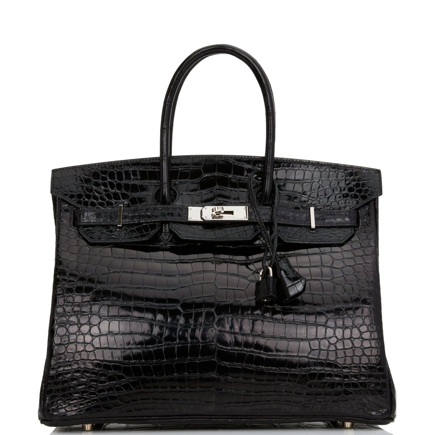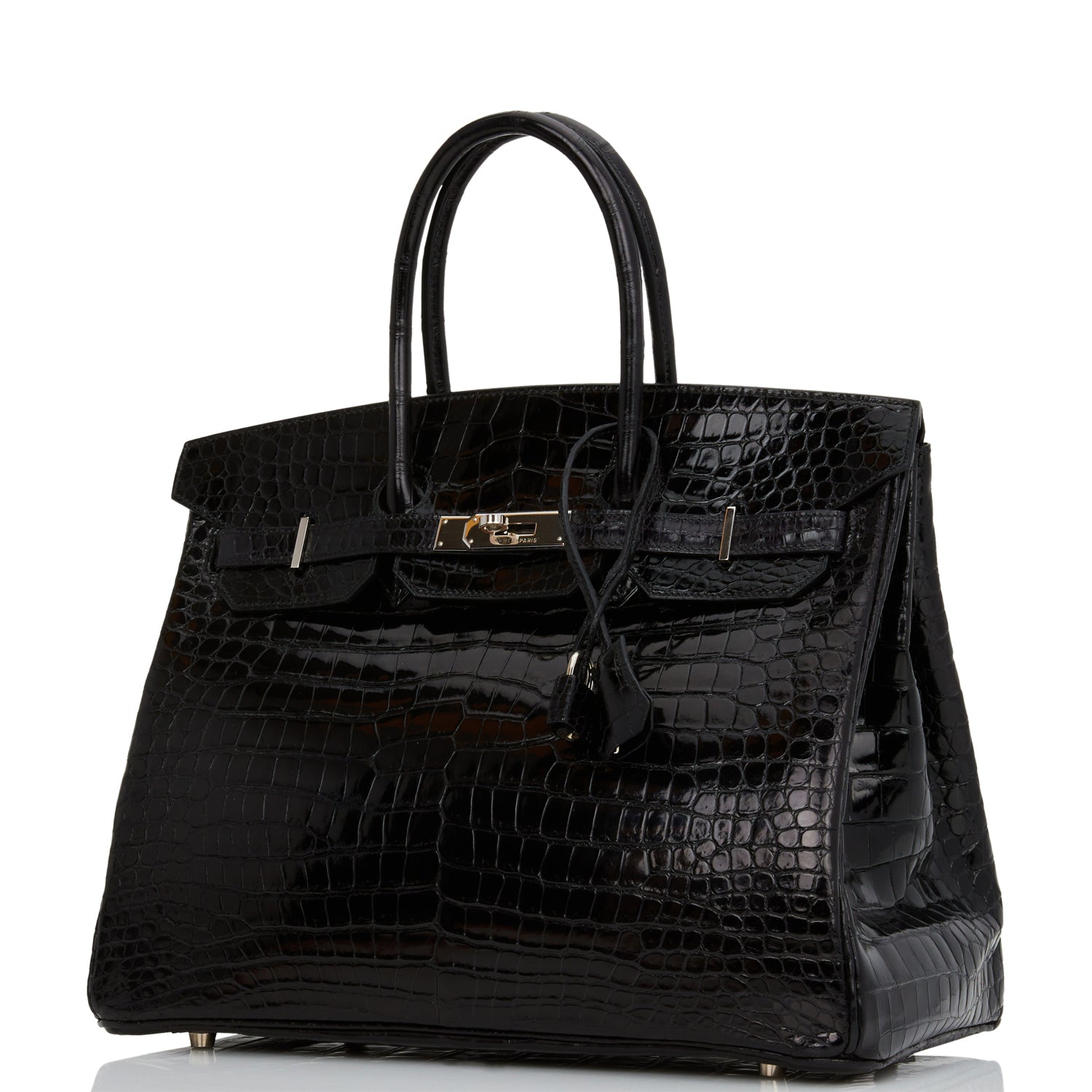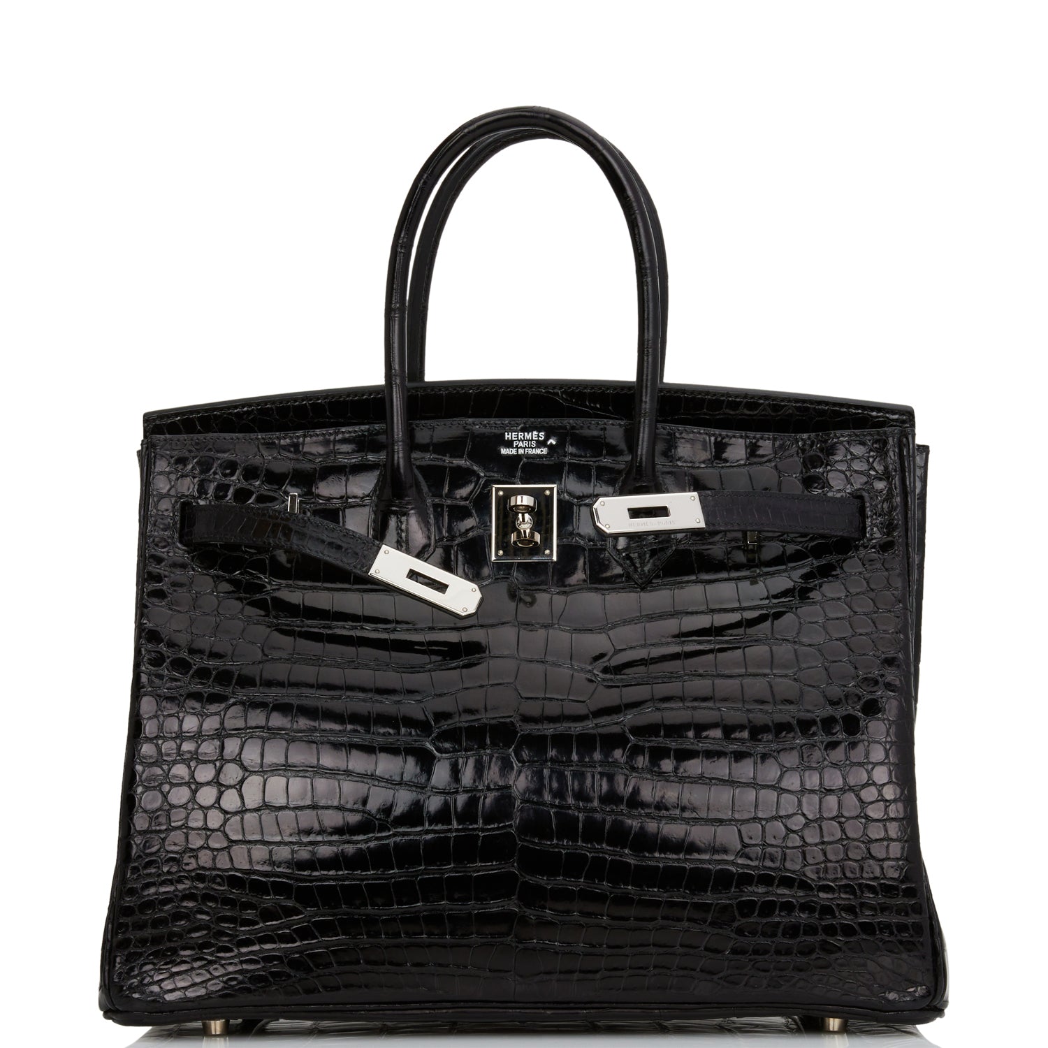 This Birkin is of black shiny Porosus crocodile with palladium hardware and features tonal stitching, front flap, two straps with center toggle closure, clochette with lock and two keys, and double rolled handles.