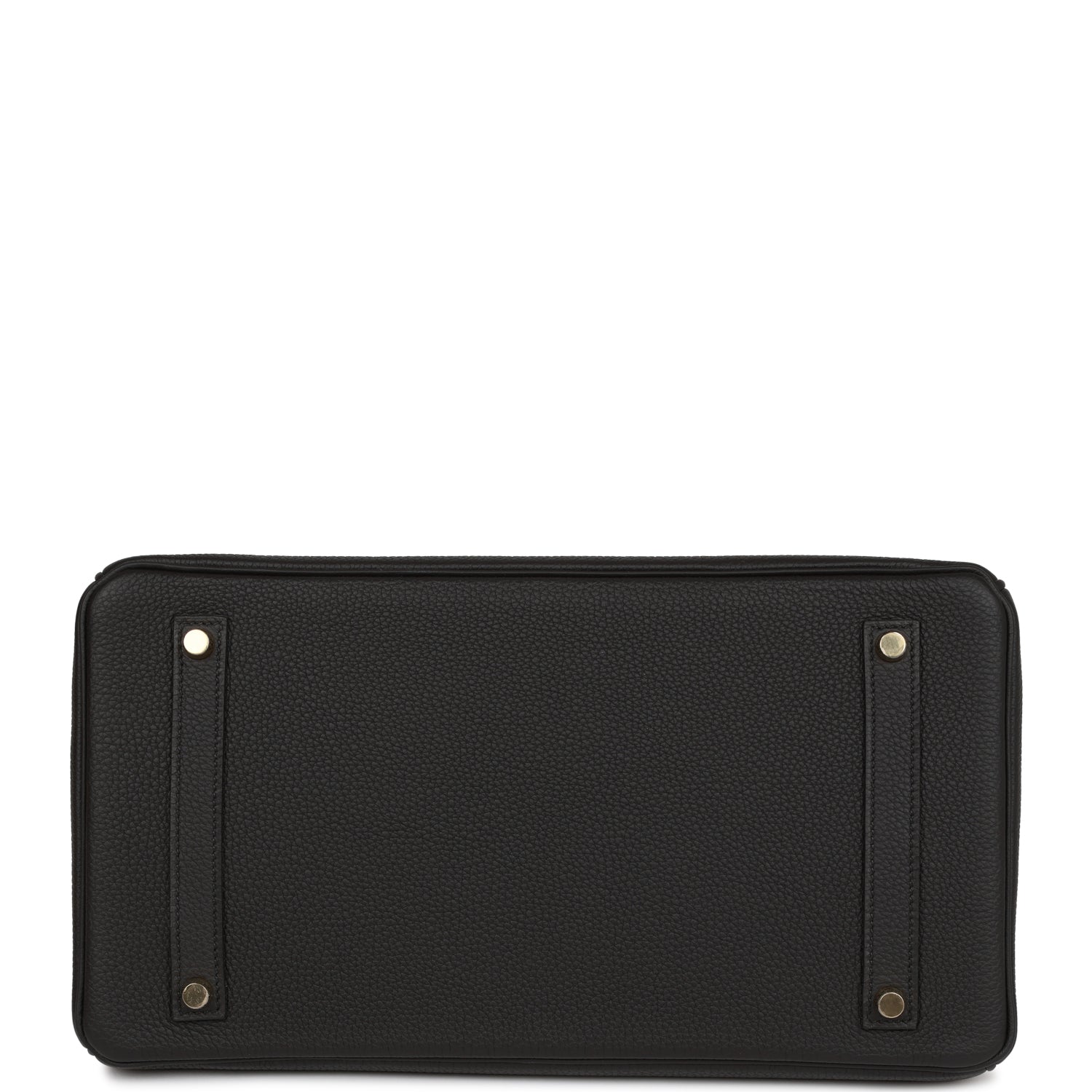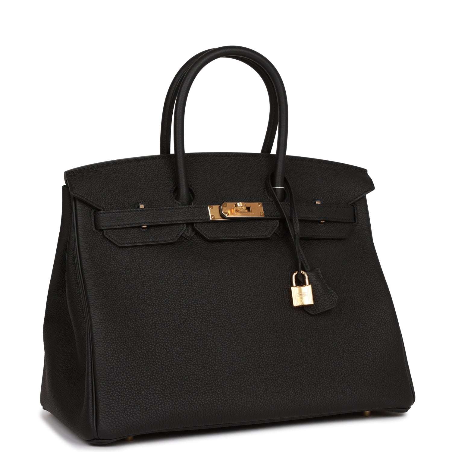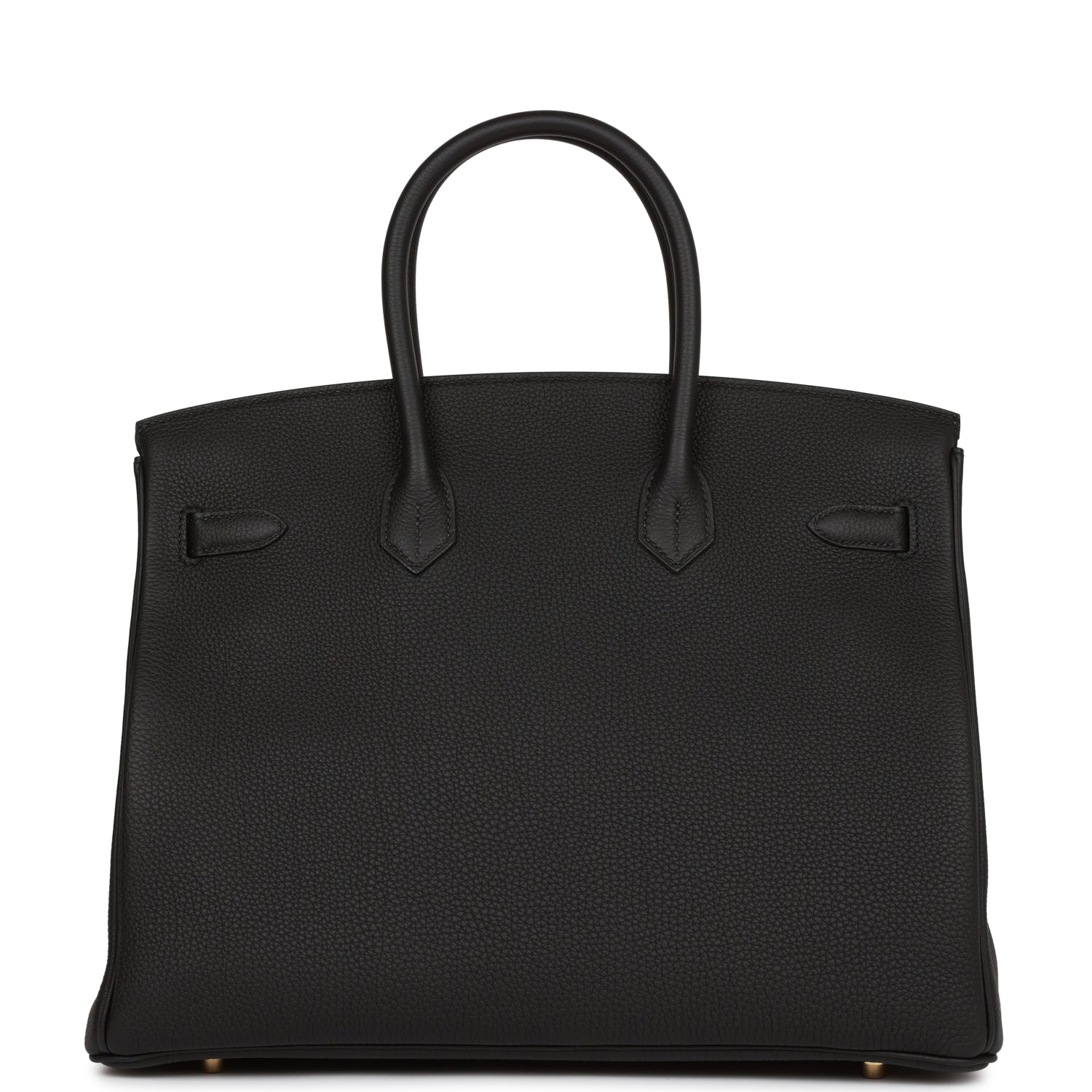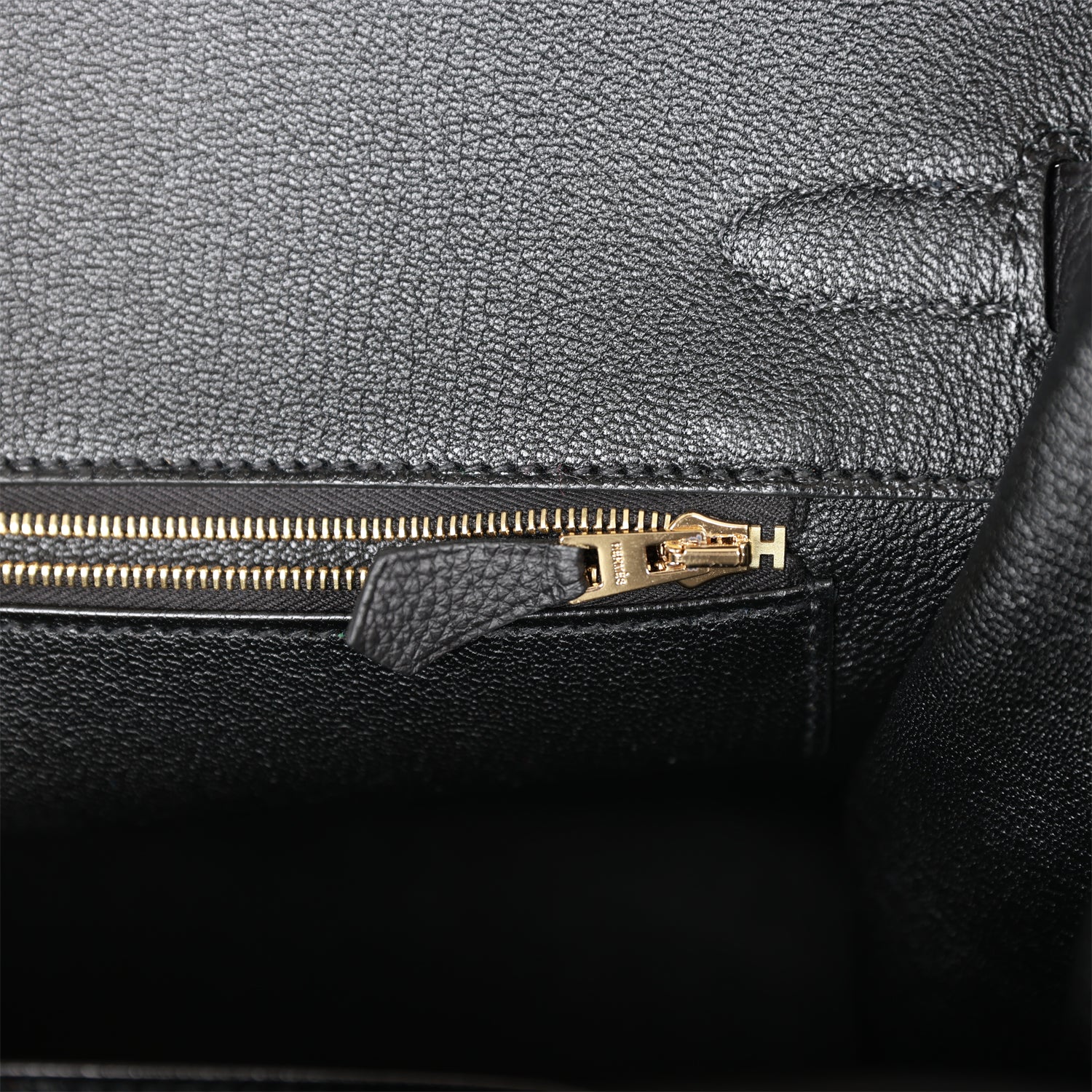 This Birkin is in Black togo leather with gold hardware and has tonal stitching, front flap, two straps with center toggle closure, clochette with lock and two keys, and double rolled handles.