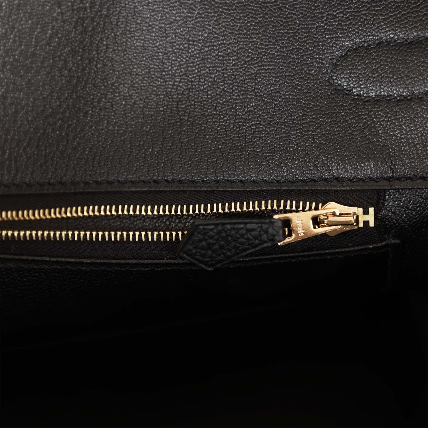 This Birkin is in Black togo leather with gold hardware and has tonal stitching, front flap, two straps with center toggle closure, clochette with lock and two keys, and double rolled handles.