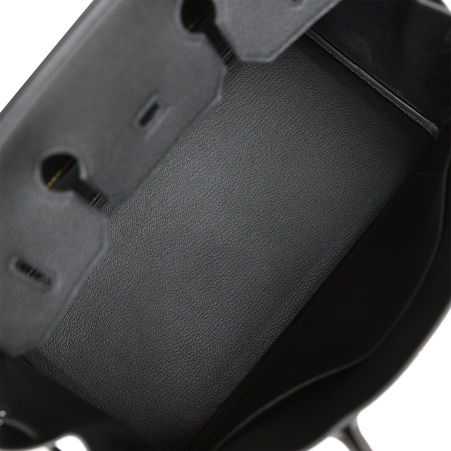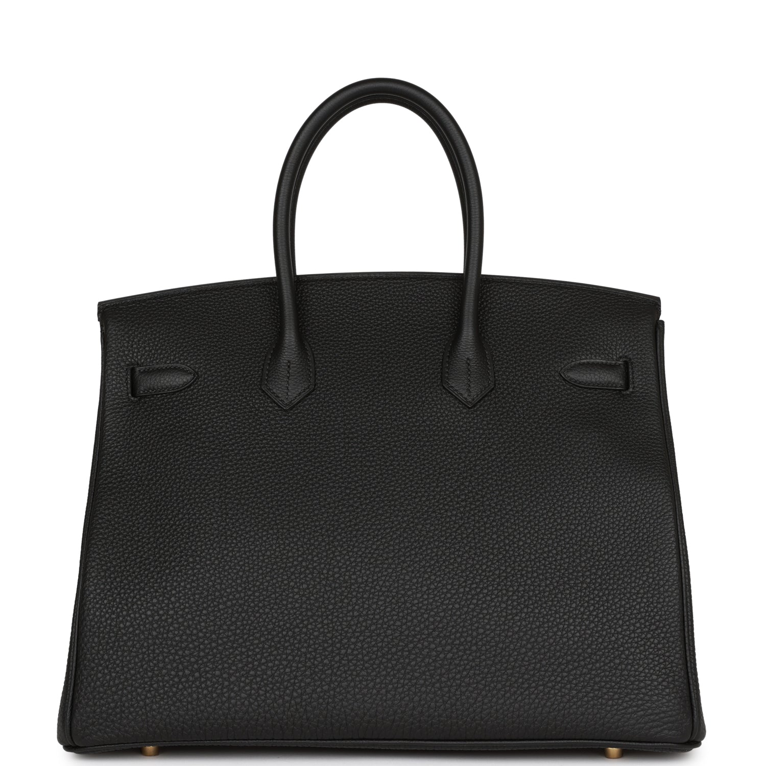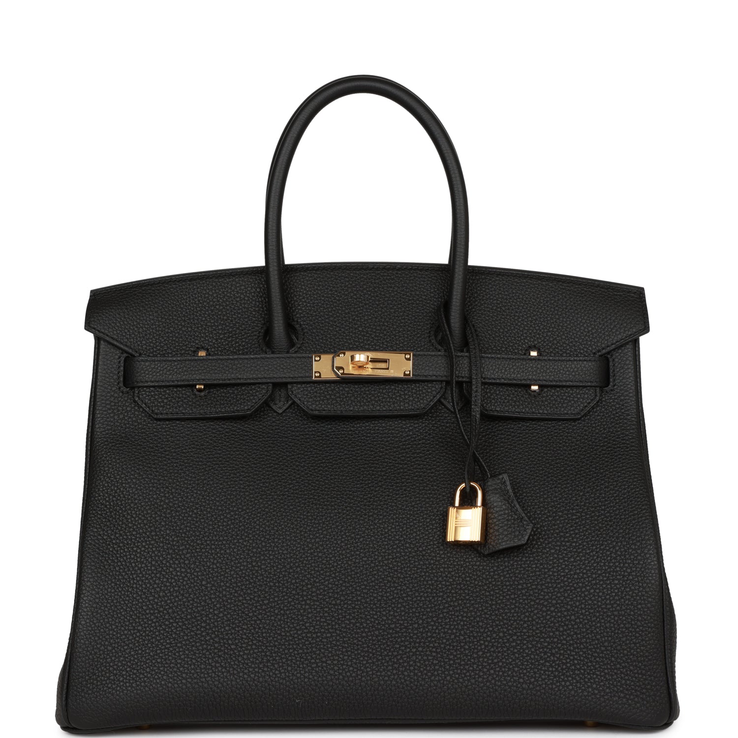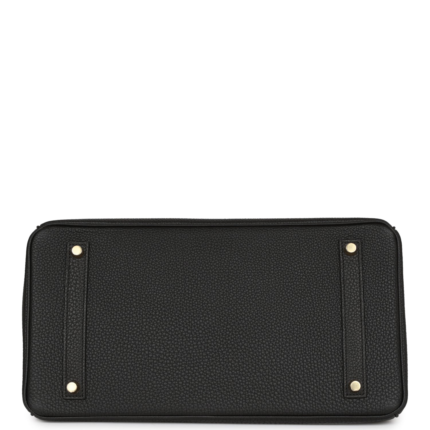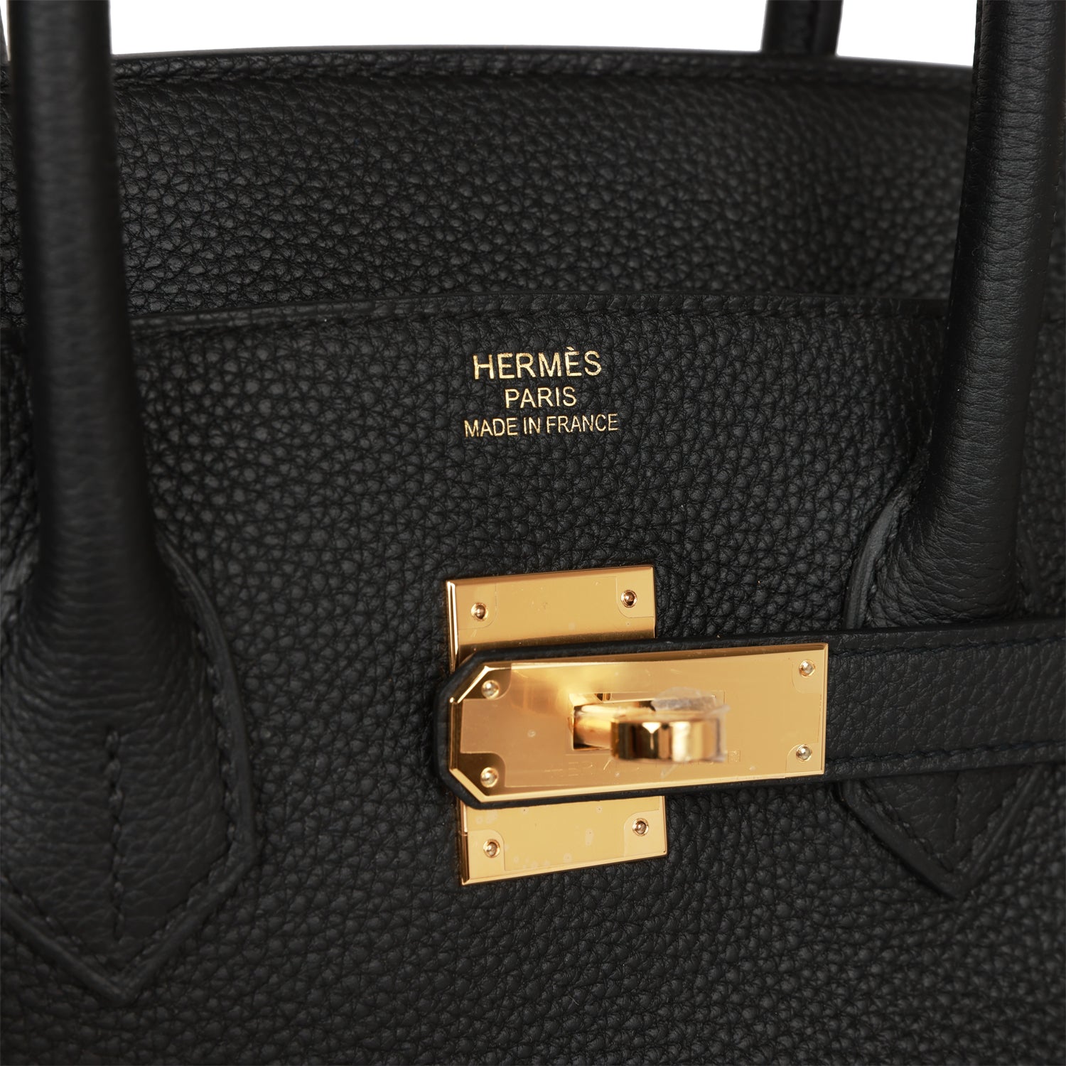 This Birkin is in Black togo leather with gold hardware and has tonal stitching, front flap, two straps with center toggle closure, clochette with lock and two keys, and double rolled handles.