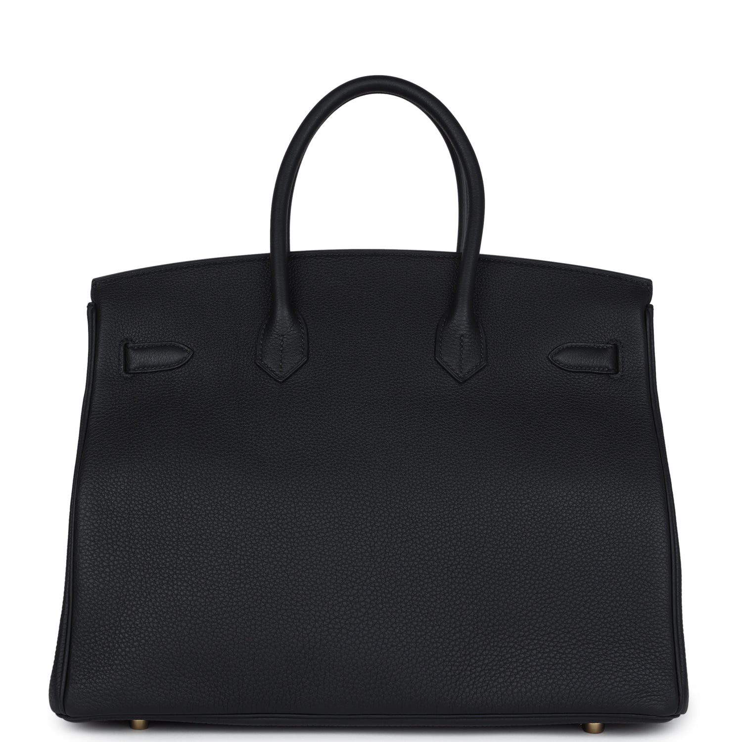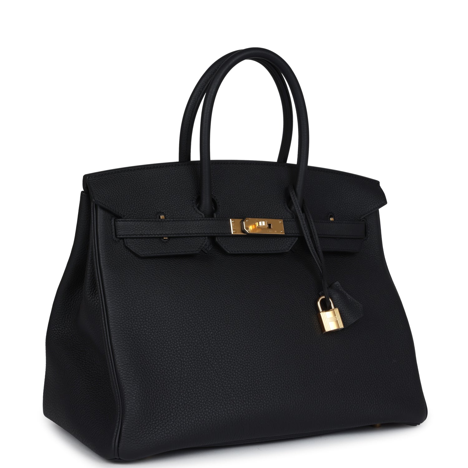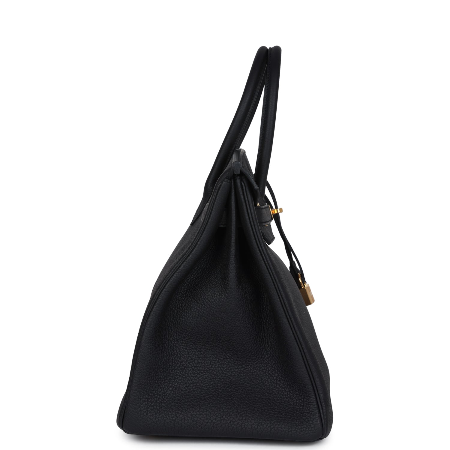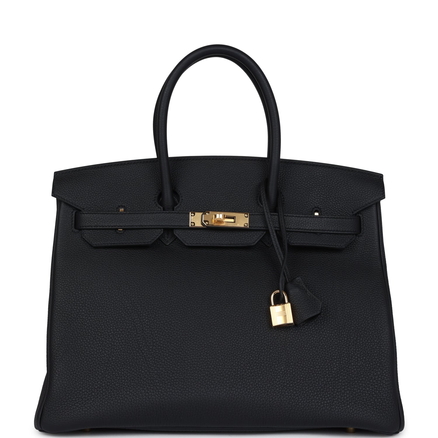 This Birkin is in Black togo leather with gold hardware and has tonal stitching, front flap, two straps with center toggle closure, clochette with lock and two keys, and double rolled handles.