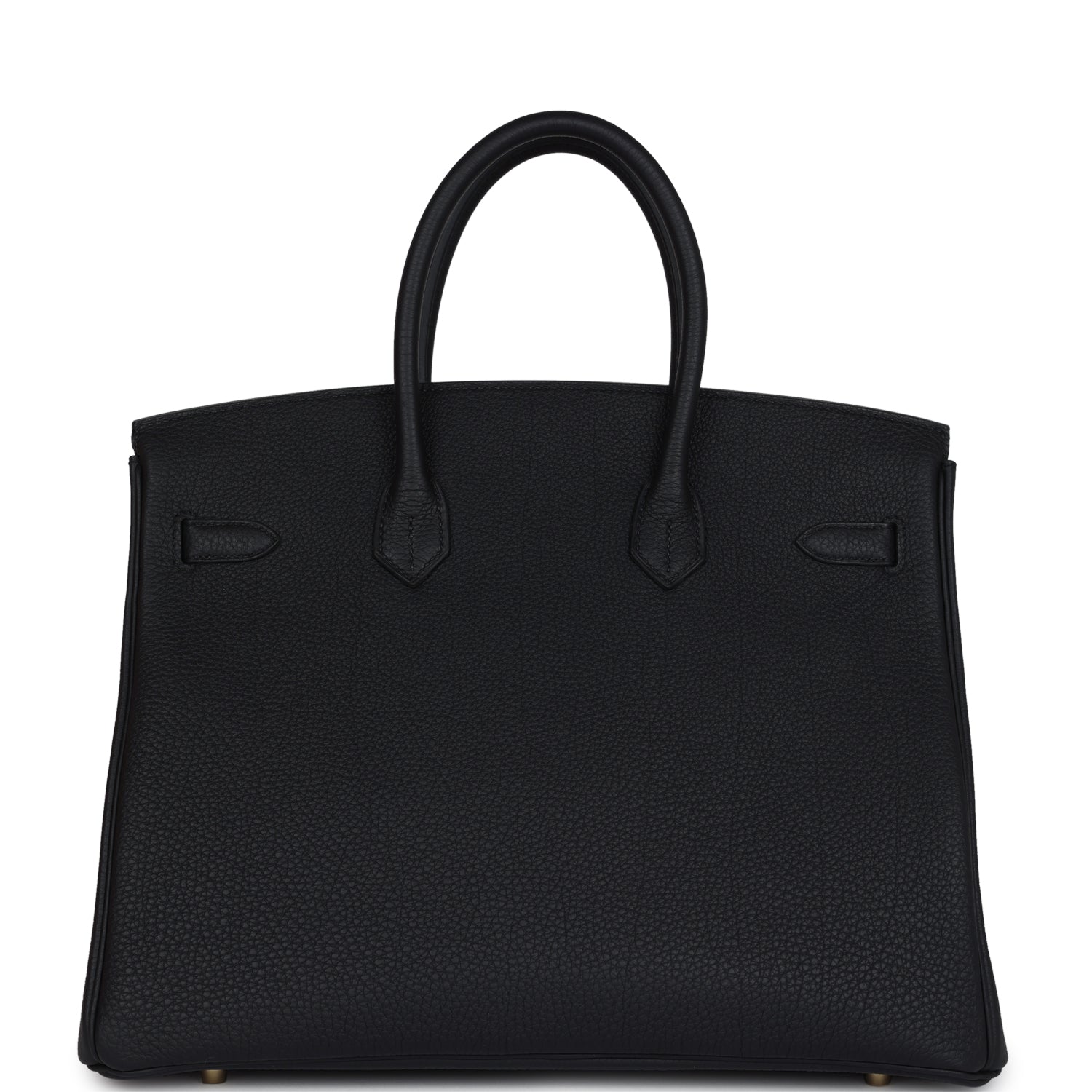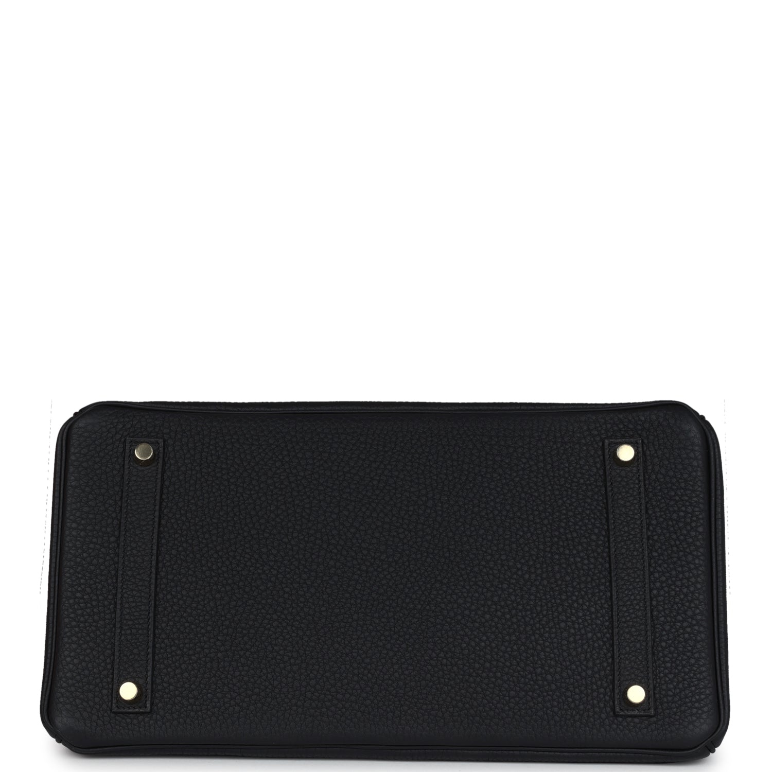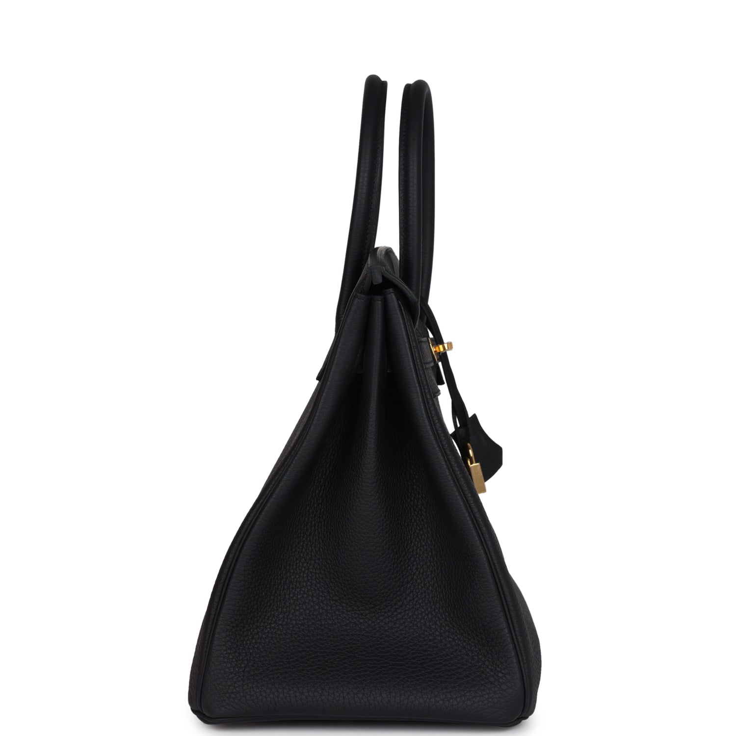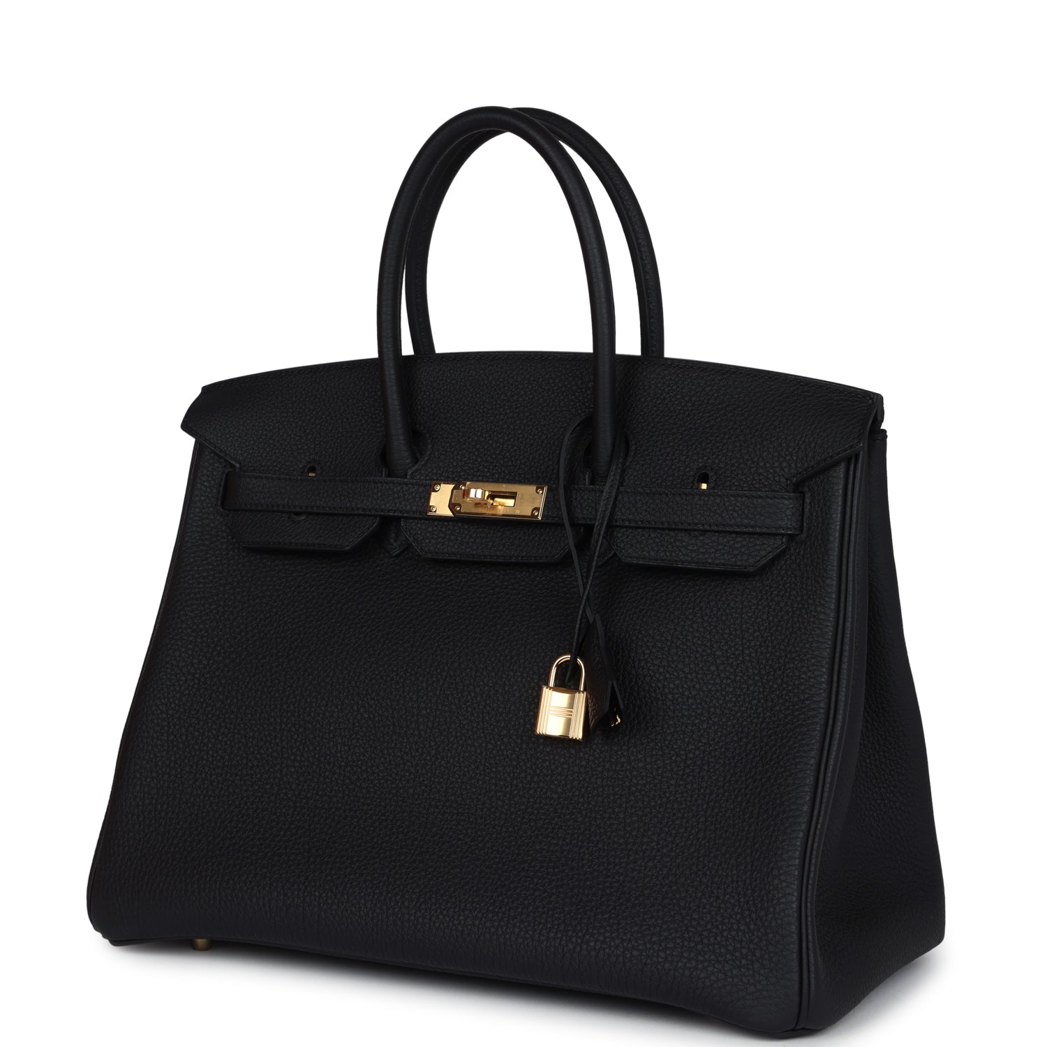 This Birkin is in Black togo leather with gold hardware and has tonal stitching, front flap, two straps with center toggle closure, clochette with lock and two keys, and double rolled handles.