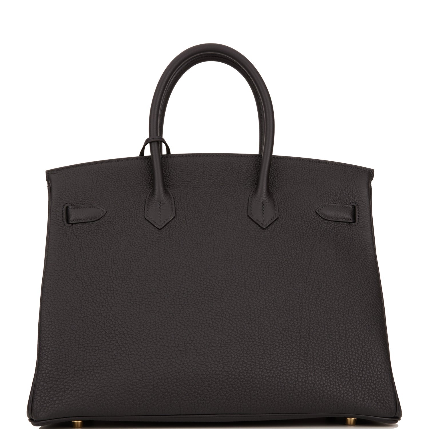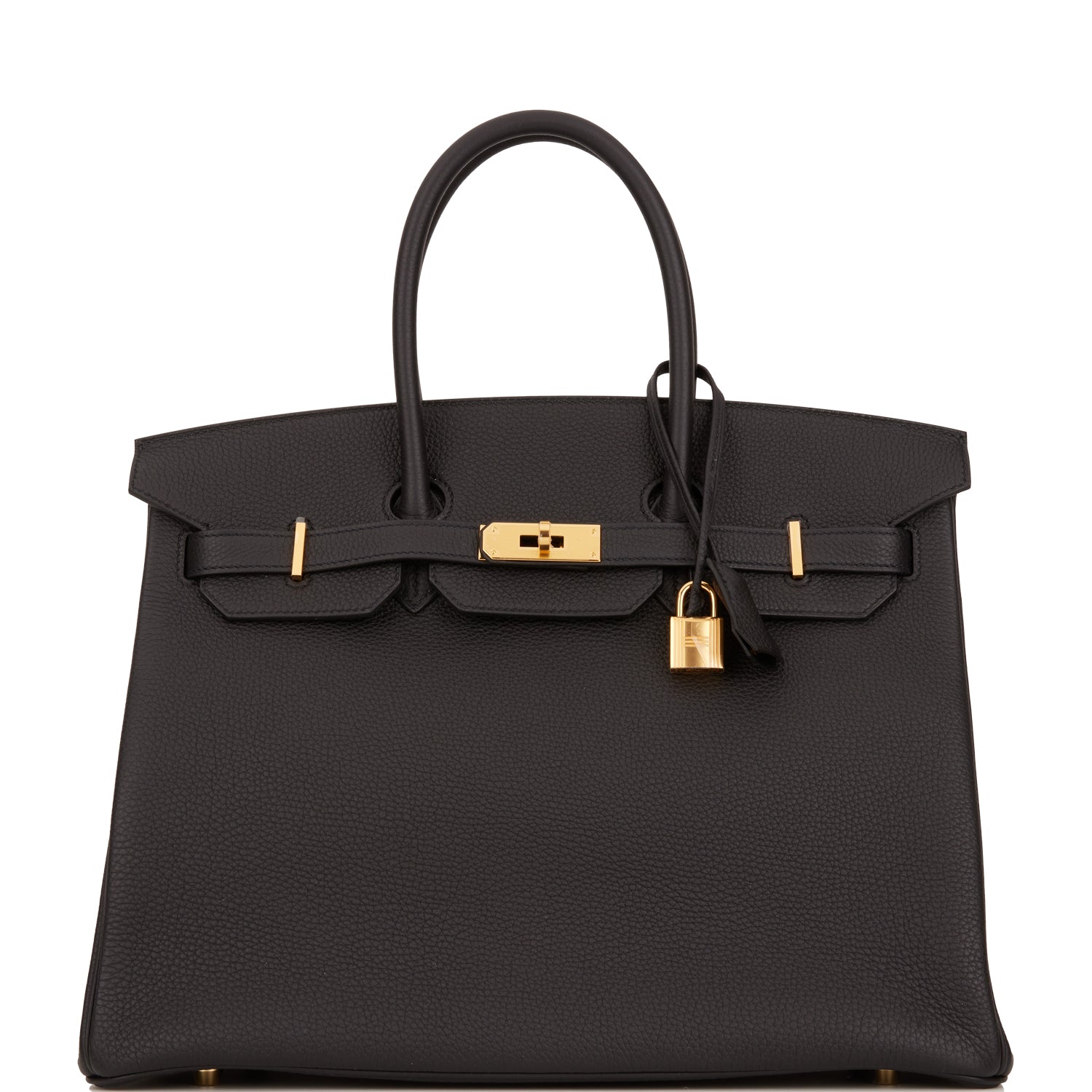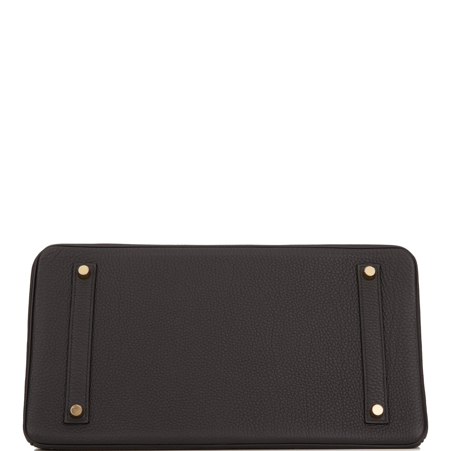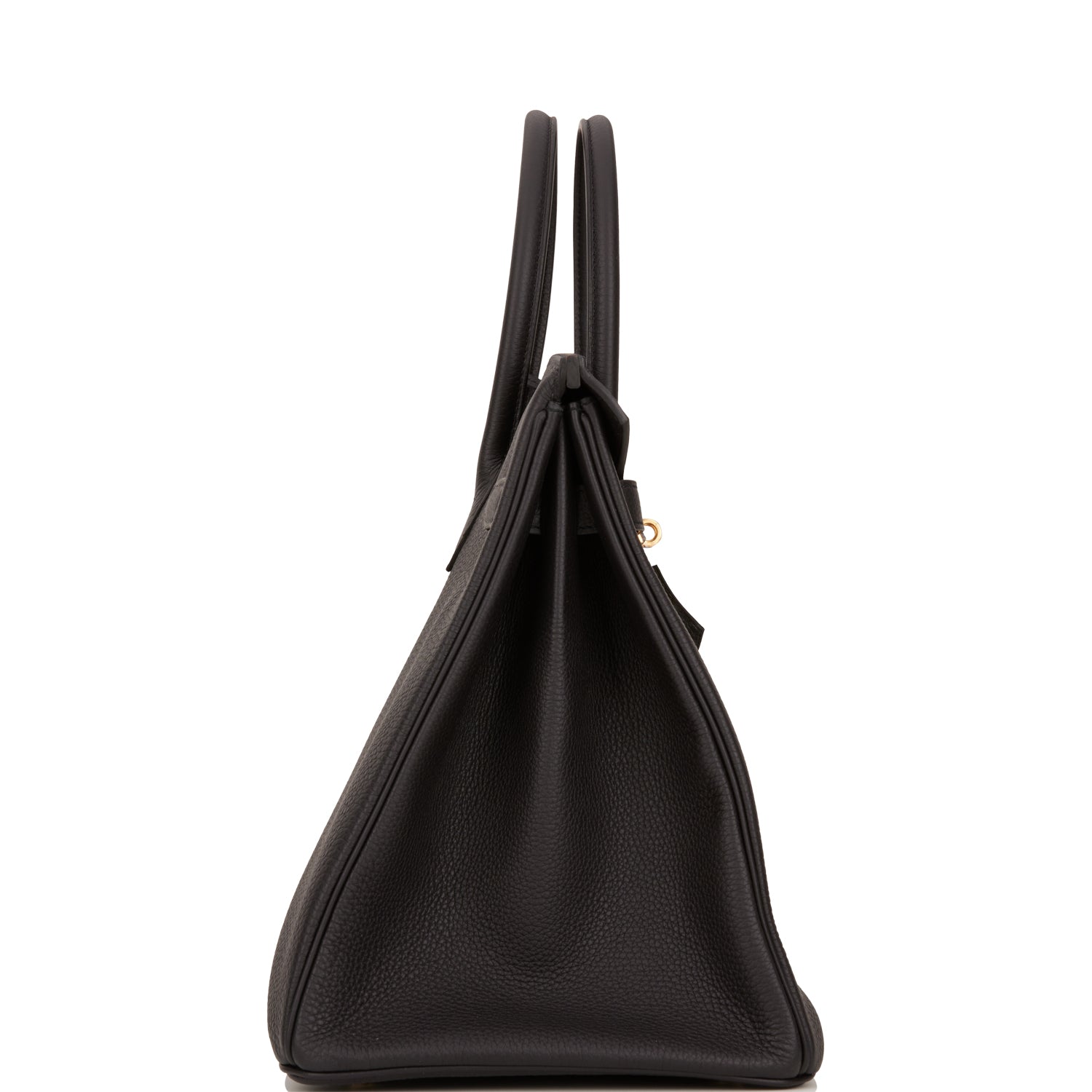 This Birkin is in Black togo leather with gold hardware and has tonal stitching, front flap, two straps with center toggle closure, clochette with lock and two keys, and double rolled handles.