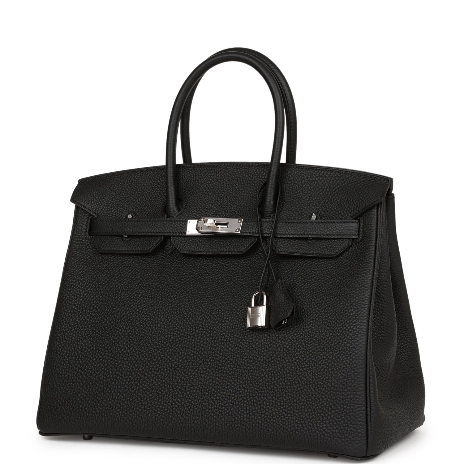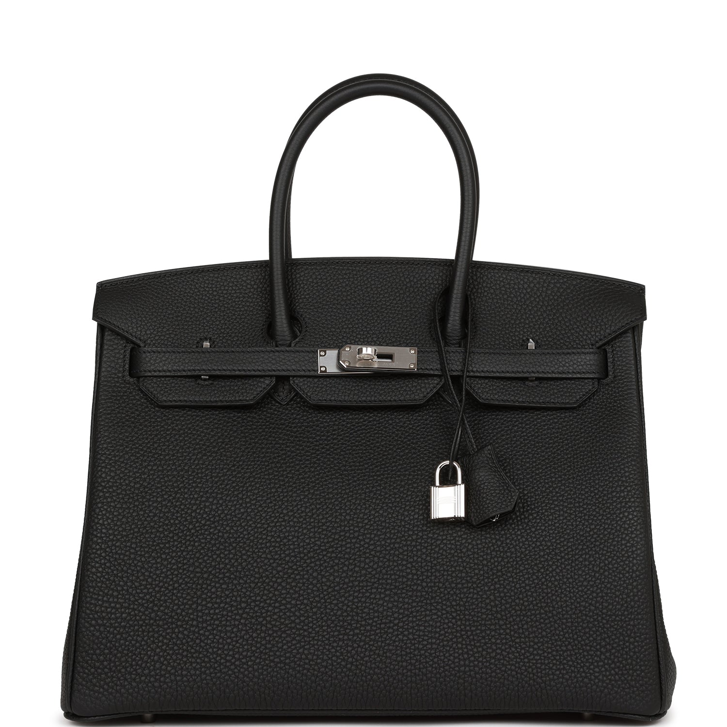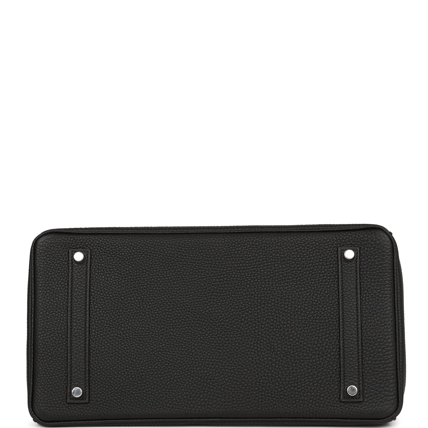This Birkin is in Black togo leather with palladium hardware and has tonal stitching, front flap, two straps with center toggle closure, clochette with lock and two keys, and double rolled handles.