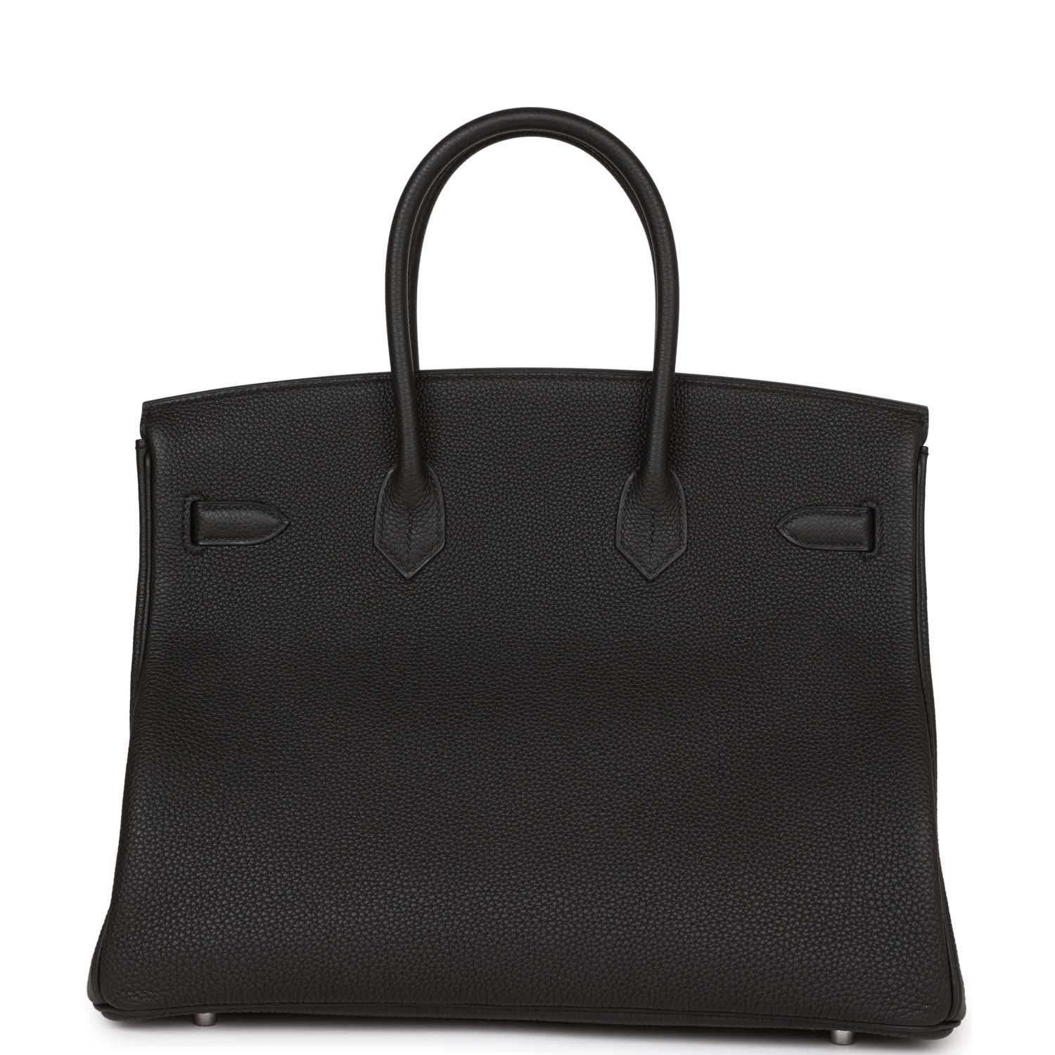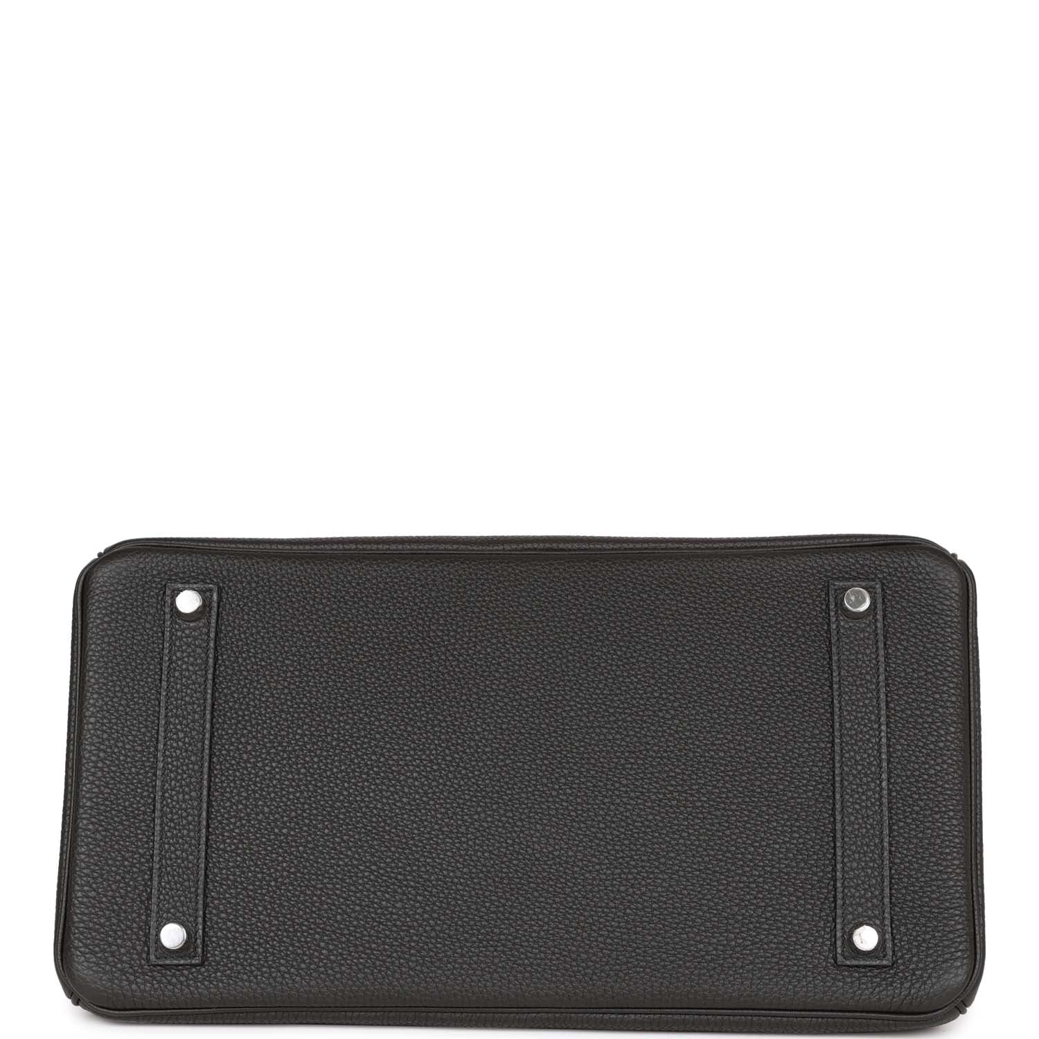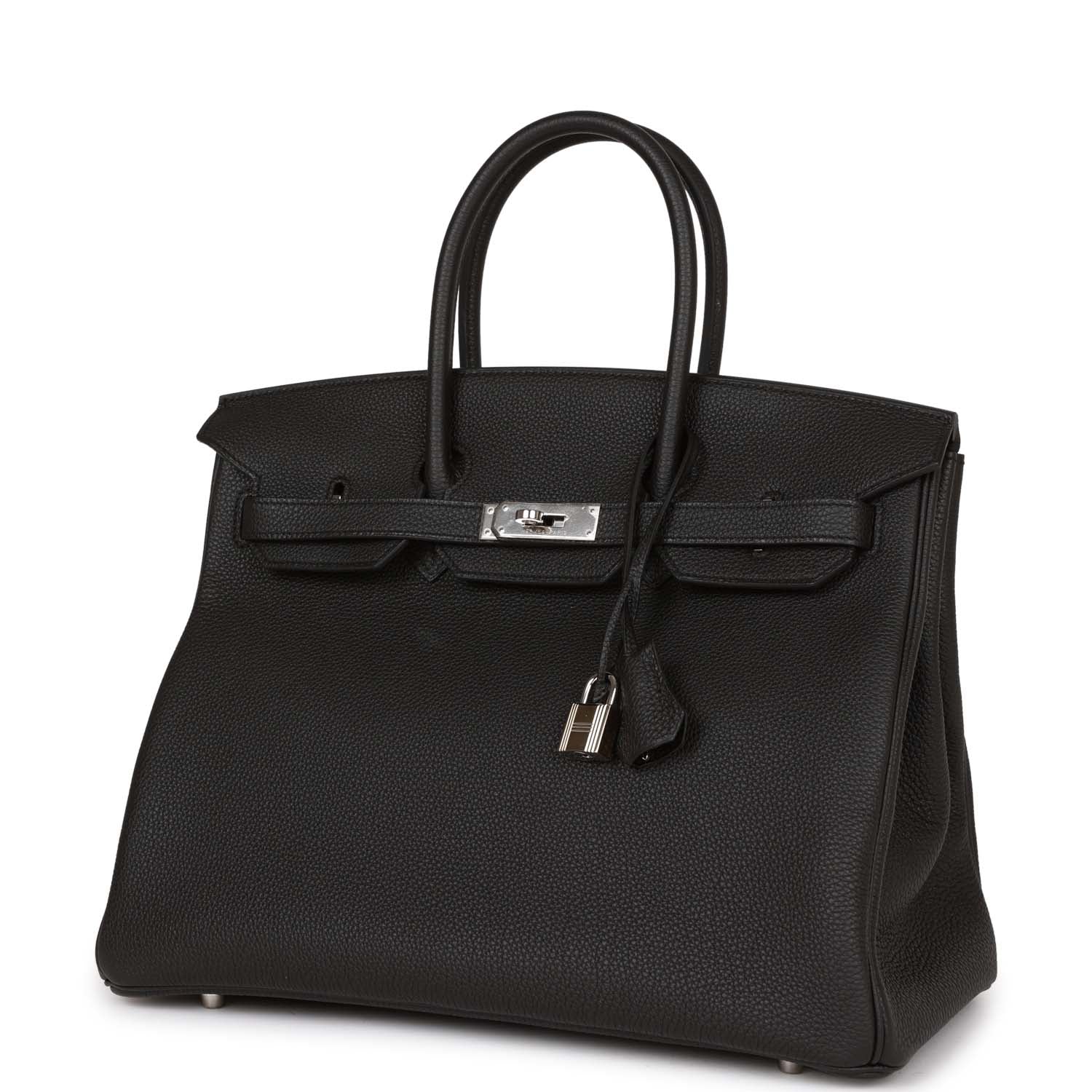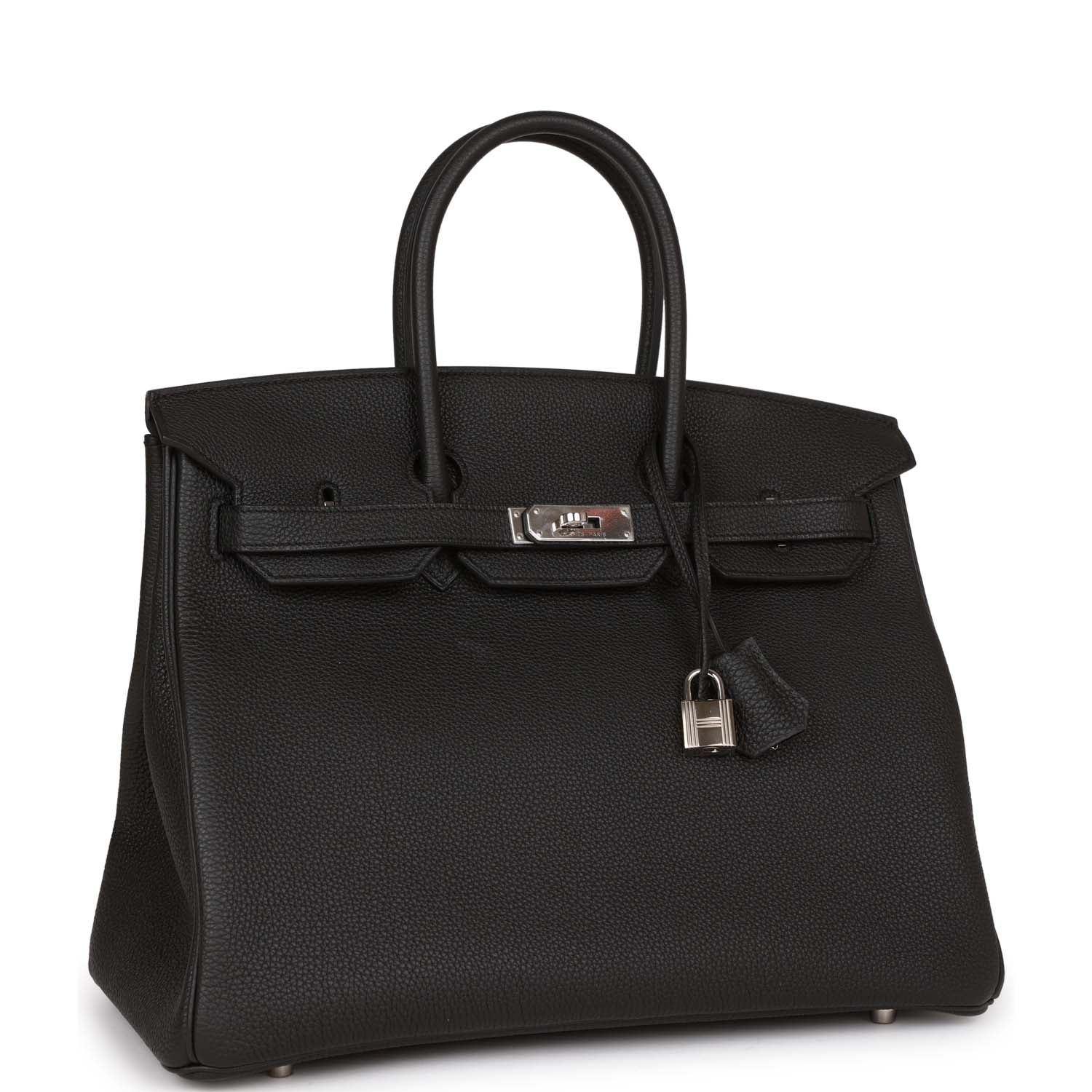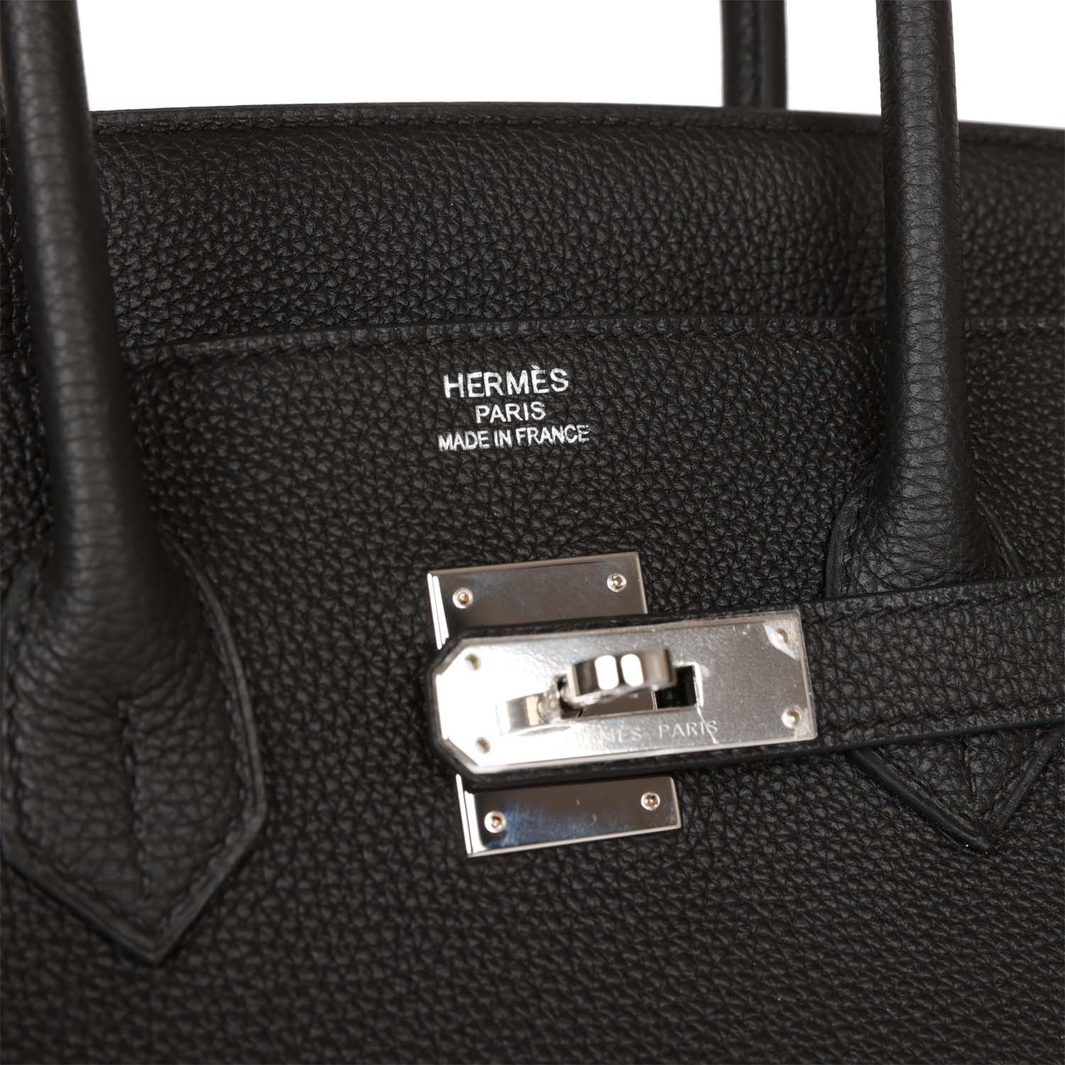 This Birkin is in black togo leather with palladium hardware and has tonal stitching, front flap, two straps with center toggle closure, clochette with lock and two keys, and double rolled handles.