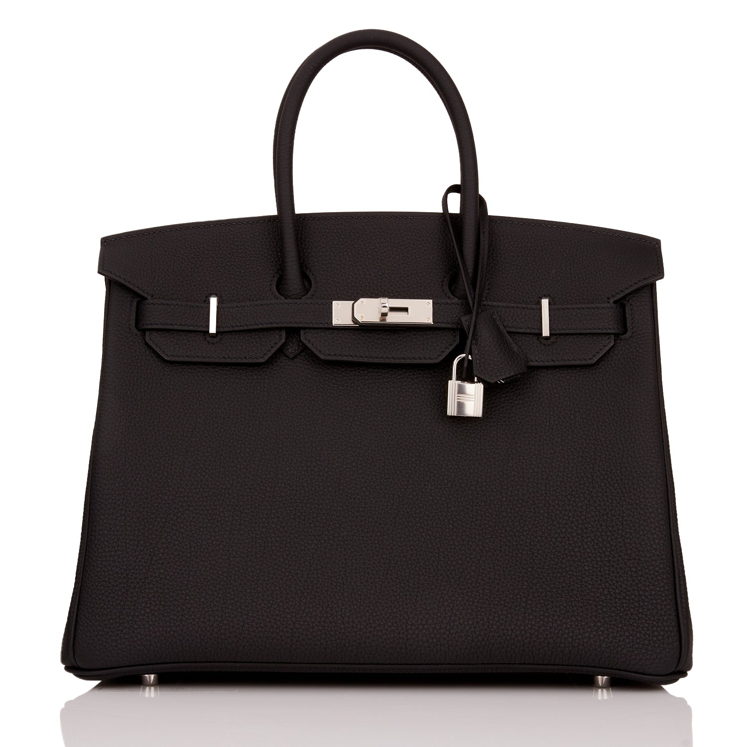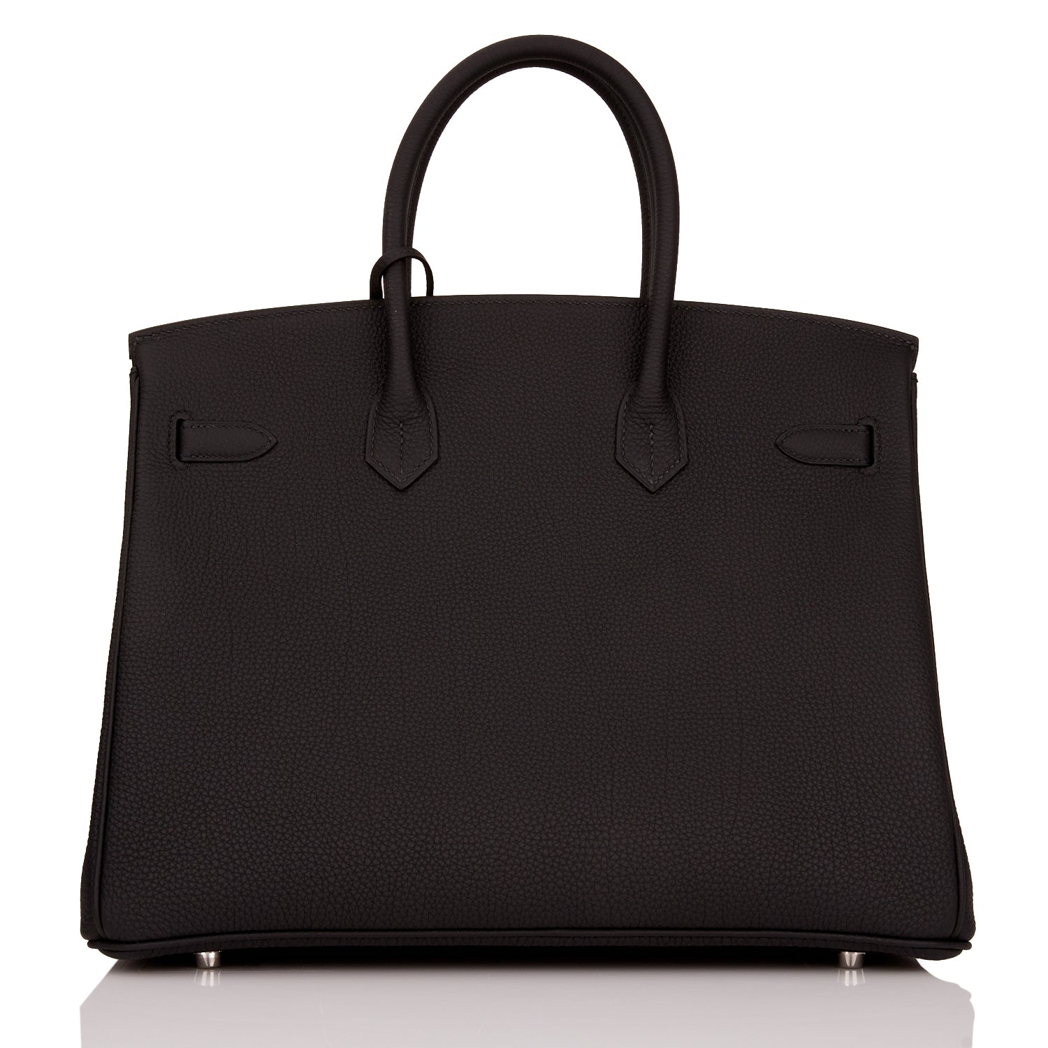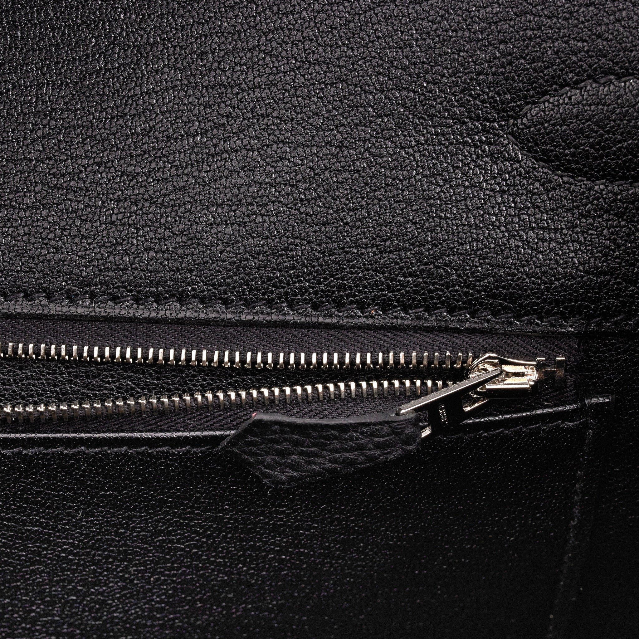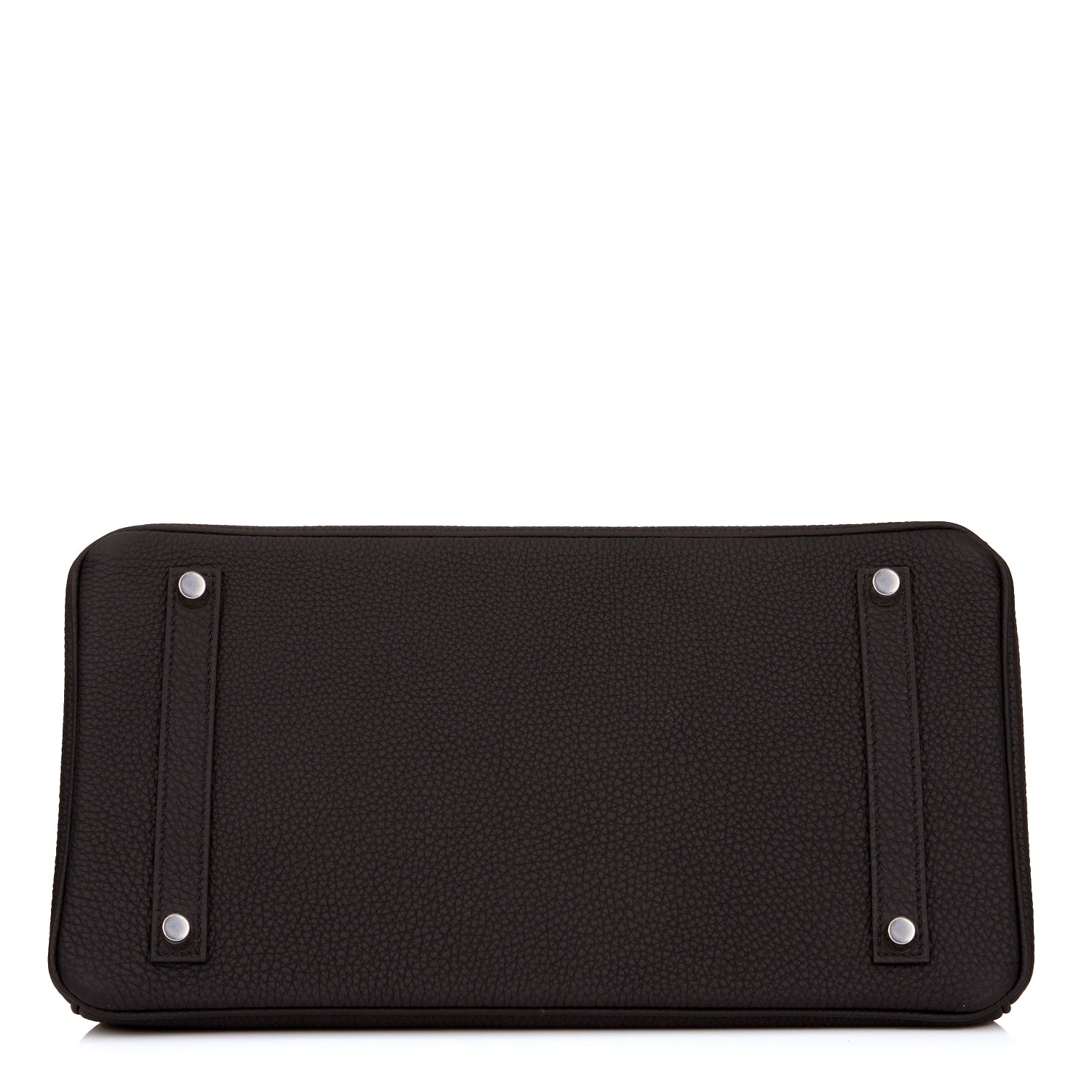 This Birkin is in Black togo leather with palladium hardware and has tonal stitching, front flap, two straps with center toggle closure, clochette with lock and two keys, and double rolled handles.