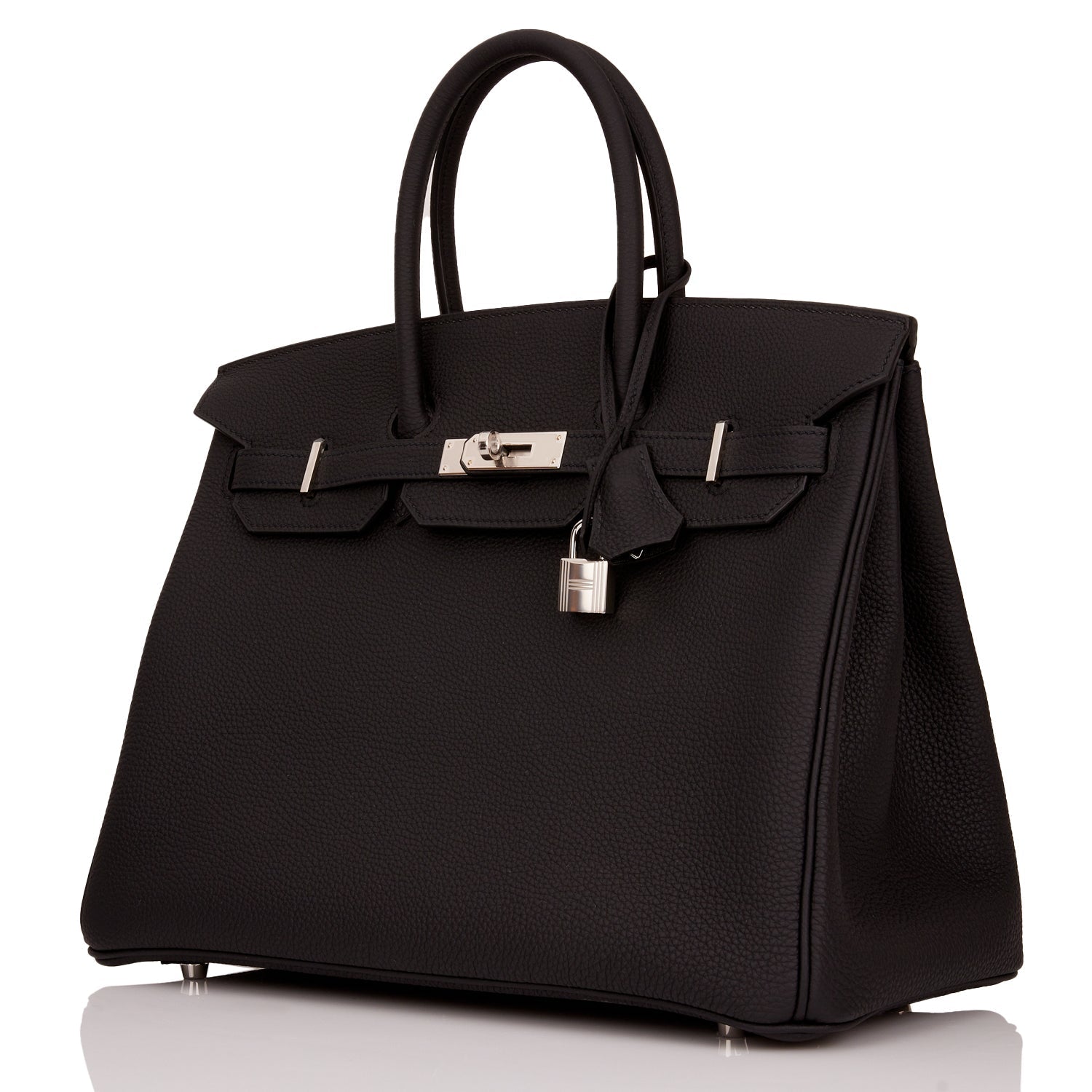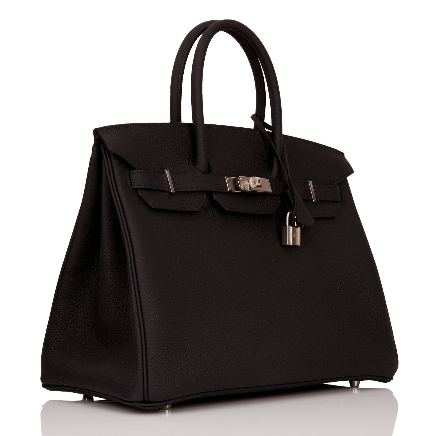 This Birkin is in Black togo leather with palladium hardware and has tonal stitching, front flap, two straps with center toggle closure, clochette with lock and two keys, and double rolled handles.