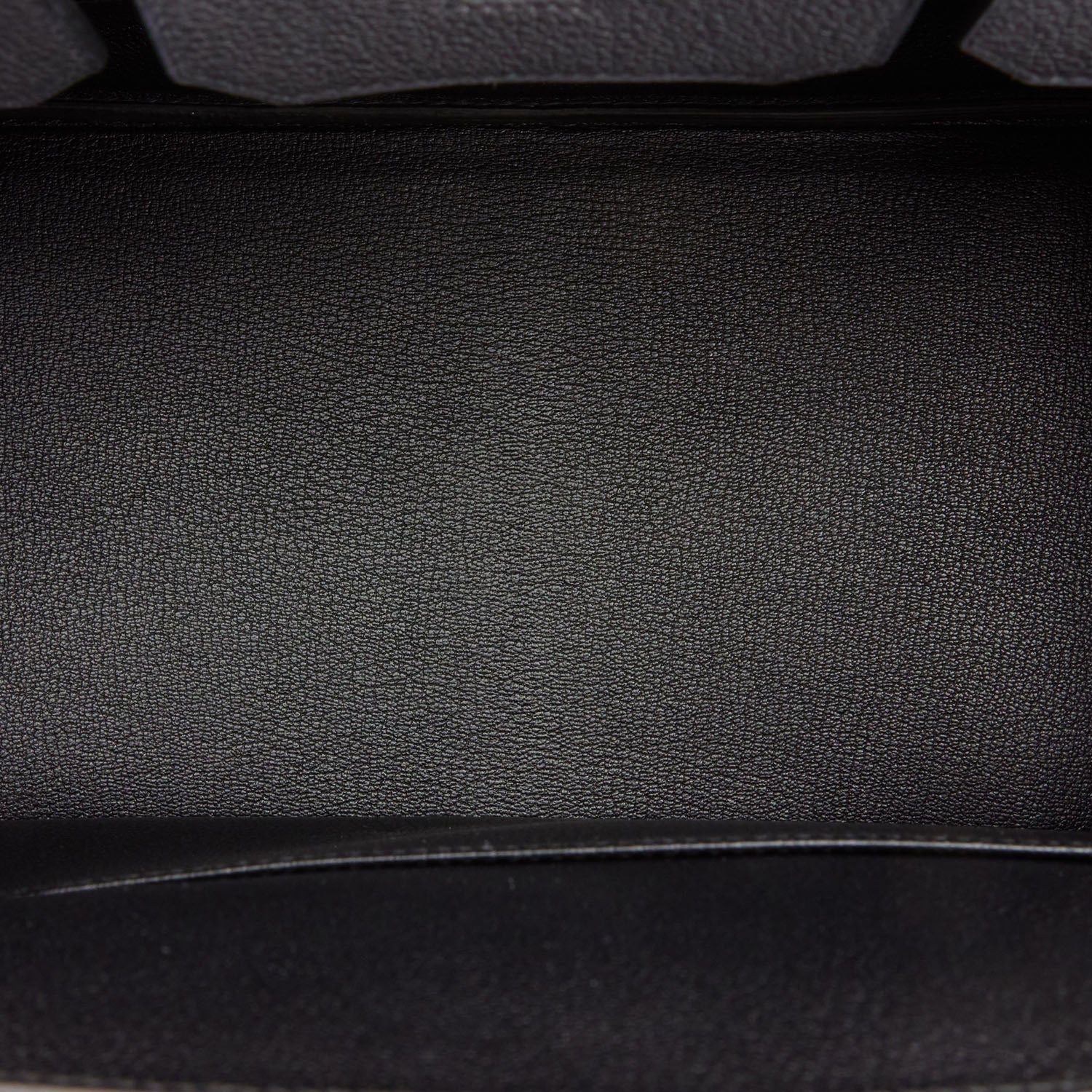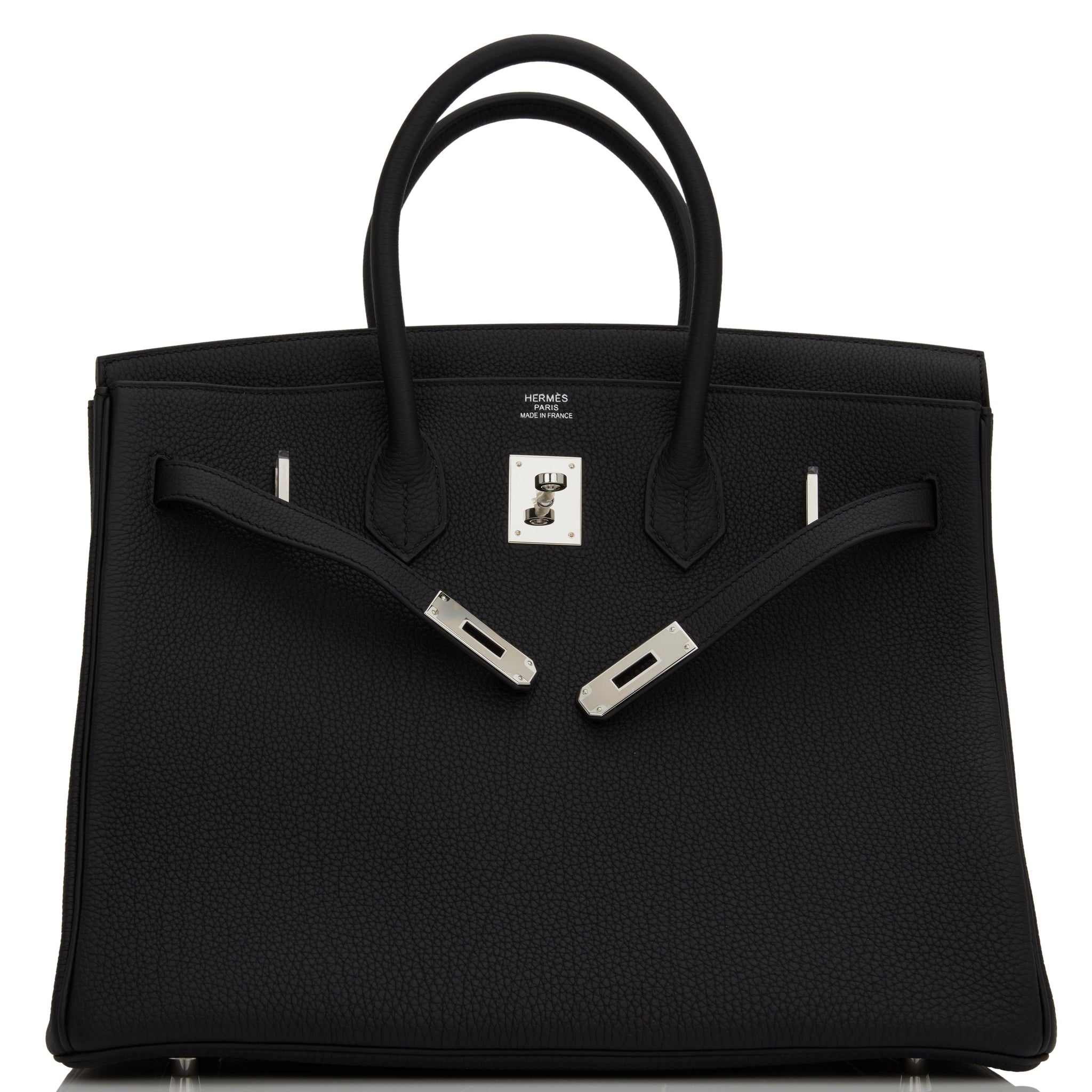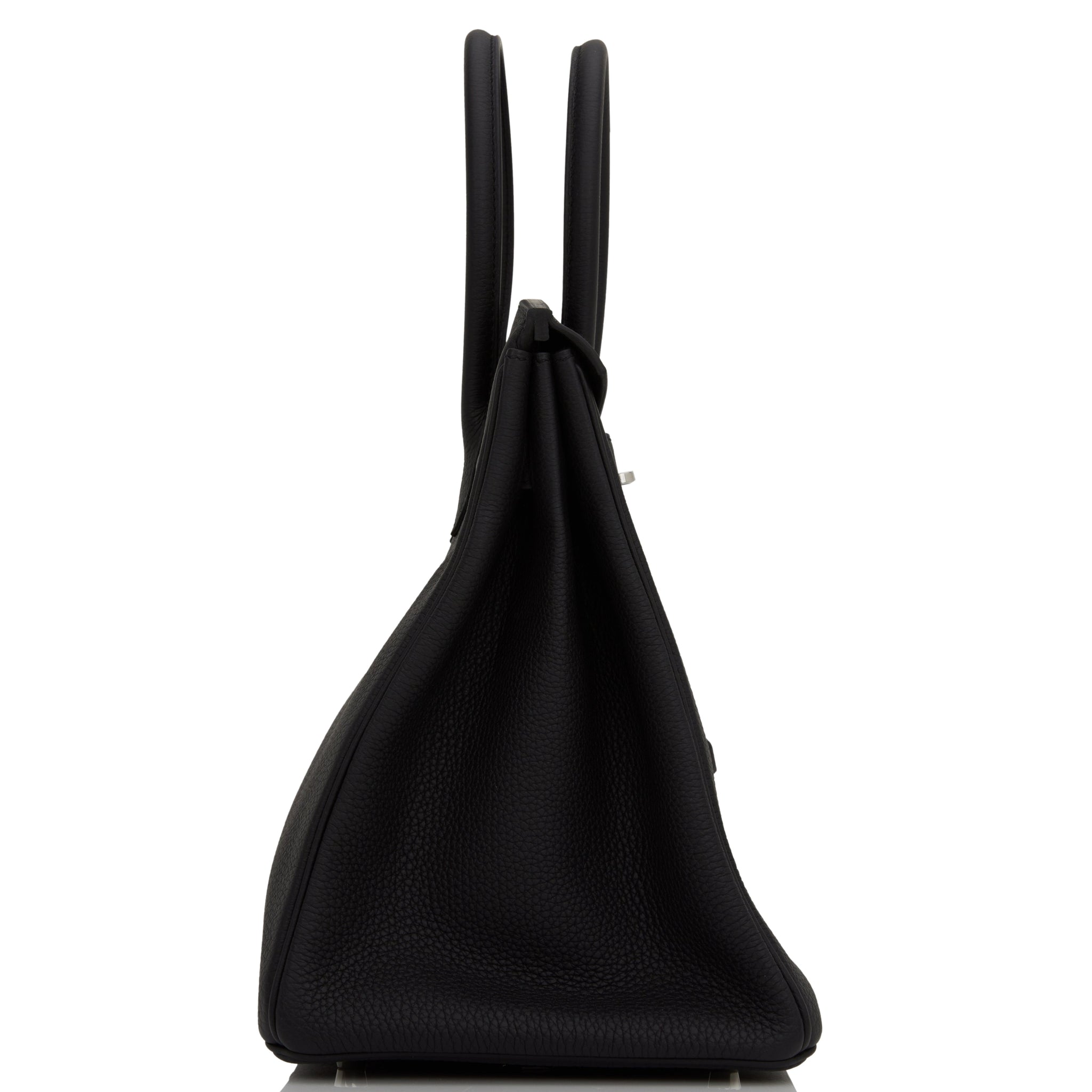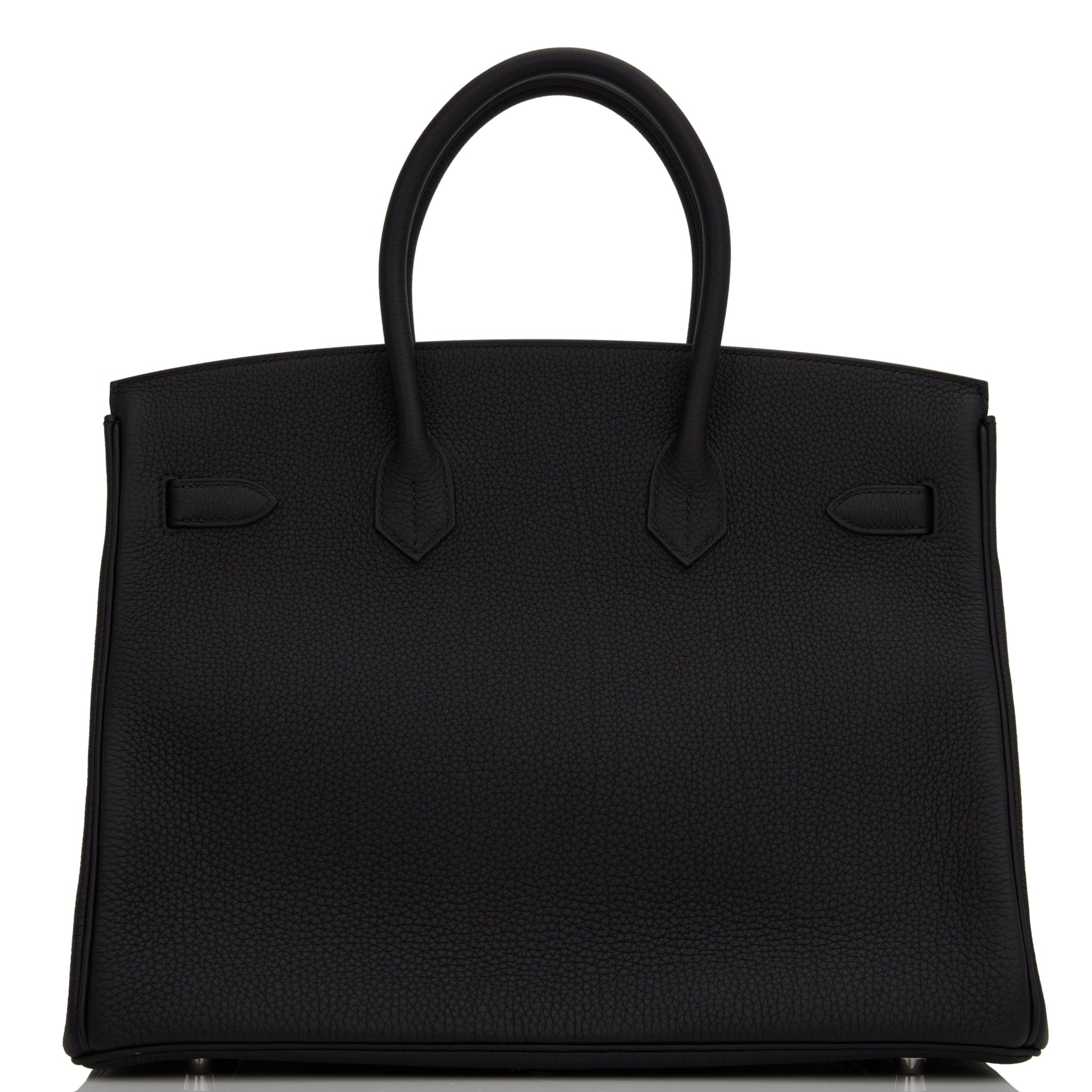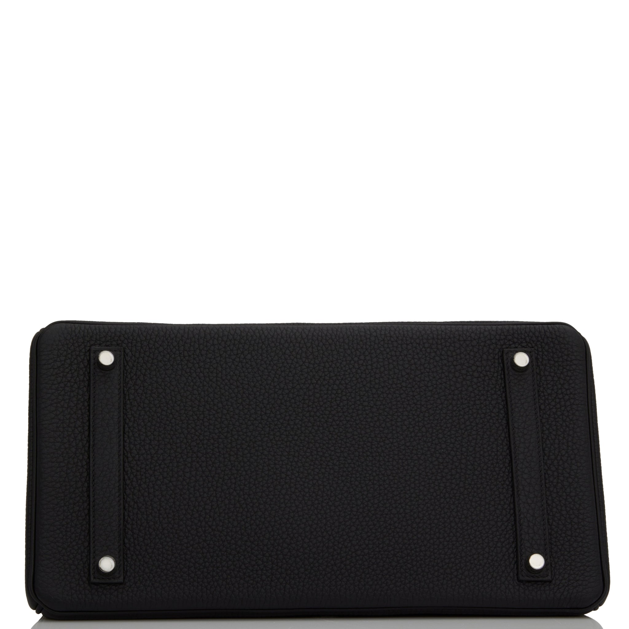 This Birkin is in Black togo leather with palladium hardware and has tonal stitching, front flap, two straps with center toggle closure, clochette with lock and two keys, and double rolled handles.