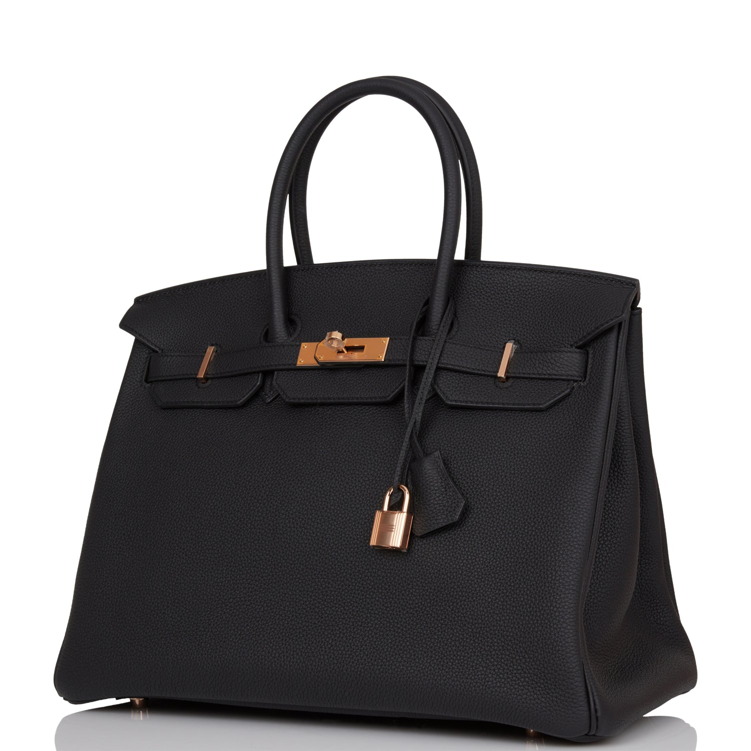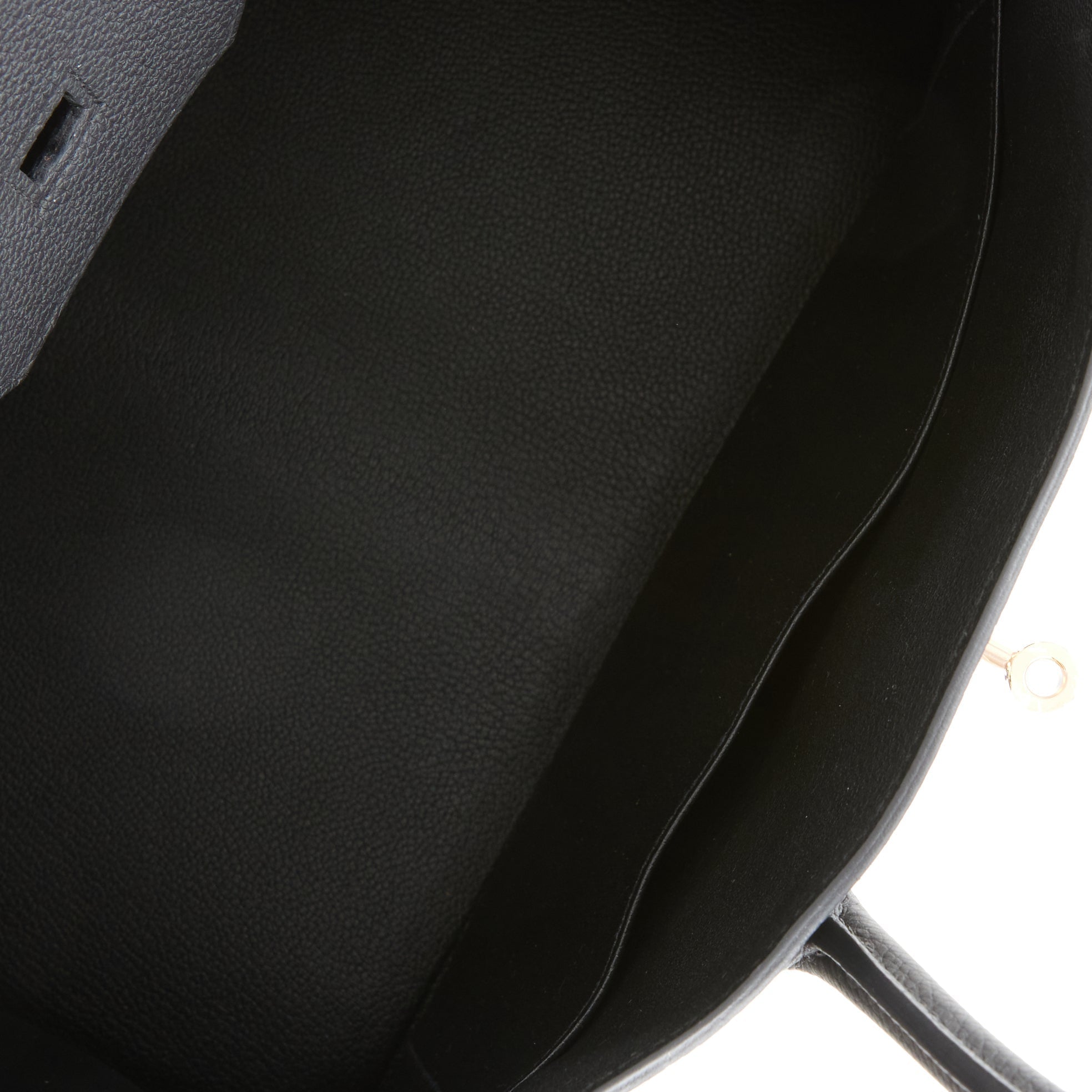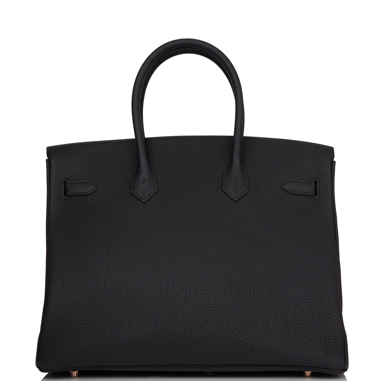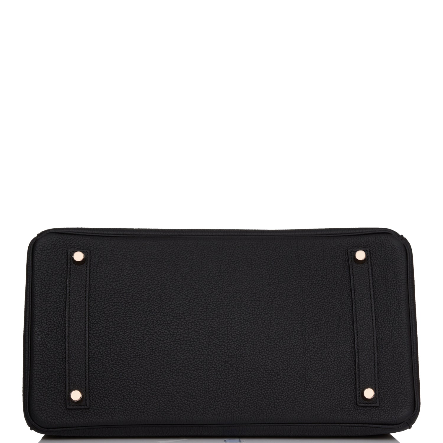 This Birkin is in Black togo leather with rose gold hardware and has tonal stitching, front flap, two straps with center toggle closure, clochette with lock and two keys, and double rolled handles.