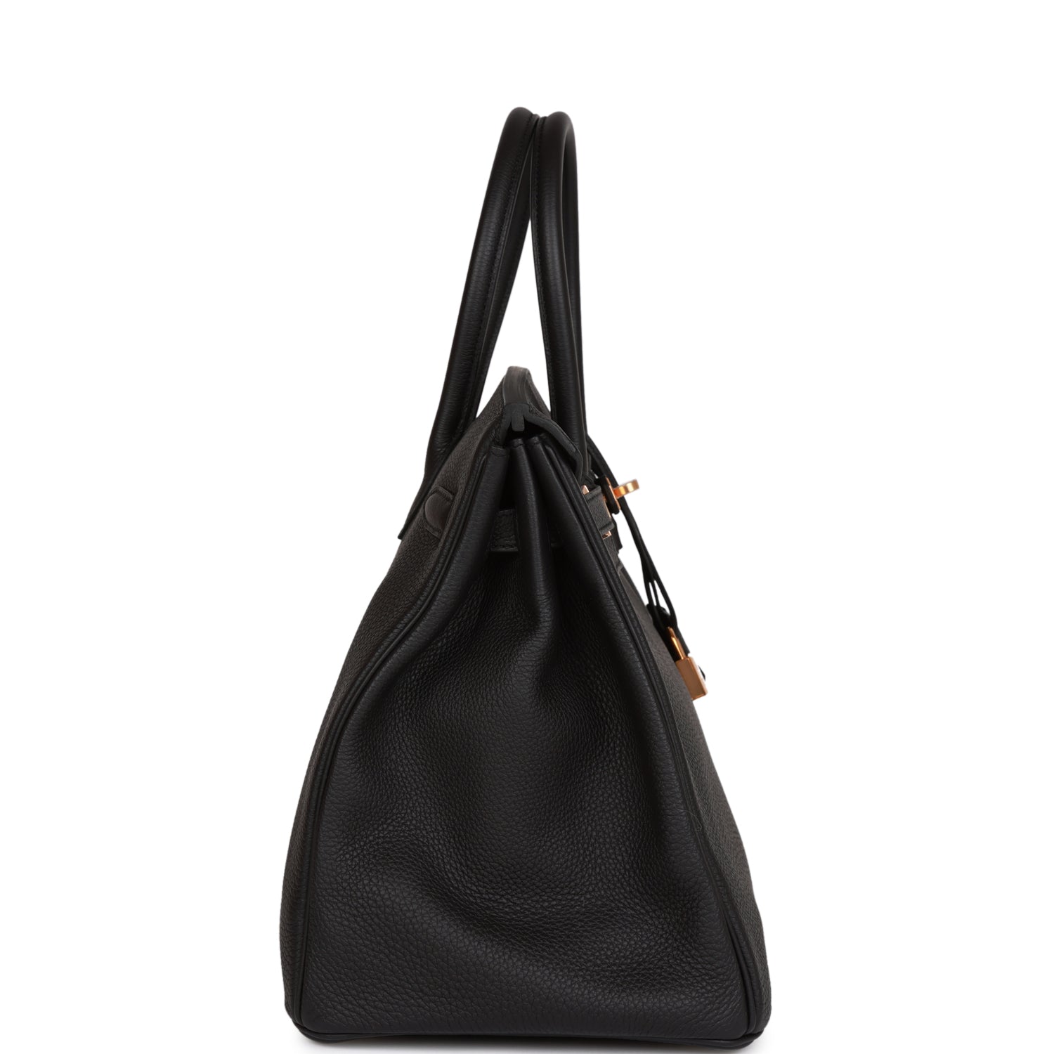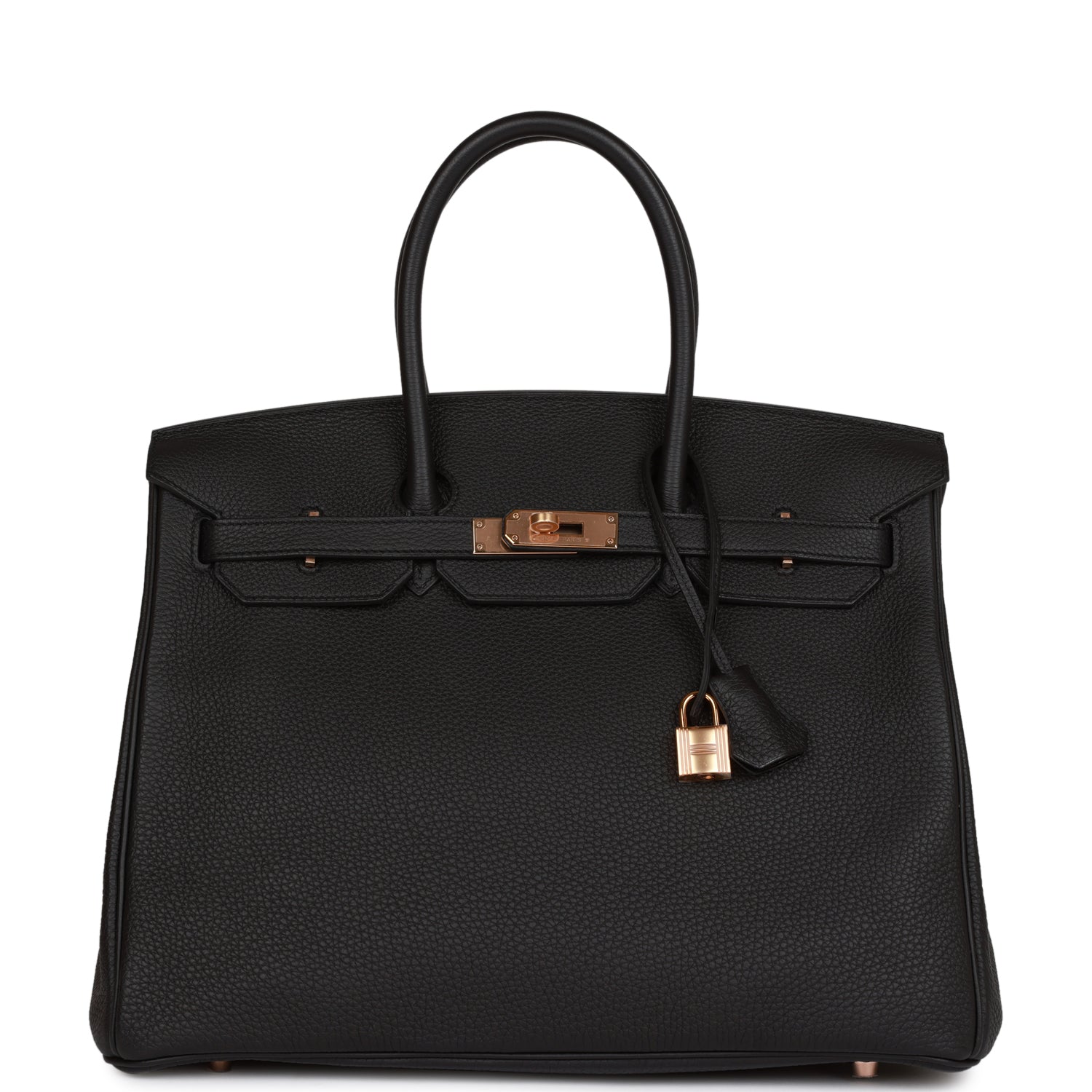 This Birkin is in Black togo leather with rose gold hardware and has tonal stitching, front flap, two straps with center toggle closure, clochette with lock and two keys, and double rolled handles.